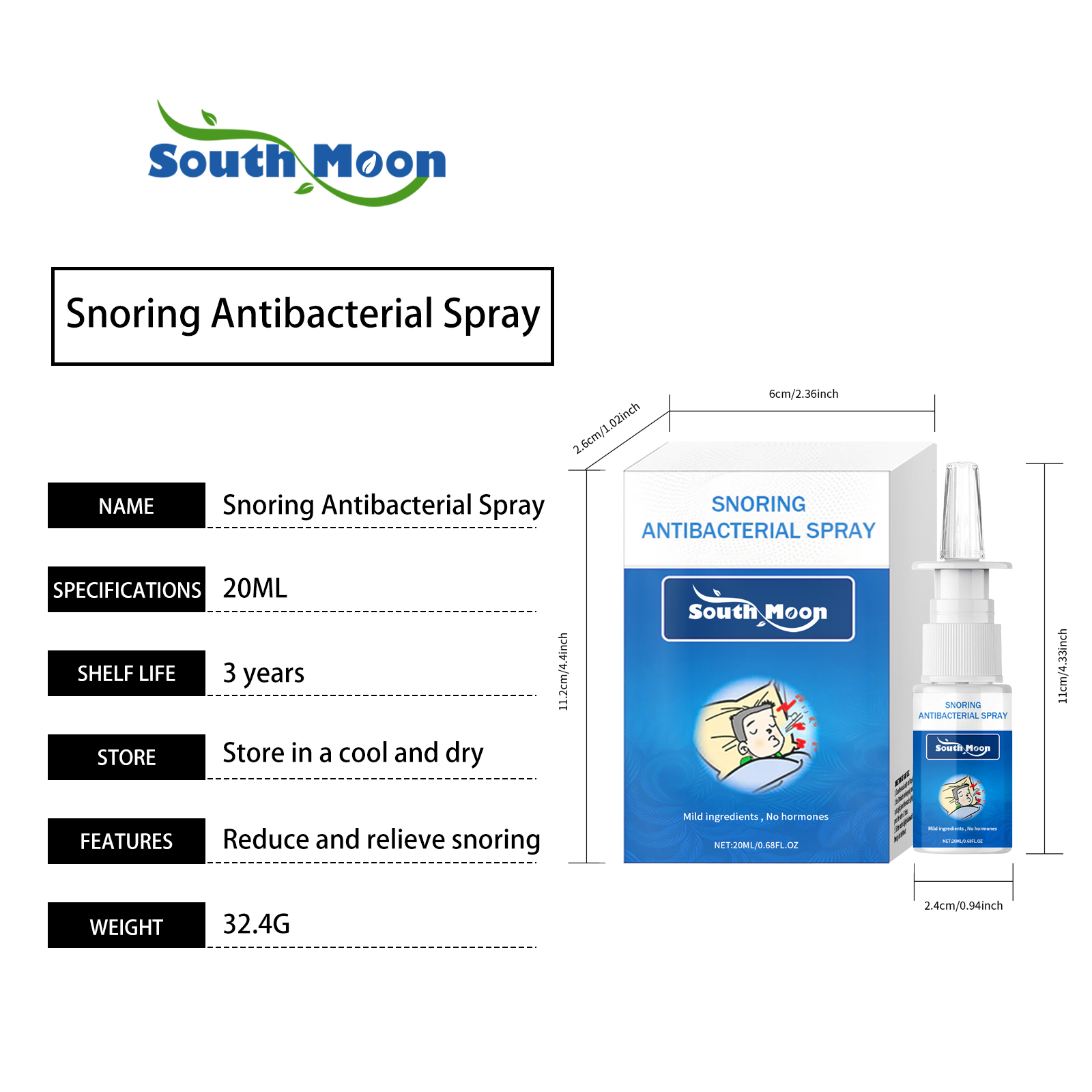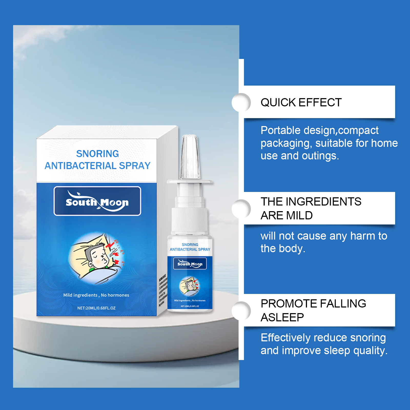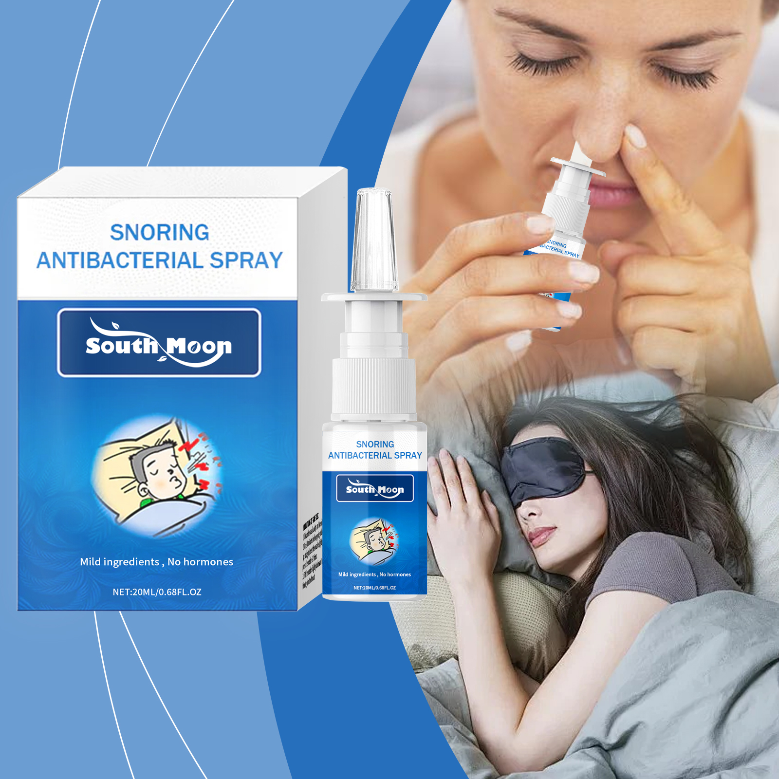 Our Snore spray contains propolis extract, honeysuckle extract and chamomile extract. It can help reduce the intensity and frequency of snoring, help open up the nasal passages and promote air circulation. Soothes and moisturizes nasal tissue, promoting calm and uninterrupted sleep. Its use method is very simple: 1. Clean the nasal cavity, keep the nasal cavity dry; 2. Use 30 minutes before bed. To use, stand up straight, gently insert the nozzle into the nostril, press 1-2 times; 3. Tilt the nozzle slightly back to prevent liquid from flowing into the throat. Immediately feel refreshing after use, the effect is remarkable. Comfortable overnight, lasting to maintain sleep effect.
