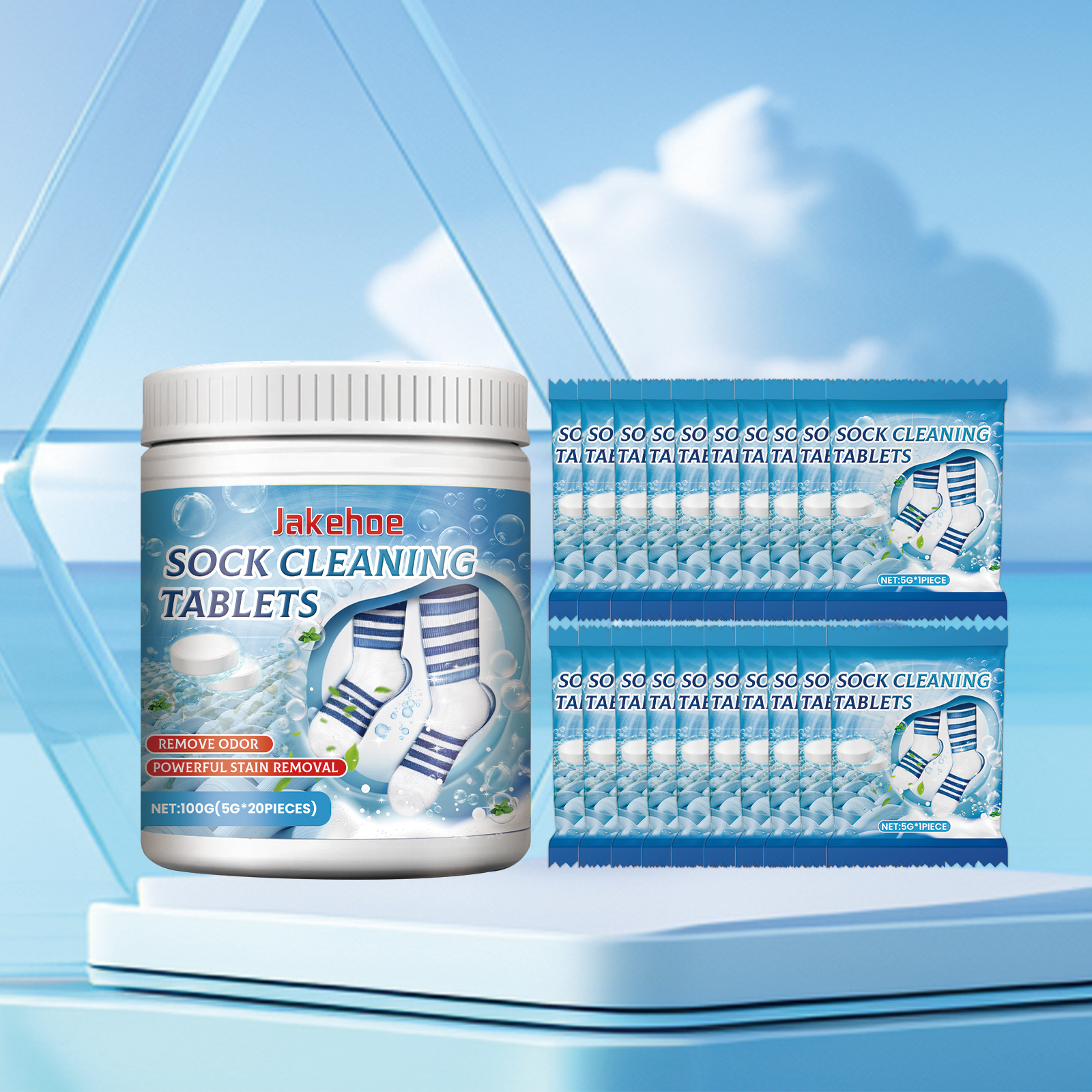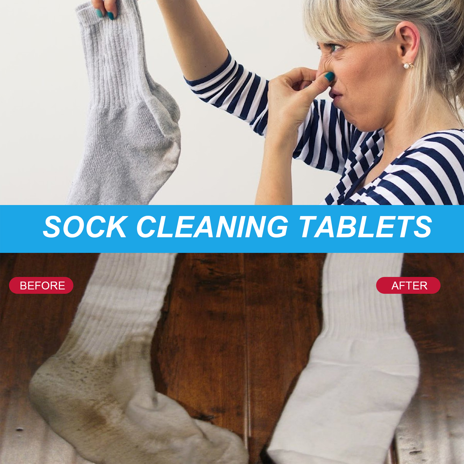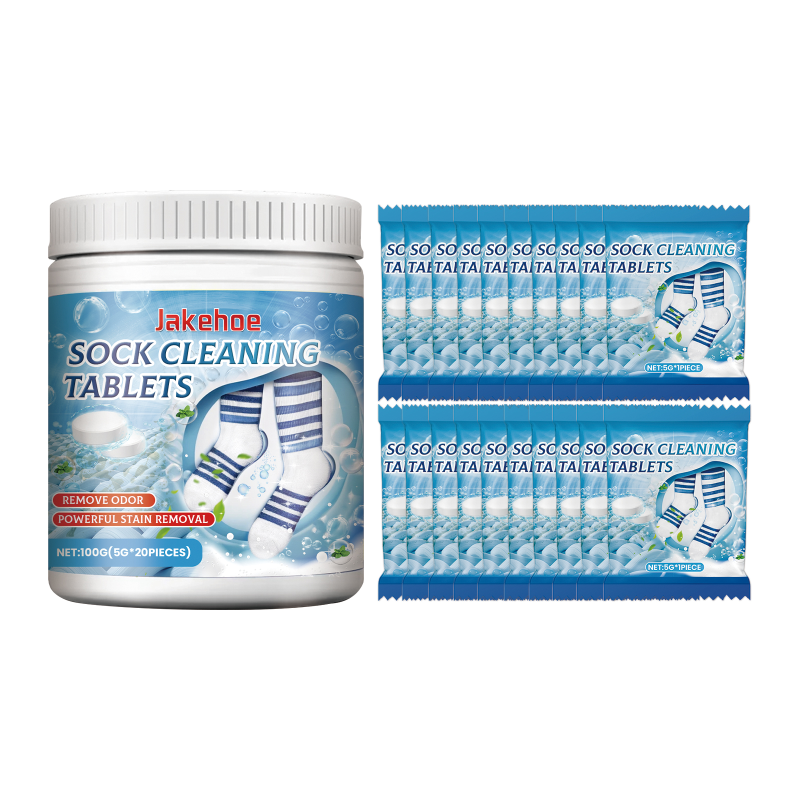 Our sock cleaning tablets contain sodium bicarbonate and citric acid. It can effectively remove stains and has a long-lasting antibacterial effect, leaving socks clean and tidy. Clean socks are soft and comfortable, and more comfortable to wear. The way to use it is simple: you can fill a basin with water and put dish washing tablets in it to dissolve it. Once dissolved, put the sock in and soak for 5 minutes. Finally, scrub the socks with your hands. It has a lemon scent that will remove the smell of socks. The socks have a faint smell after washing.
