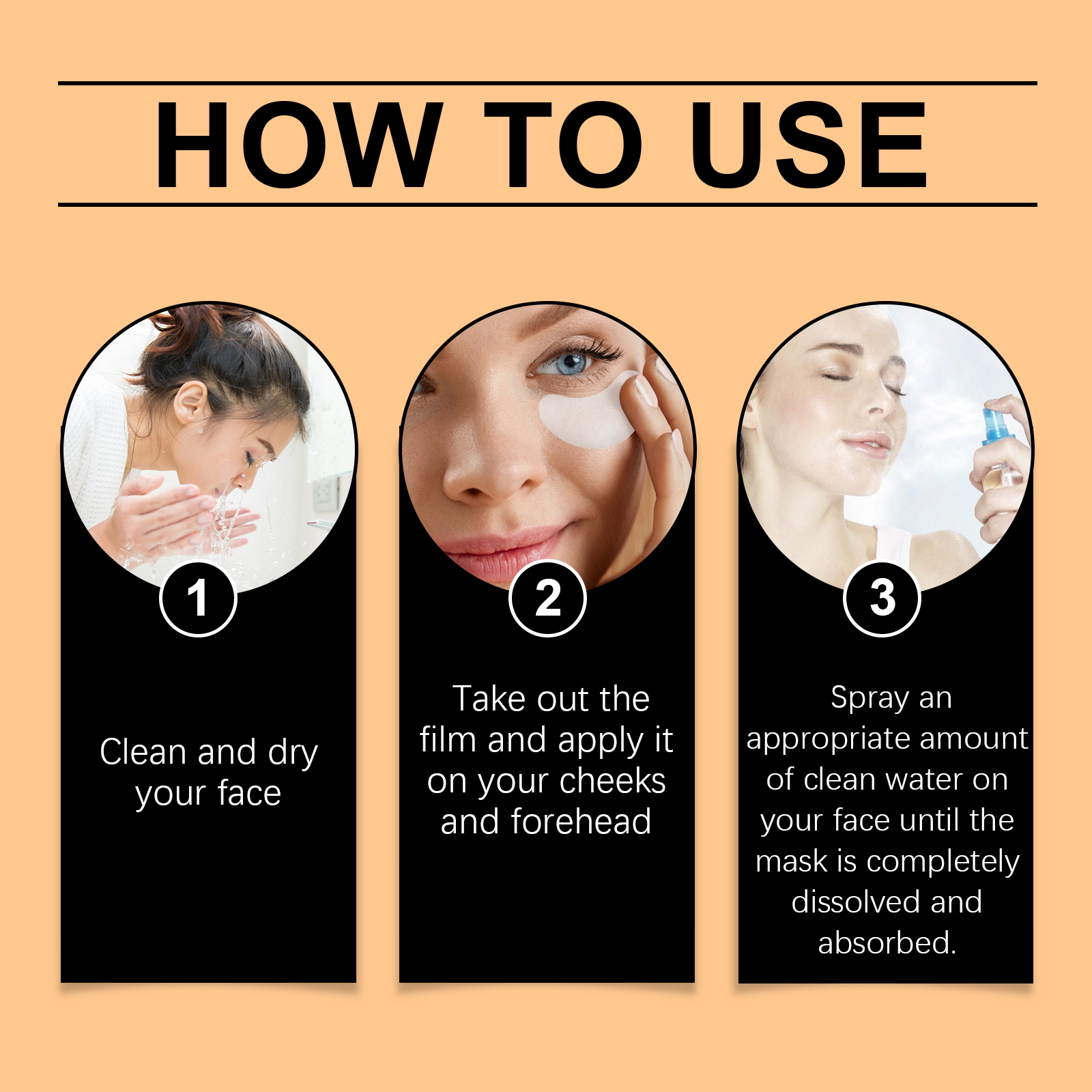 Our solable proprotein membrane contains niacinamide and tocopherol. It reduces fine lines and wrinkles and makes the skin smoother. The way to use it is very simple: clean and dry, remove the film, apply to the cheeks and forehead, spray the right amount of cleaning water on the face until the mask is completely dissolved and absorbed. And can lock in moisture for a long time, nourish every inch of the skin.