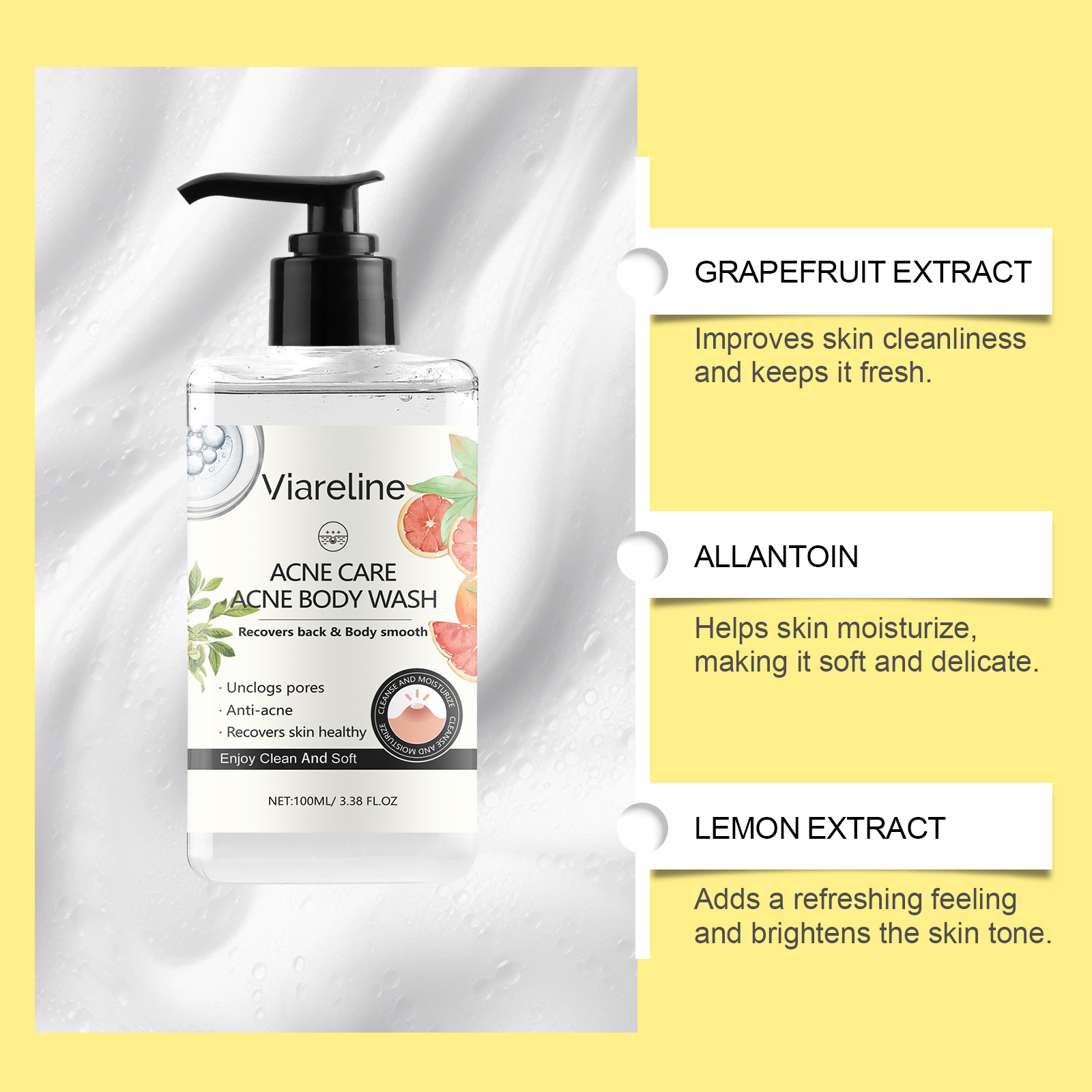 Our soothing Repair body wash contains glycerin and grapefruit extract. It can effectively cleanse the skin and keep pores clean and healthy. Helps to reduce excess oil and maintain a refreshing touch. Its use is simple: thoroughly wet the body with warm water. Apply appropriate amount of this product to your hands and knead until lather. Apply the foam to your body and massage for 2-3 minutes. Wash it off with warm water. And can deep clean, keep pores clean.