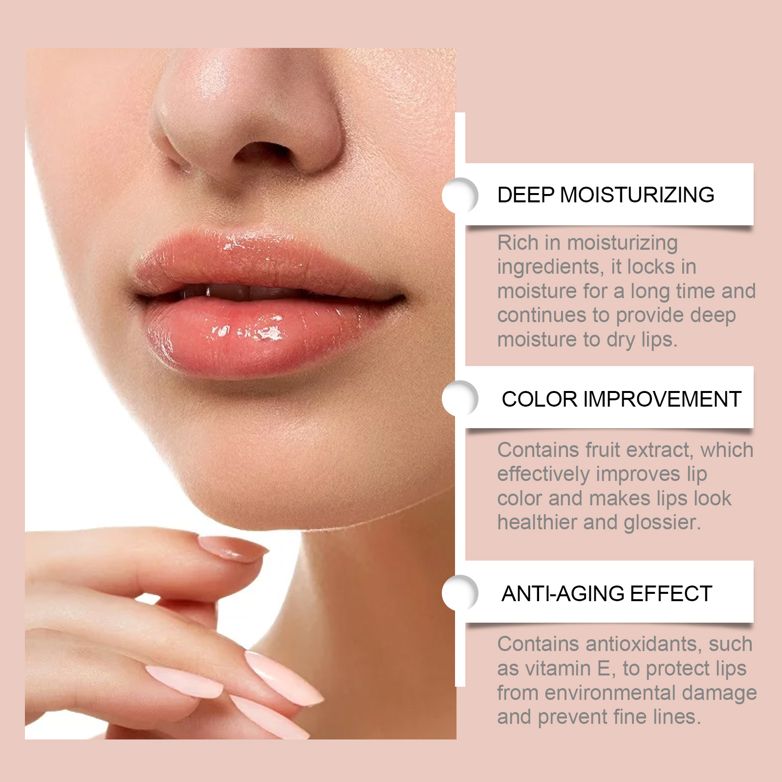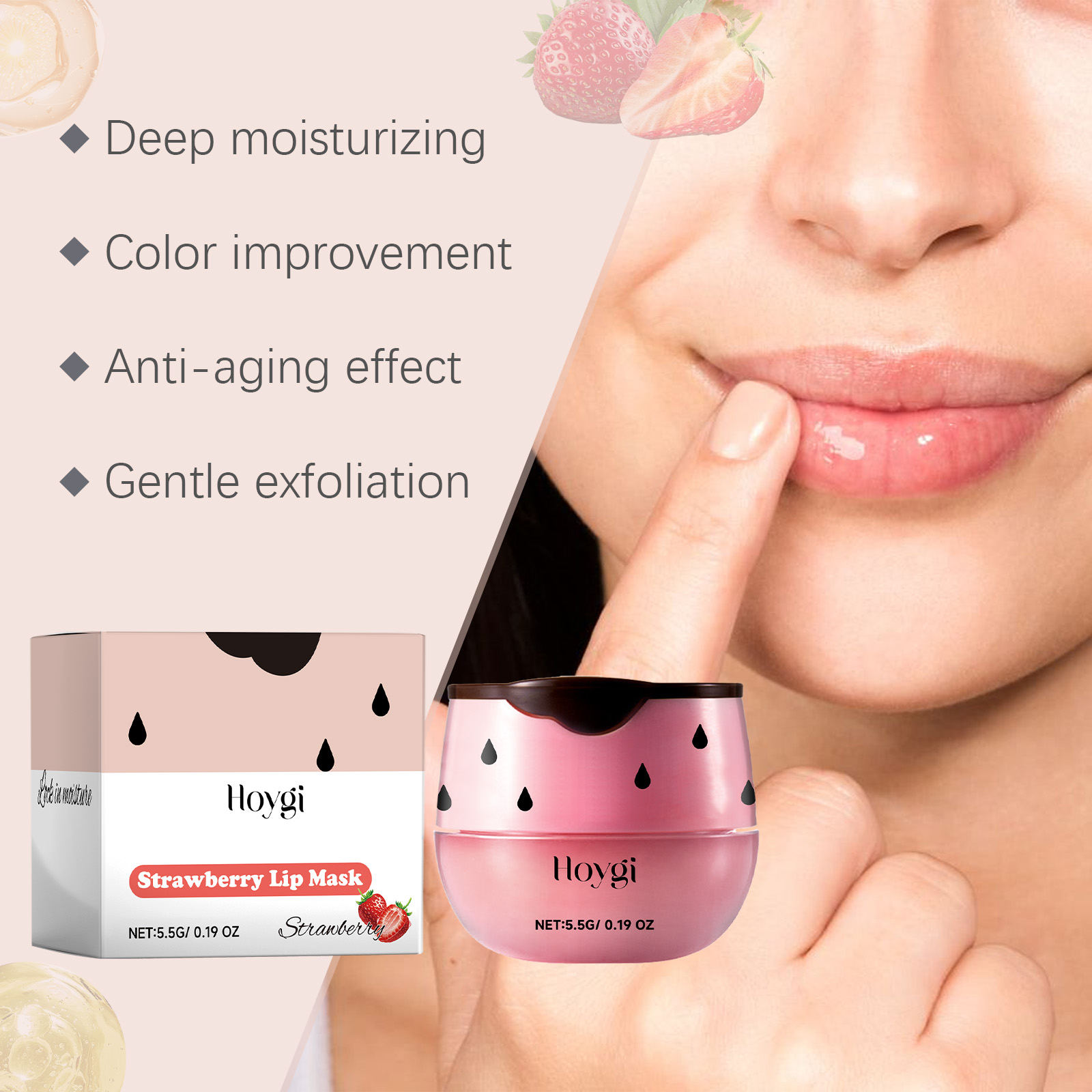 Our strawberry lip mask contains strawberry fruit extract, vitamin E. It protects your lips from environmental damage and prevents fine lines. Its use method is very simple: thoroughly clean the lip skin dry, take an appropriate amount of lip mask, evenly apply to the lip skin. And can be gentle, remove dead skin cells, restore smooth lip texture.