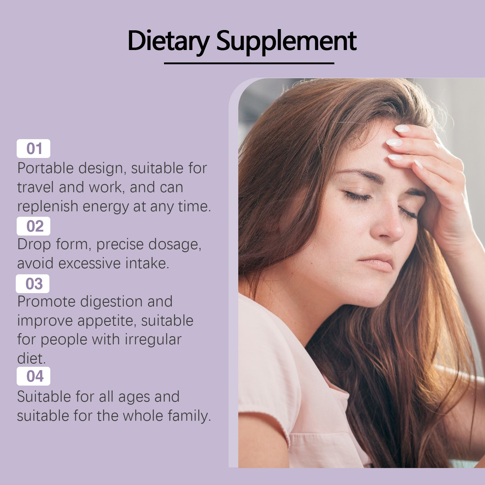 Our supplement drops contain potassium sorbate and mint leaf extract. It hydrates quickly, directly to what you need. The way to use it is simple: Shake it well before serving, 1-2 drops at a time. And can promote digestion and improve appetite, suitable for people with irregular diets.