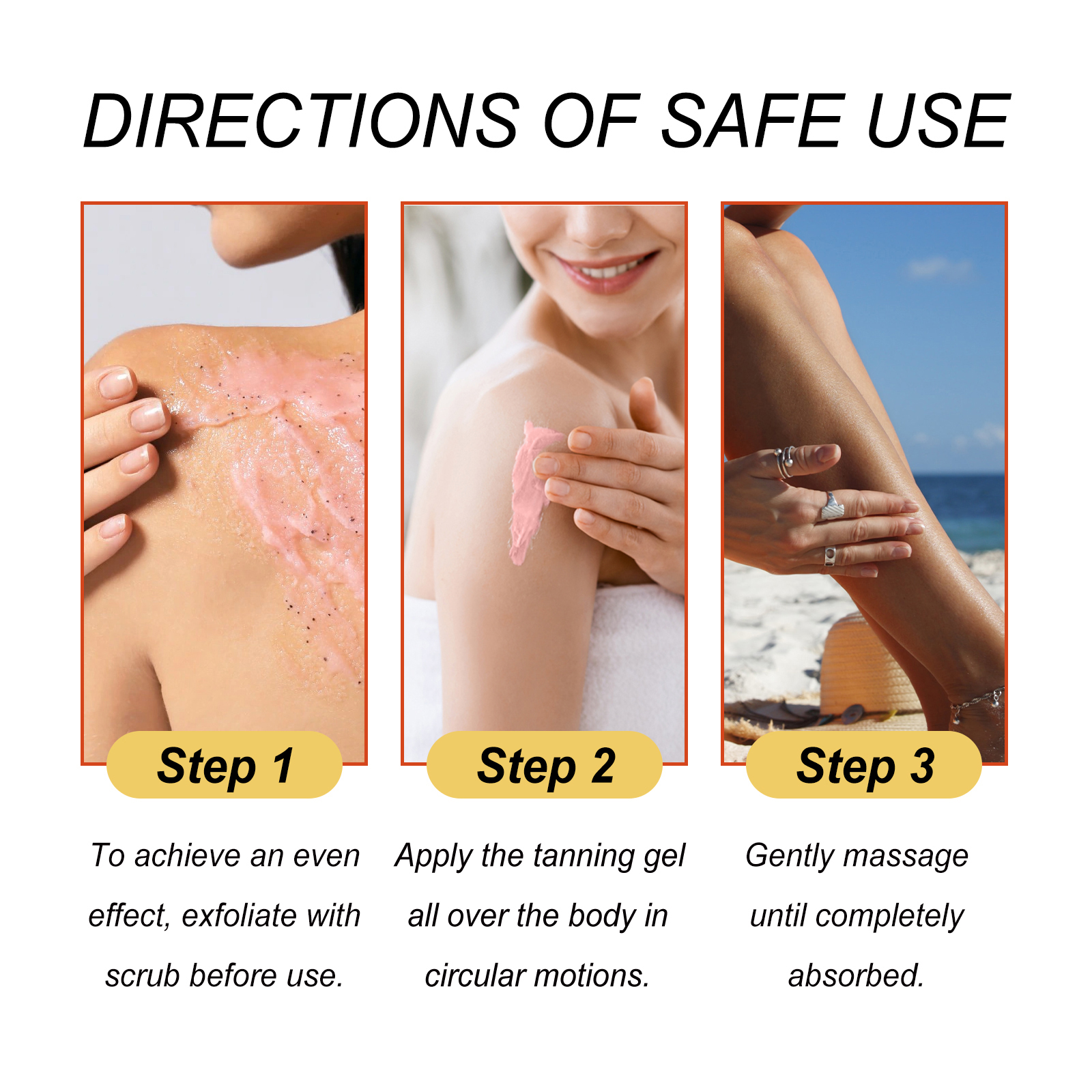 Our Intensive Tanning Gel contains Butyrospermum Parkii (Shea Butter) Oil, Daucus Carota Sativa (Carrot) Seed Oil, Cocos Nucifera (Coconut) Oil. It speeds up the tanning process, gives you a healthy tan, makes you more confident and beautiful, deeply moisturizes the skin, and makes the skin firmer and more moisturized. Its application method is very simple: in order to achieve an even tanning effect, exfoliate the whole body in the scrub before use, and then gently massage the appropriate amount of this product until it is completely absorbed. You can use this product on balconies, lawns, swimming pools, beaches and other sunny places to speed up your skin tanning.