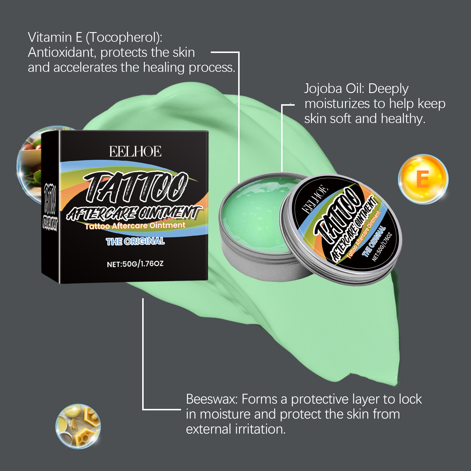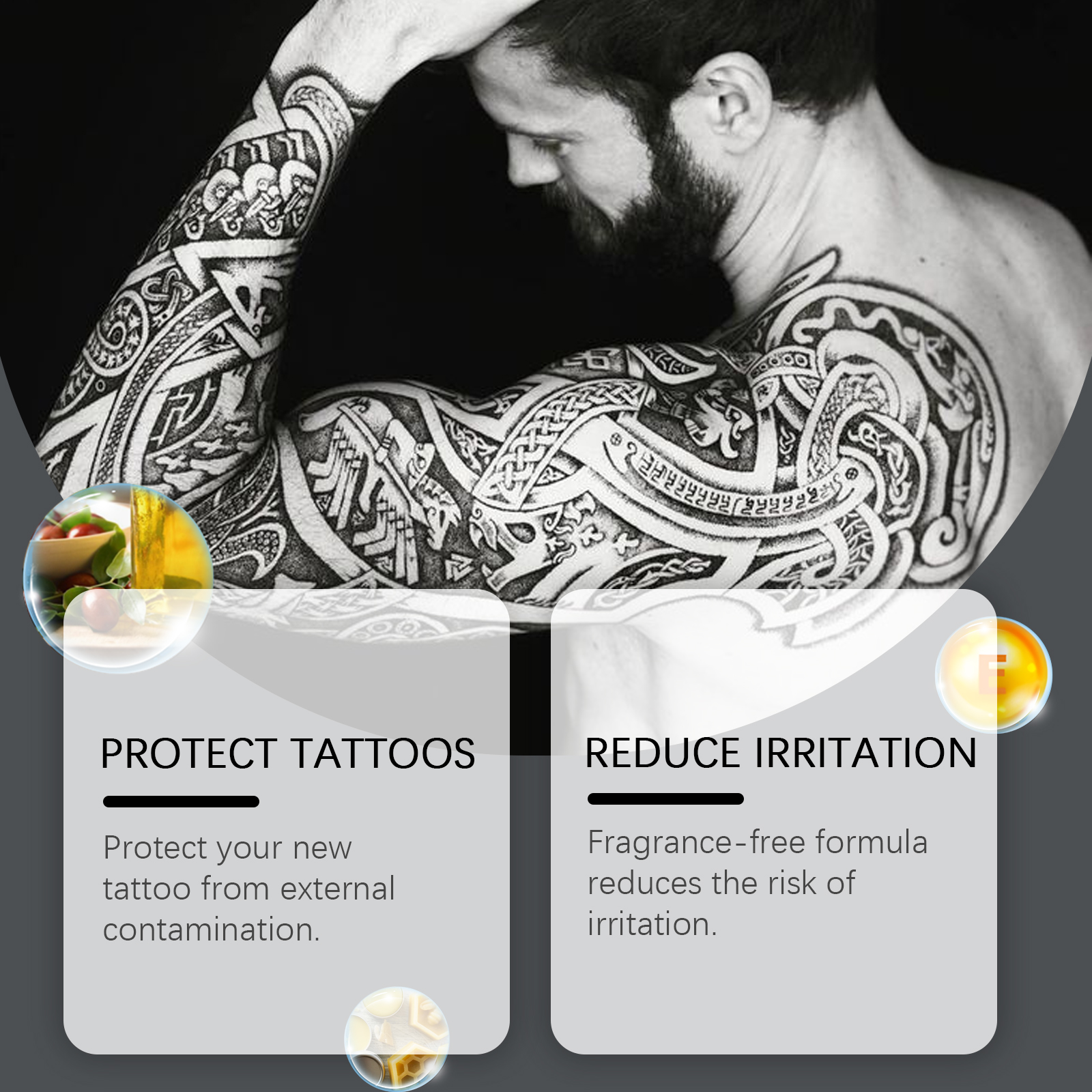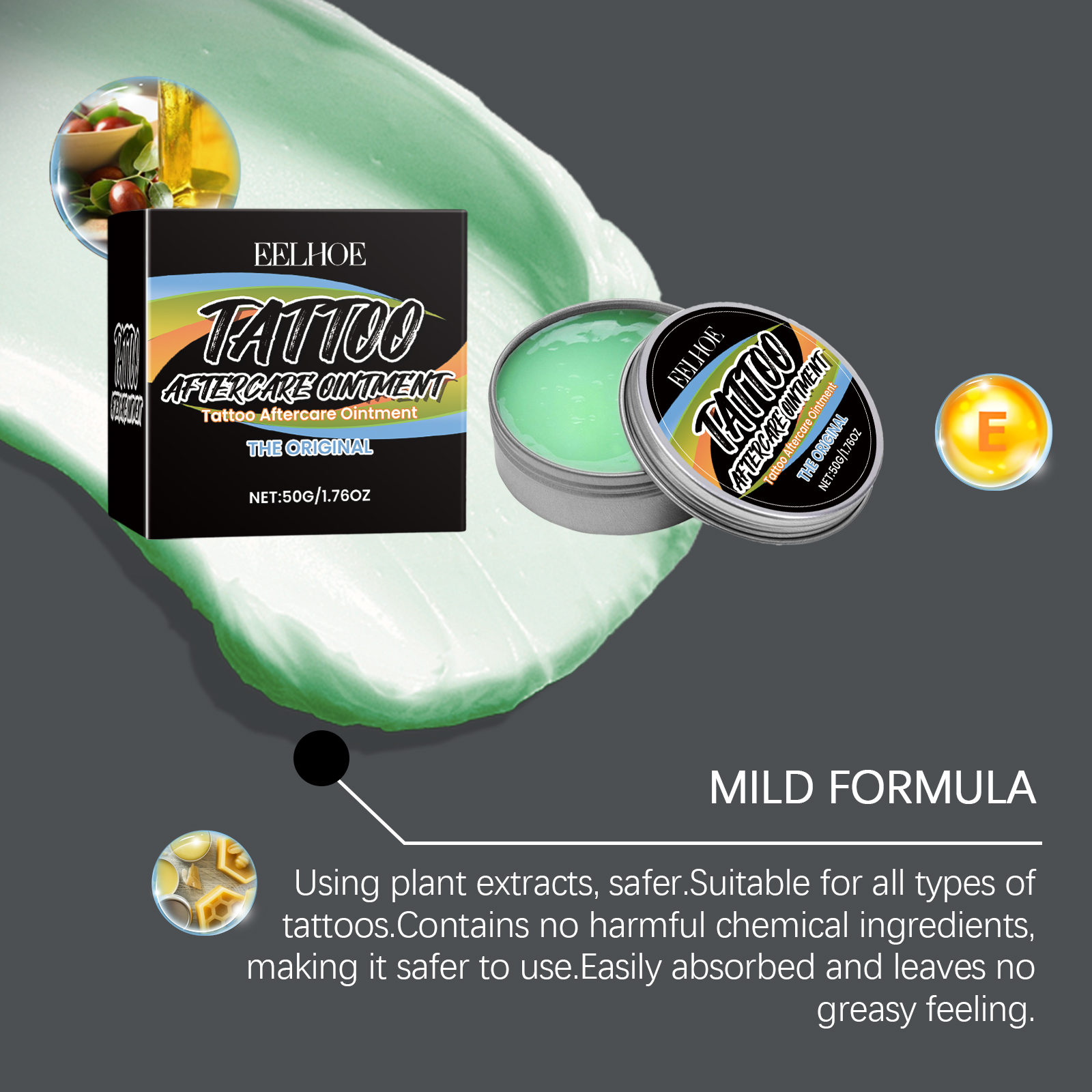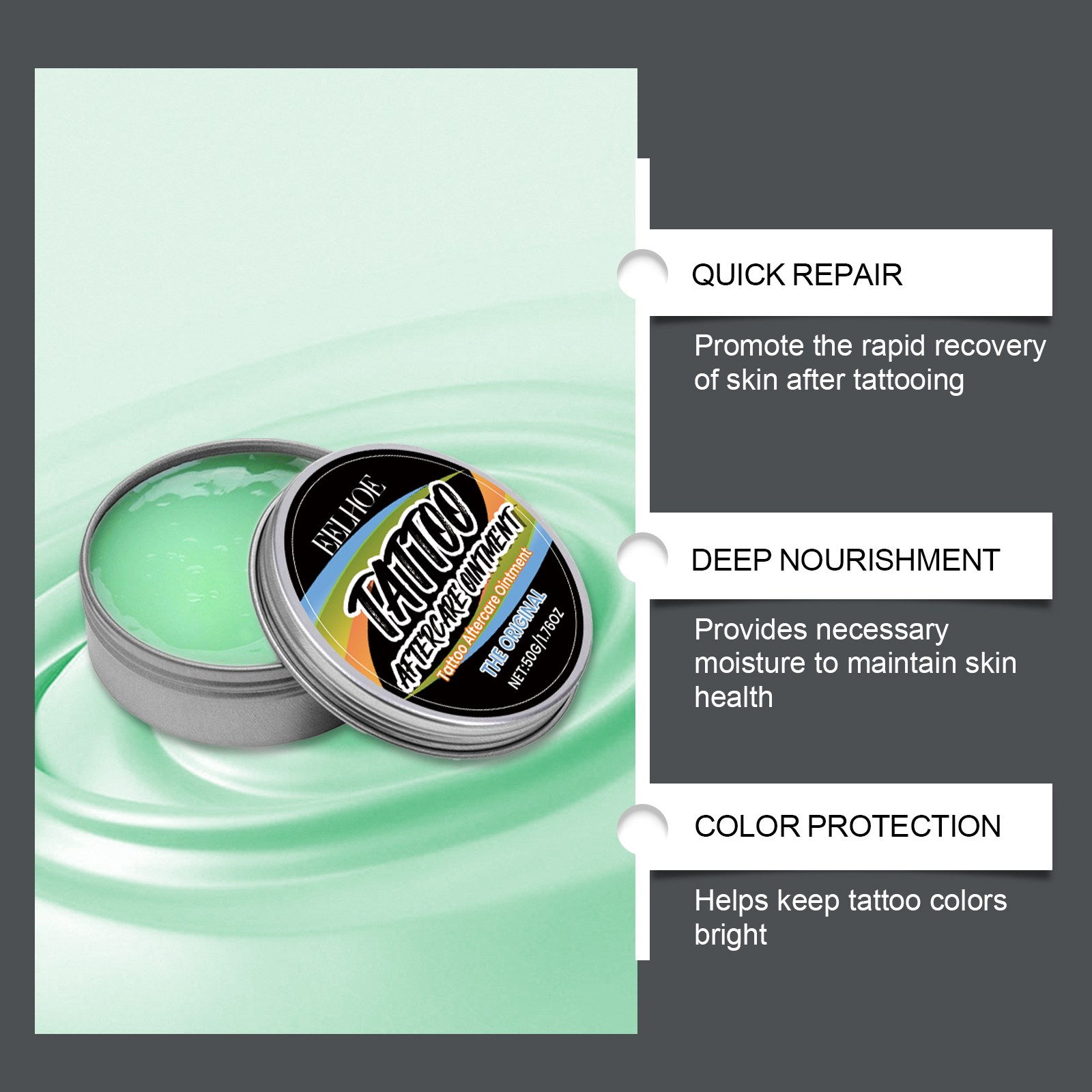 Our tattoo cream contains microcrystalline wax, tocopherol (vitamin E), glycerin. It protects your new tattoo from outside contamination. The fragrance-free formula reduces the risk of irritation. Its use method is very simple: wash your hands and the skin of the tattoo area to take an appropriate amount of tattoo care cream, evenly apply it to the tattoo area, and evenly apply it, it can be used multiple times according to the tattoo situation. And can enhance skin barrier function. Long-term moisturizing prevents dry skin and helps reduce itching and discomfort.