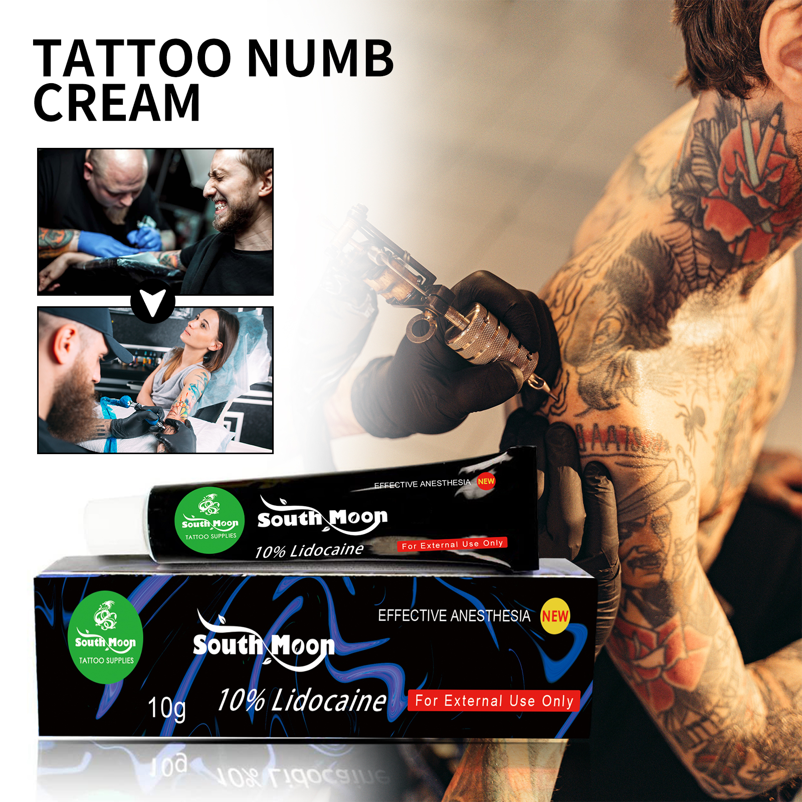 Our Tattoo Numb Cream contains Jojoba oil, vitamin e, beeswax. It can reduce swelling, promote tattoo healing, repair and moisturize the skin. Its application is simple: wash the specific area with soap and pat it dry, apply a thick layer of the product with a smearing spoon, cover with plastic wrap, apply pressure and hold for 30-35 minutes (fully hold for about 45 minutes). Pat dry with paper towel or soft cloth before applying. Reduce tattoo pain, repair and fade tattoo marks.