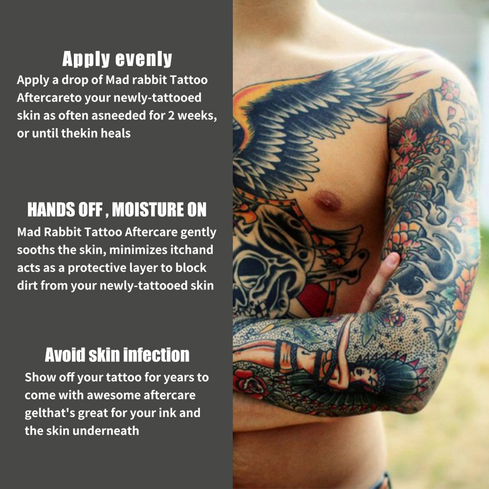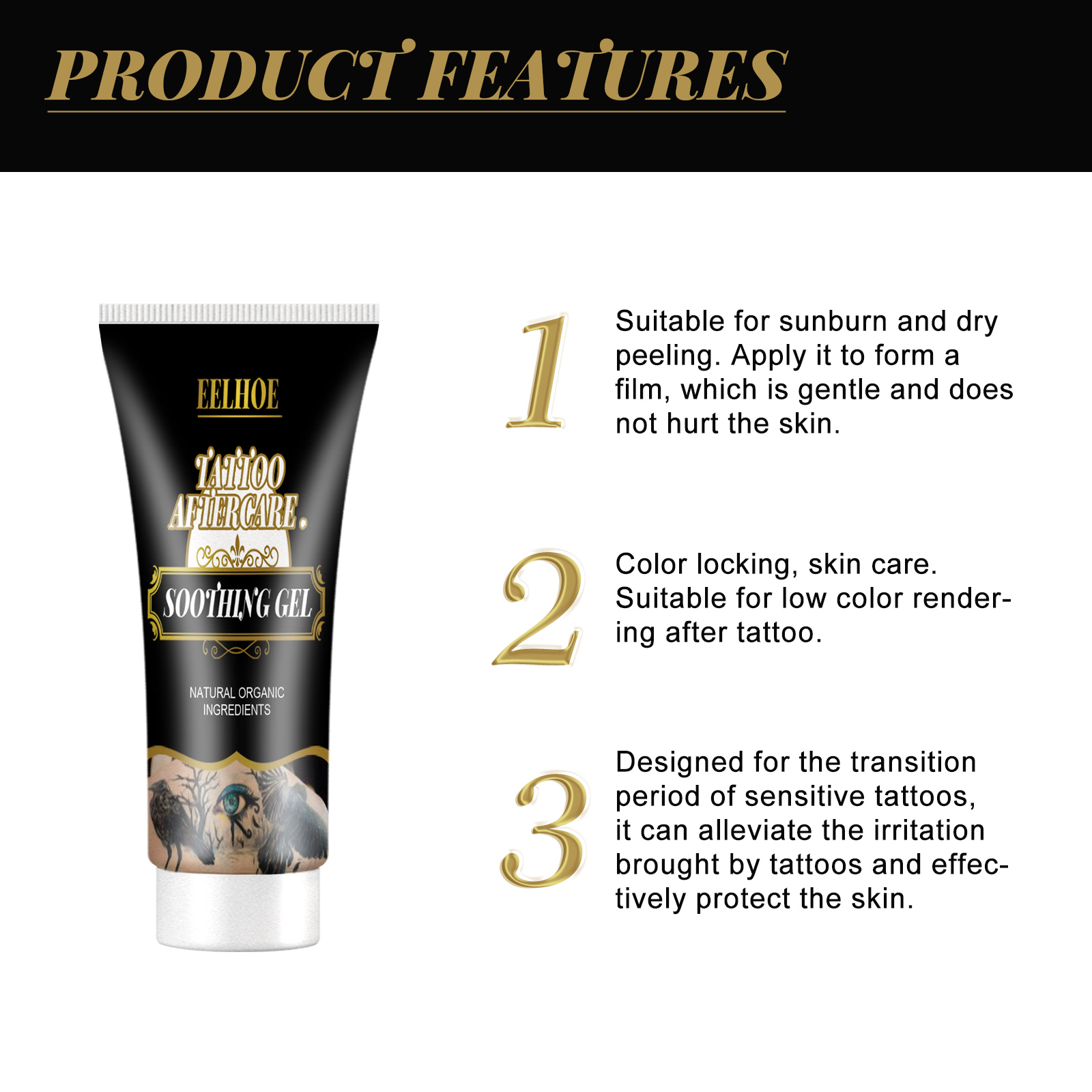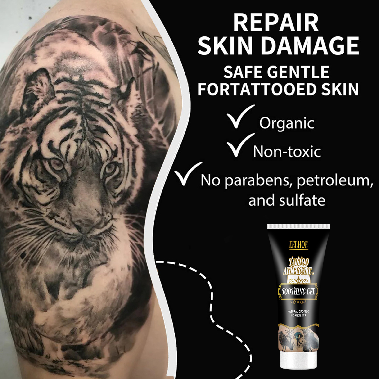 Our tattoo repair gel contains aloe vera, sweet almond oil, argan oil. It can quickly and deeply replenish water, make the skin full and moisturized, evenly brighten the skin tone, moisturize and plump the skin. Its application is simple: clean the area that needs care and keep it dry, take a small amount of the product and apply it thinly to the area that needs care. Can be used as many times as needed to repair the skin. The skin heals faster after use and forms a protective layer without any infection.