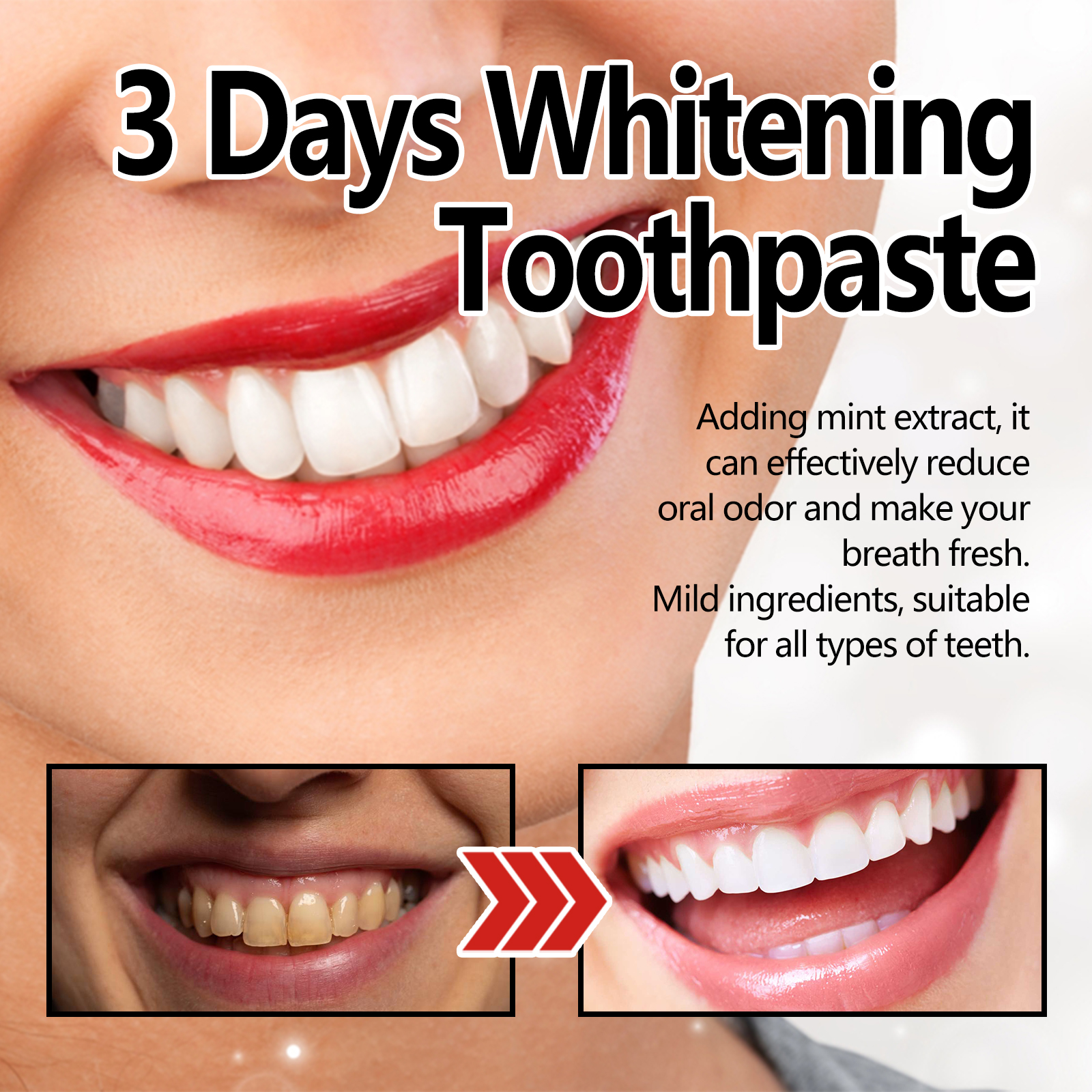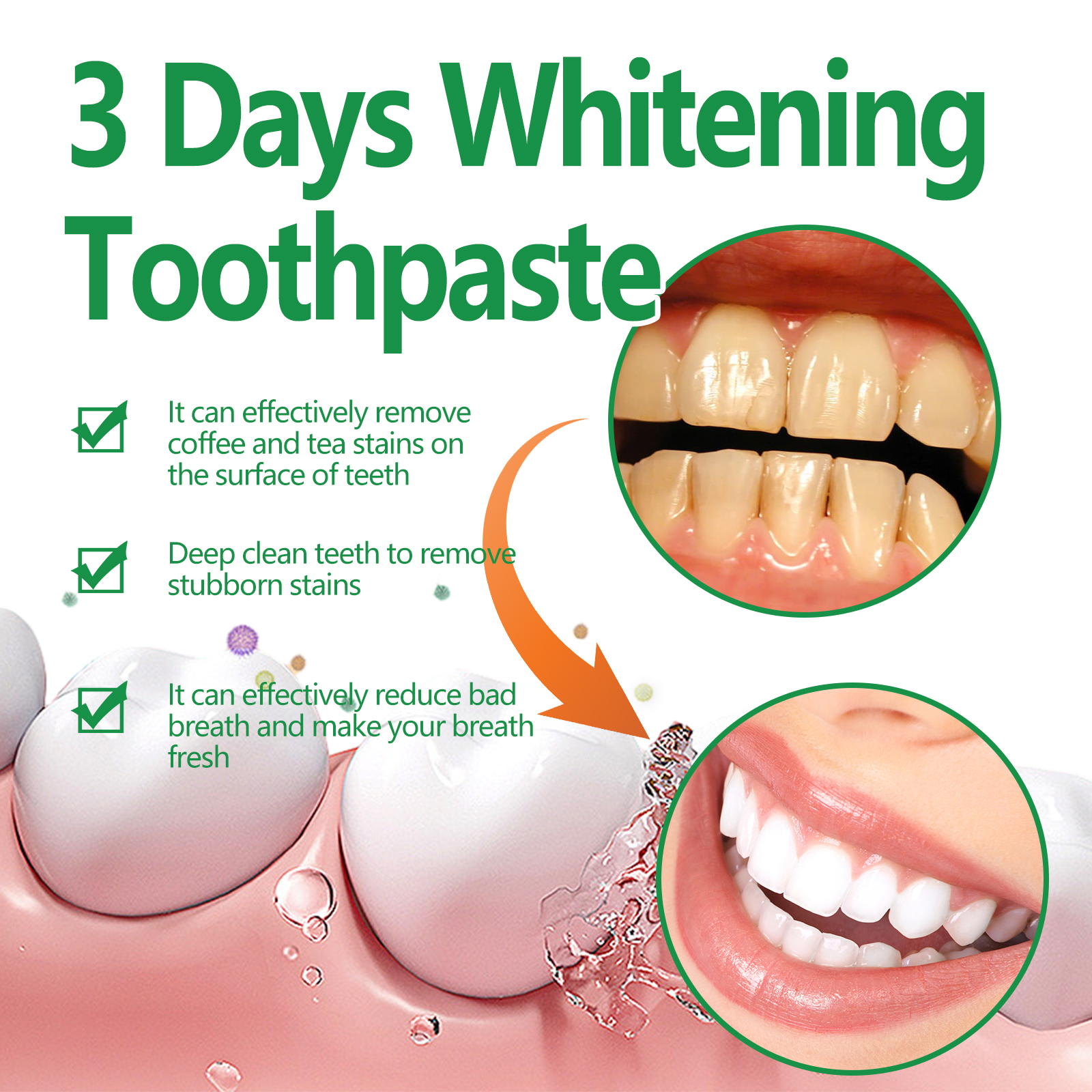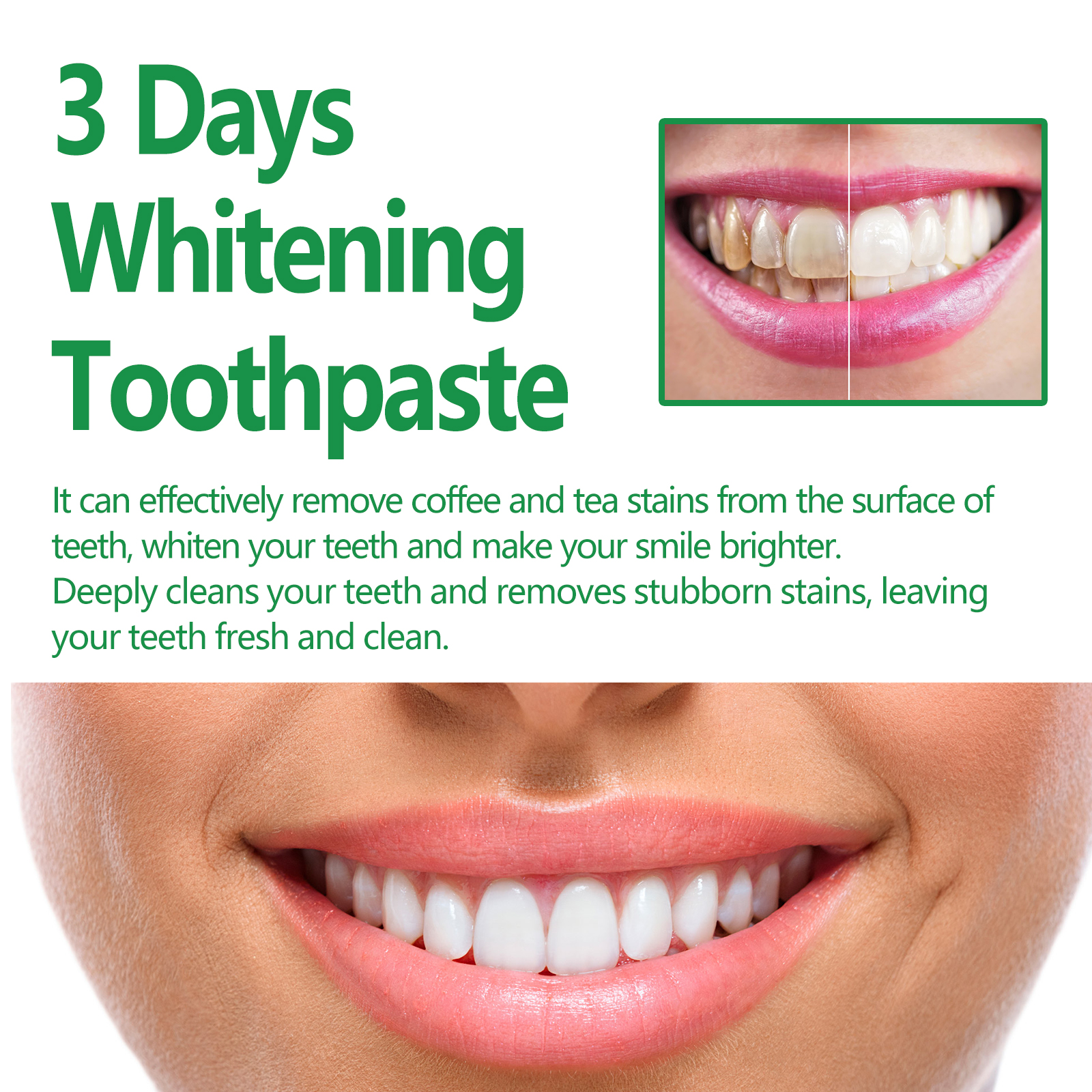 Our coffee stain removing toothpaste contains sodium lauryl sulfate and hydroxypropyl methyl cellulose. It can dissolve and clean the stubborn yellow dirt on the surface of the teeth without damaging the tooth enamel, and form a protective layer in the mouth to reduce tooth decay, effectively reduce bad breath and fresher breath. The way to use it is very simple: squeeze the appropriate amount of toothpaste onto the toothbrush, brush gently for 1-2 minutes, and finally rinse with water until the mouth is clean. It can effectively remove tartar, repair gingival periodontitis, whiten teeth, remove tooth bacteria, and relieve tooth discomfort.