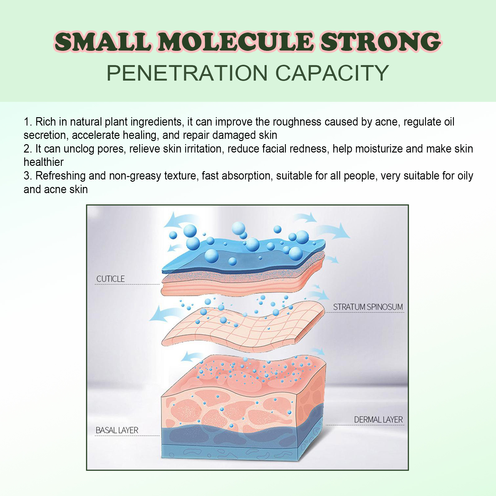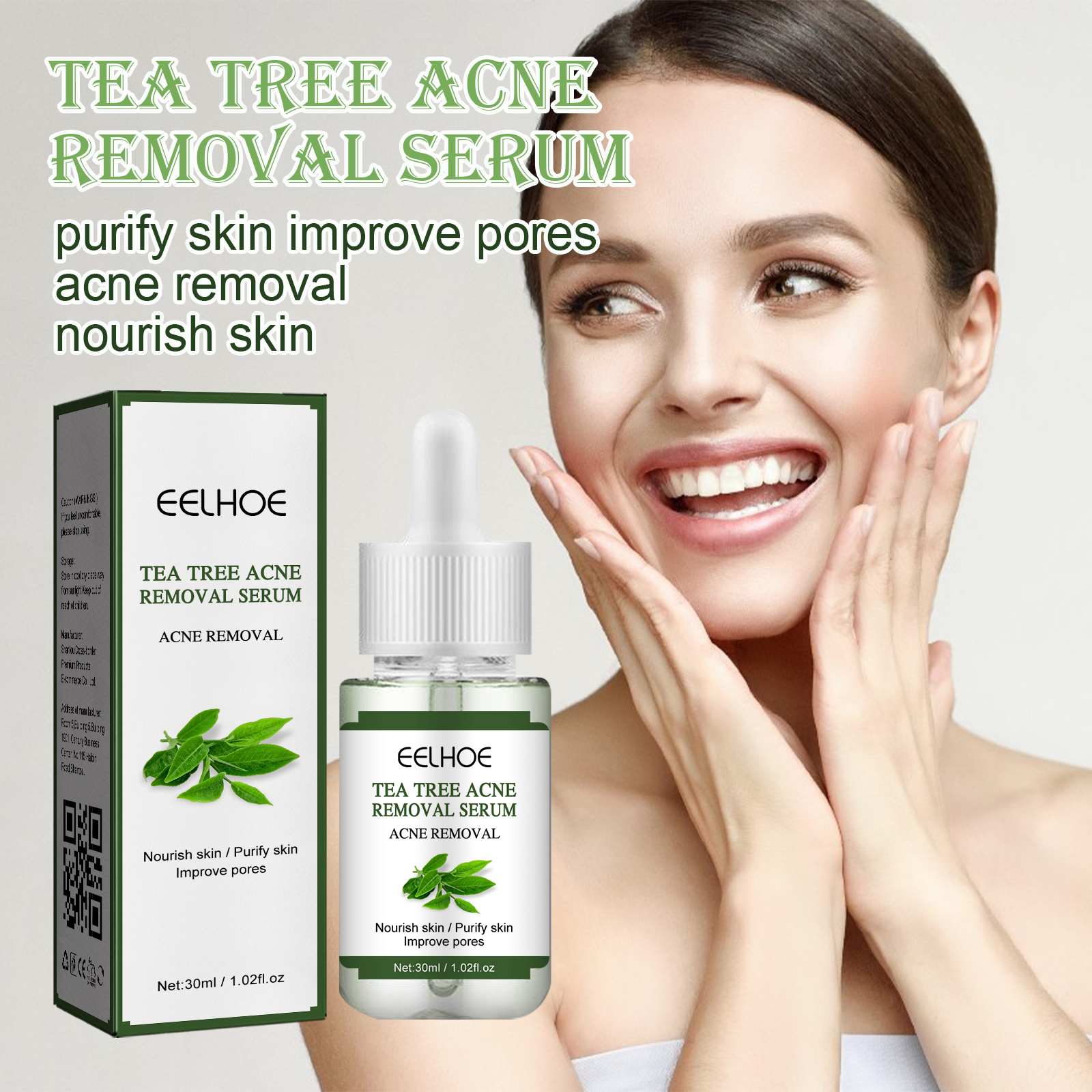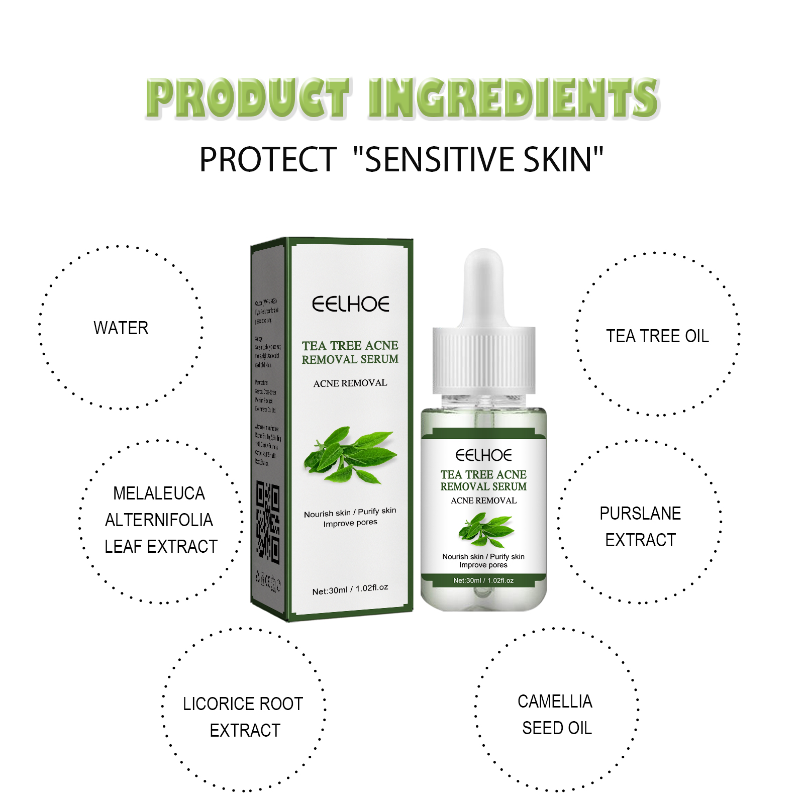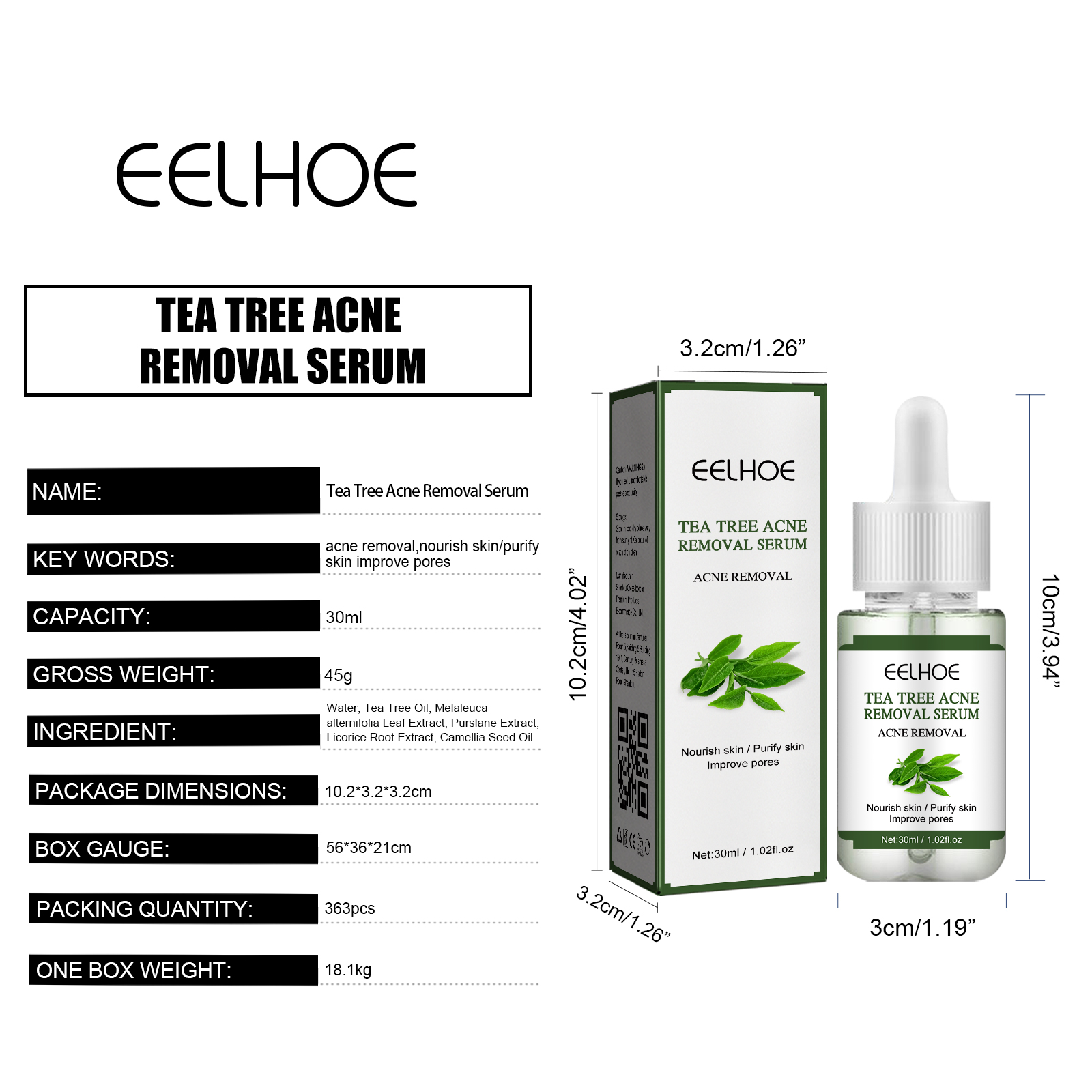 Our Tea Tree Acne Treatment Essence contains tea tree oil and Melaleuca alternata leaf extract. It can help balance oil secretion, prevent excessive oil secretion and acne, can help the absorption of other active ingredients, can be used as a skin penetrant; Has the effect of antibacterial mite, can be used as an antibacterial agent. Its use is very simple: clean and dry, take 3-5 drops of this product evenly spread on the face (acne or pimples), gently massage until completely absorbed. It also removes acne and nourishes the skin.
