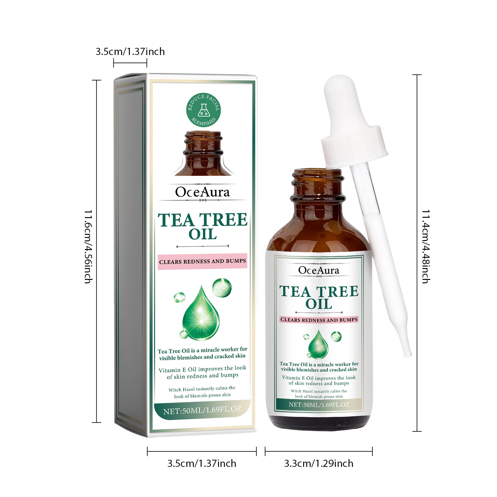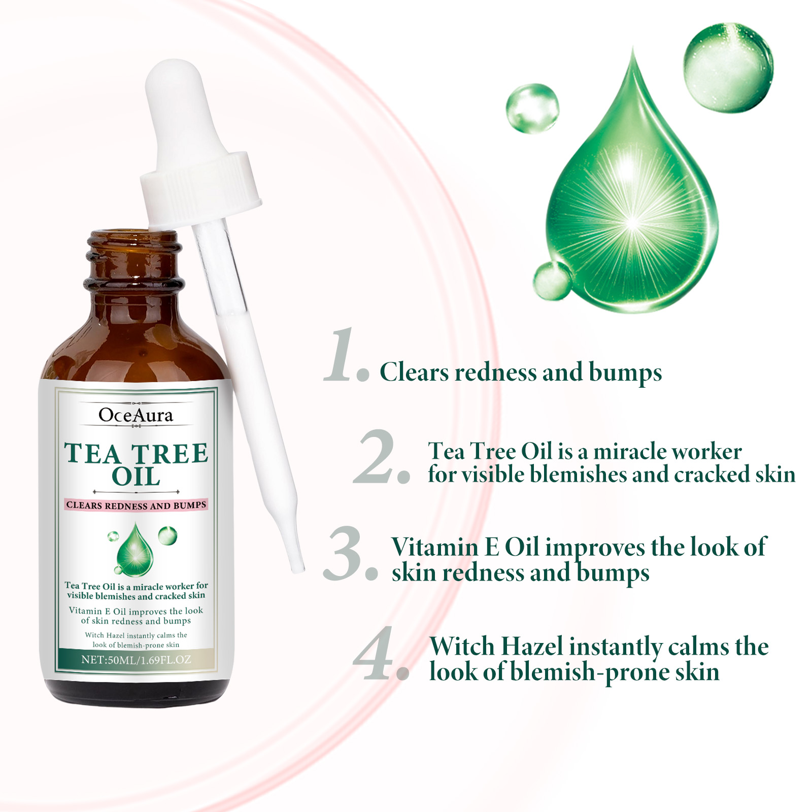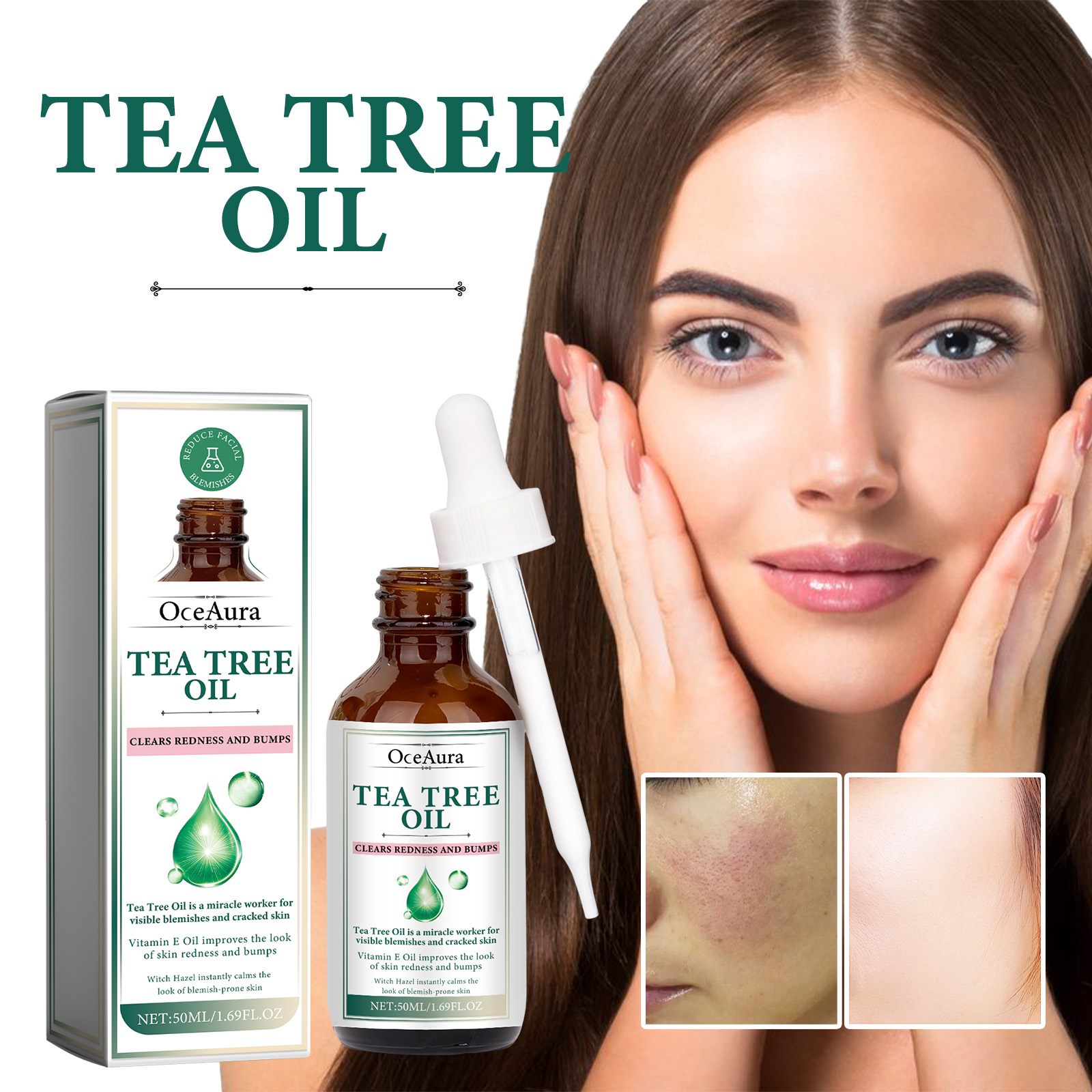 Our Tea Tree Oil contains Helianthus Annuus (Sunflower) Extract, Hamamelis Virginiana (Witch Hazel) Water, Cocos Nucifera (Coconut) Oil. It can balance sebum production, control oil, reduce problems caused by oily skin, help improve damaged skin, reduce dark spots, pigmentation and uneven skin tone, help reduce fine lines and wrinkles near the eyes, mouth and forehead, and make the surface of the skin smoother. Its use method is very simple: after cleansing and toning, take appropriate amount of this product evenly apply to the face skin, gently massage with your hand to absorb. Can soothe and calm skin, can be used to relieve skin redness, swelling, itching and other discomfort, deep moisturizing skin, reduce dryness and roughness, keep skin hydrated.
