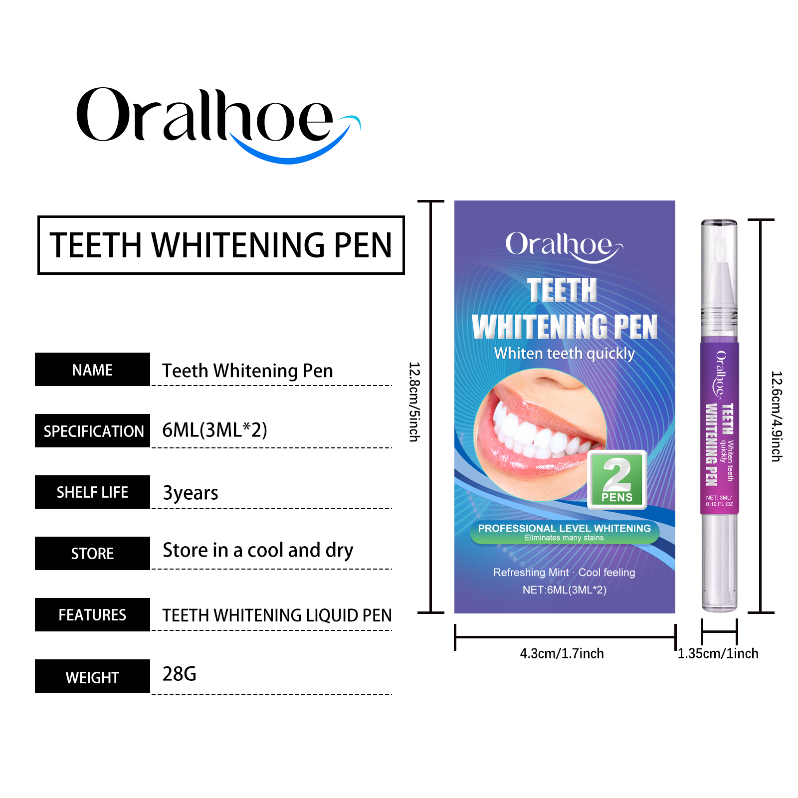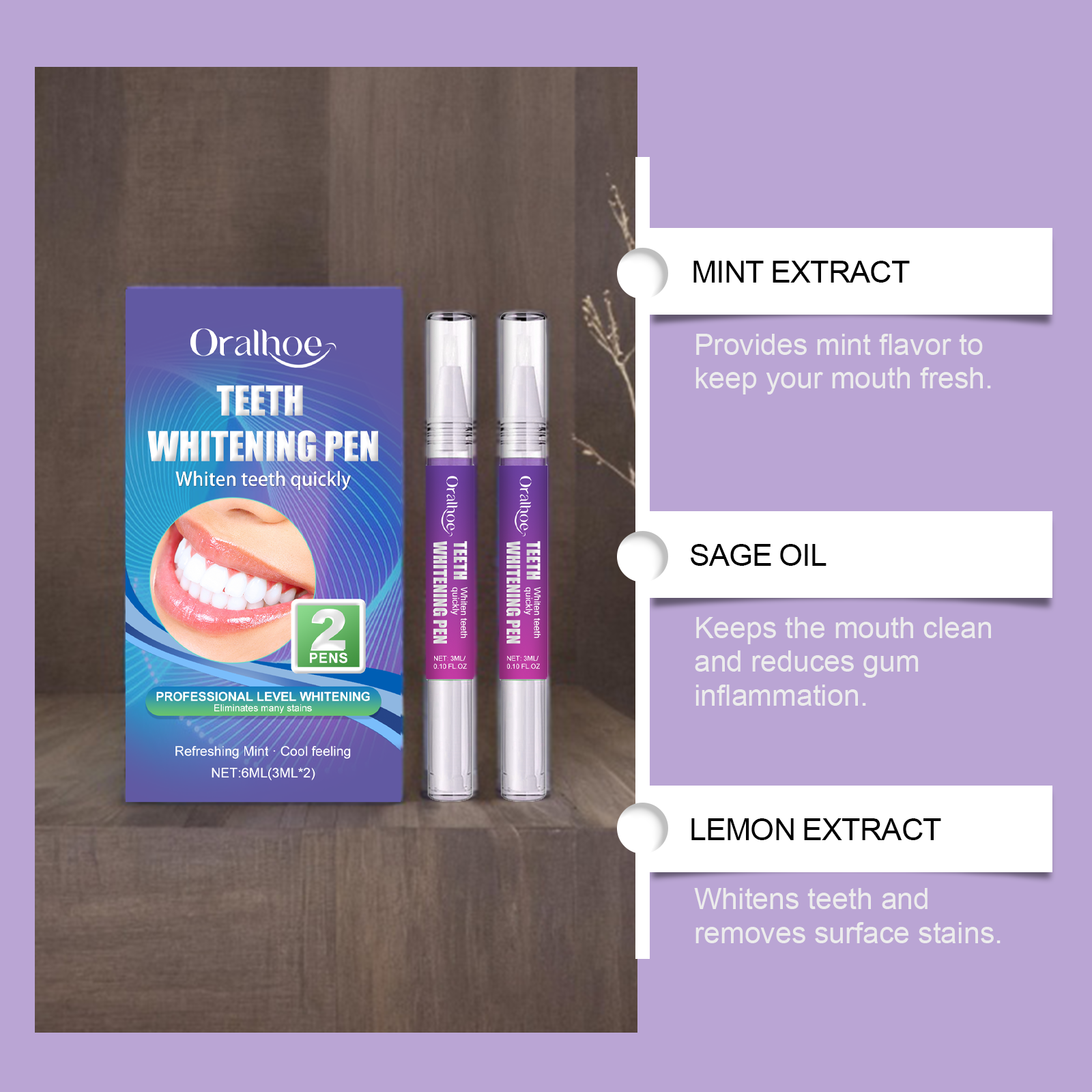 Our dental care gel pens contain peppermint extract, sage oil, lemon extract. It can effectively remove stubborn tooth stains. Peroxide-free formula, gentle, does not irritate teeth and gums. Its use method is very simple: 1. The first time to use the product 40 times. 2. Squeeze out an appropriate amount of toothpaste and apply it evenly to your teeth. 3. Use 1-2 times daily. Whitening results are immediate and noticeable changes can be seen within minutes. Pen design, easy to carry, anytime, anywhere use.