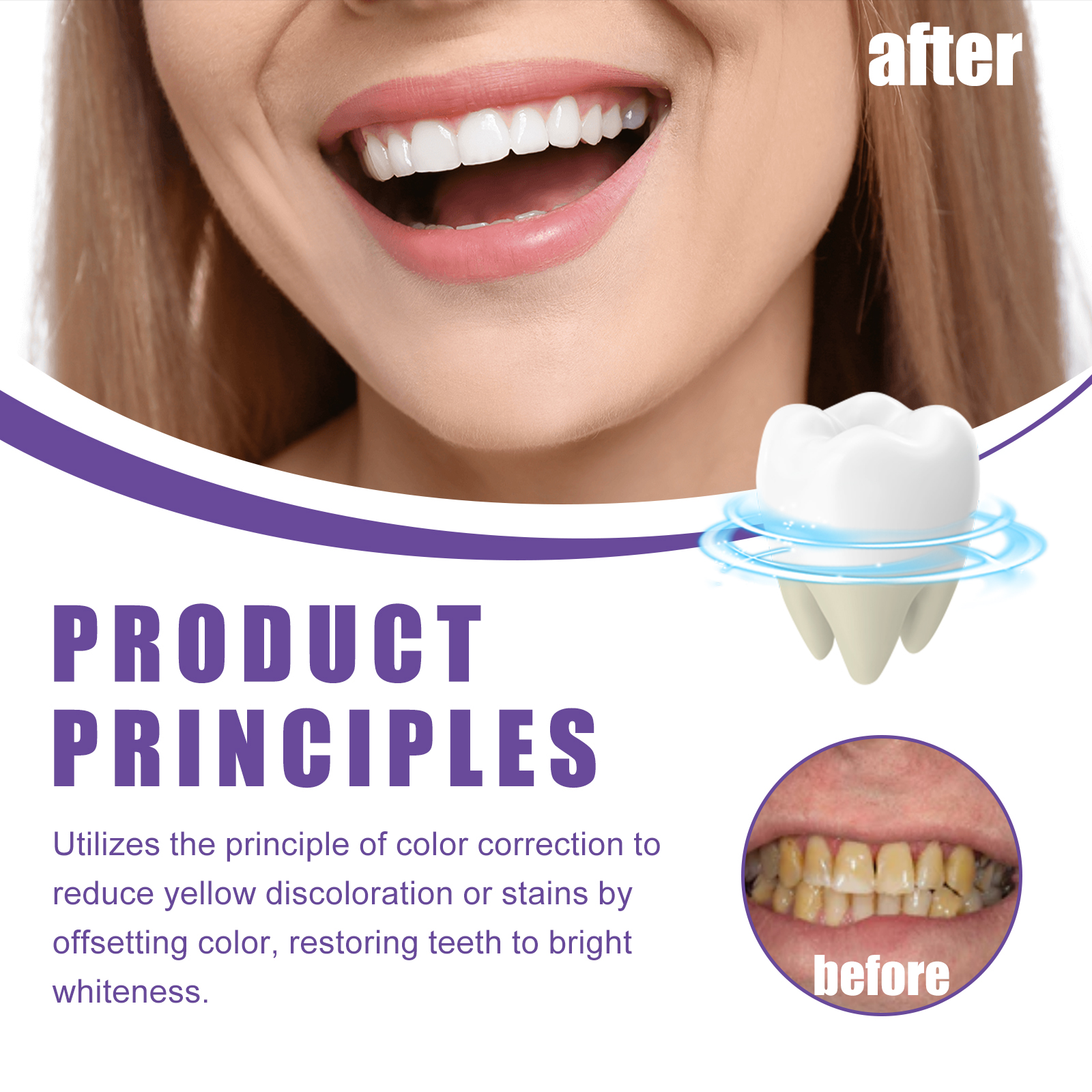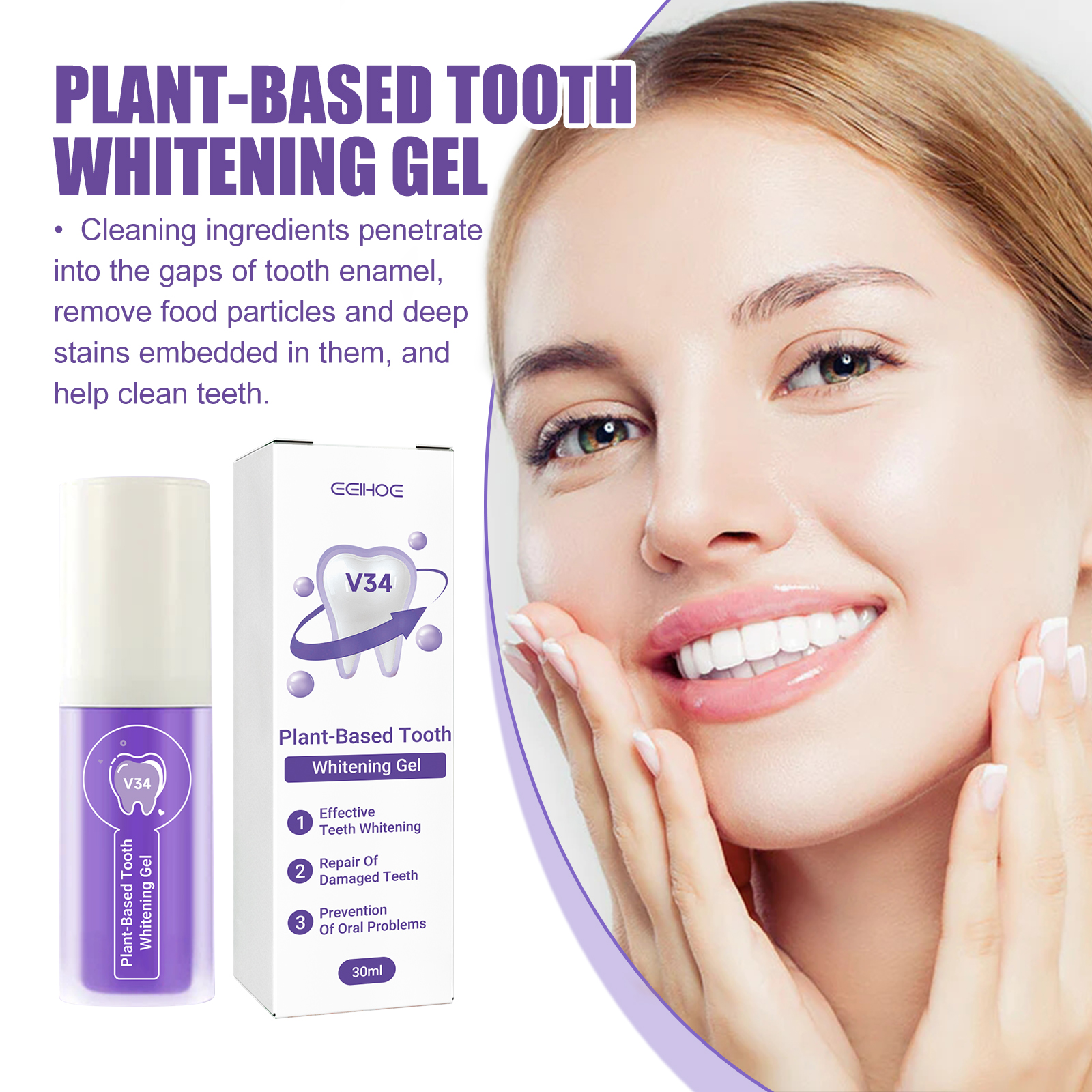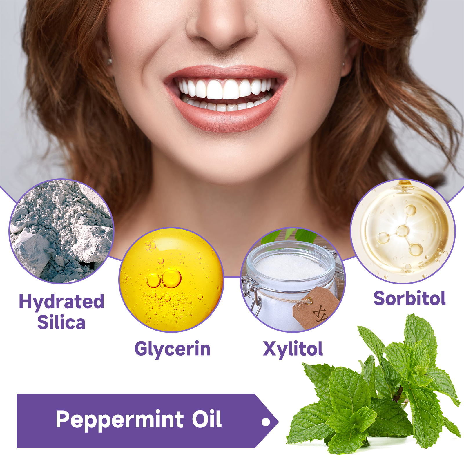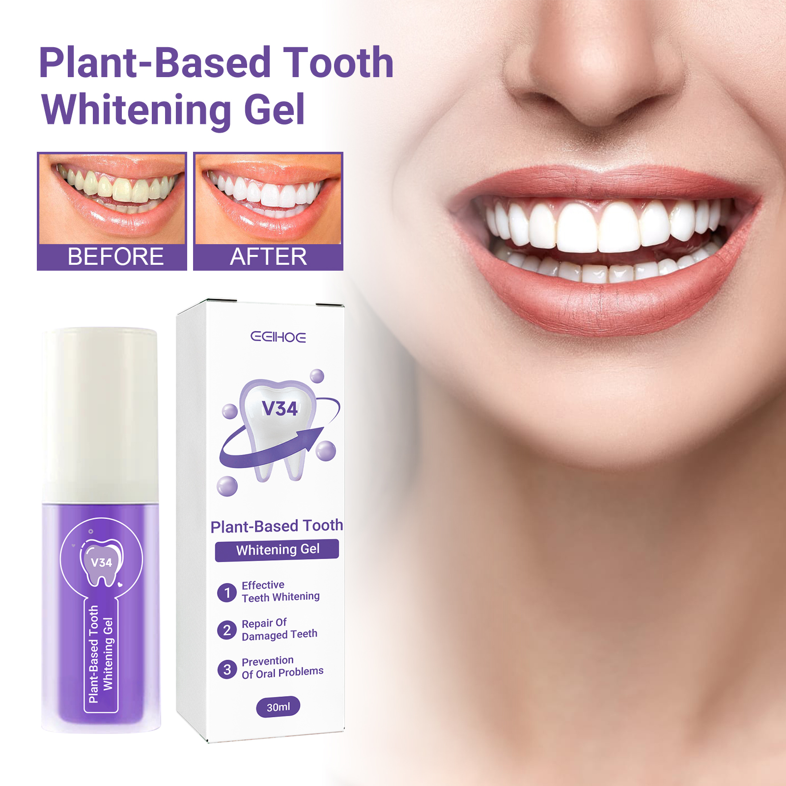 Our Plant-Based Tooth Whitening Gel contains Hydrated Silica, Peppermint Oil, Glycerin. It can penetrate the gaps in the tooth enamel to remove food particles and deep stains embedded in them, helping to clean the teeth. Its use is very simple: squeeze 1-2 pump toothpaste onto the toothbrush, gently brush 1-2 minutes, and finally rinse thoroughly with water, use every morning and evening, the effect is better. The principle of color correction can be used to reduce the yellowing or staining of the teeth in a way that can restore the teeth to bright white.