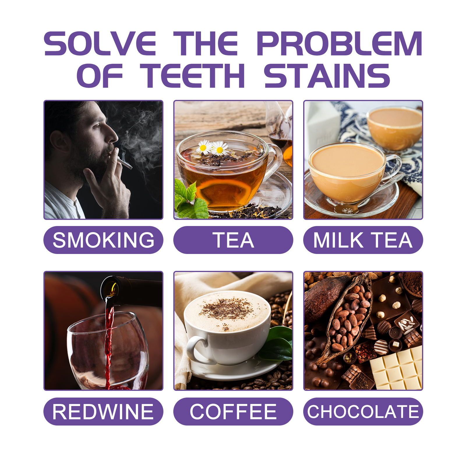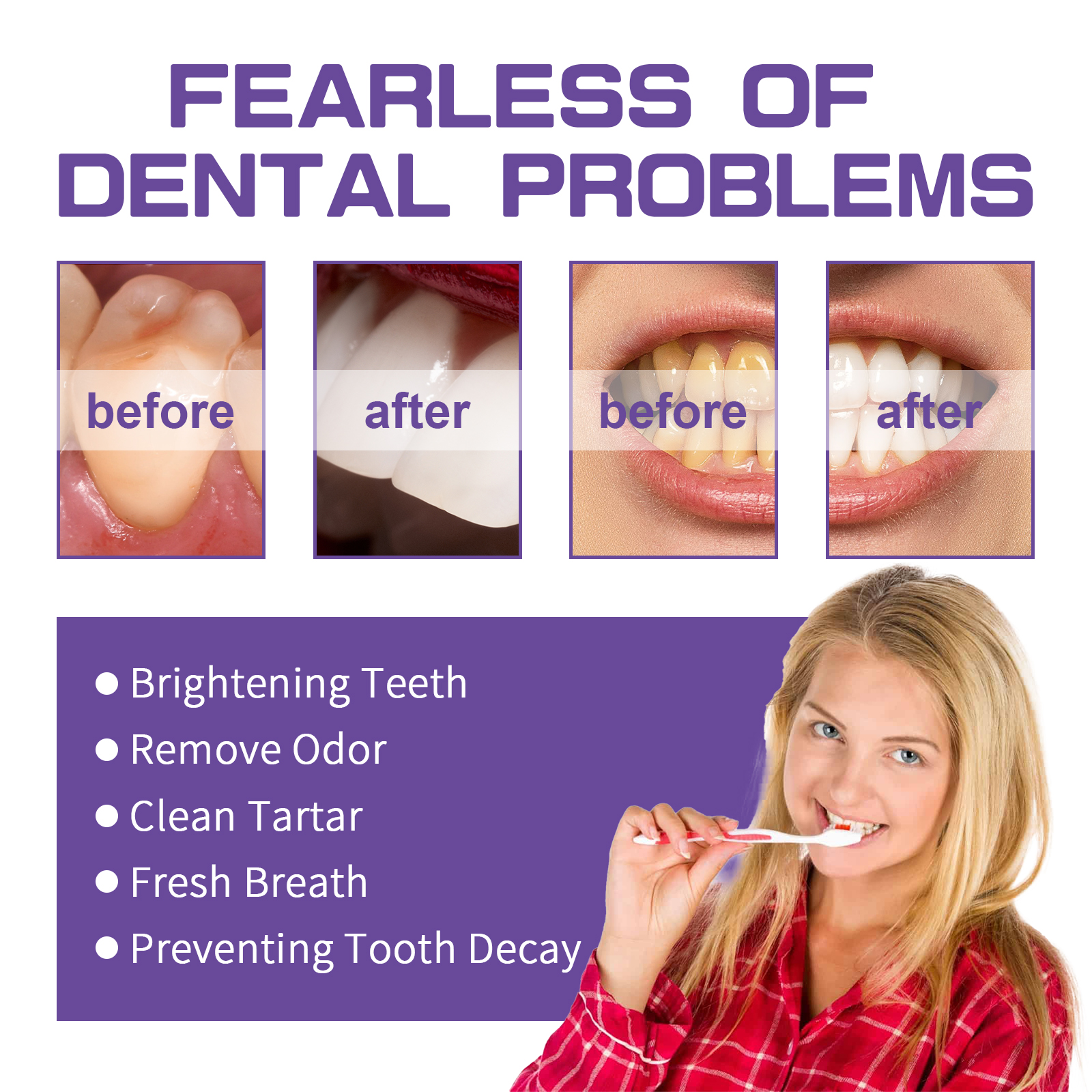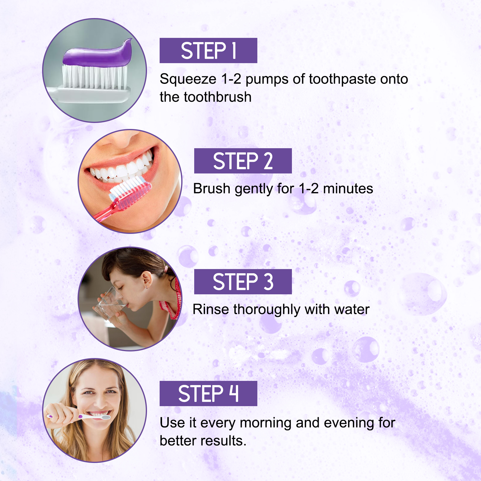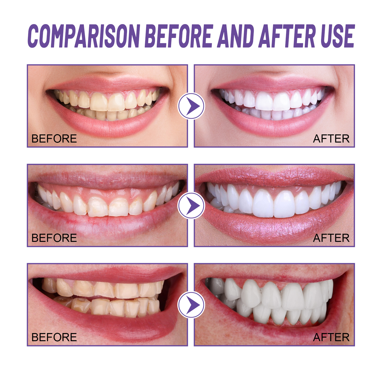 Our Plant-Based Tooth Whitening Gel contains Hydrated Silica, Peppermint Oil, Glycerin. It can penetrate the gaps in the tooth enamel to remove food particles and deep stains embedded in them, helping to clean the teeth. Its use is very simple: squeeze 1-2 pump toothpaste onto the toothbrush, gently brush 1-2 minutes, and finally rinse thoroughly with water, use every morning and evening, the effect is better. The principle of color correction can be used to reduce the yellowing or staining of the teeth in a way that can restore the teeth to bright white.