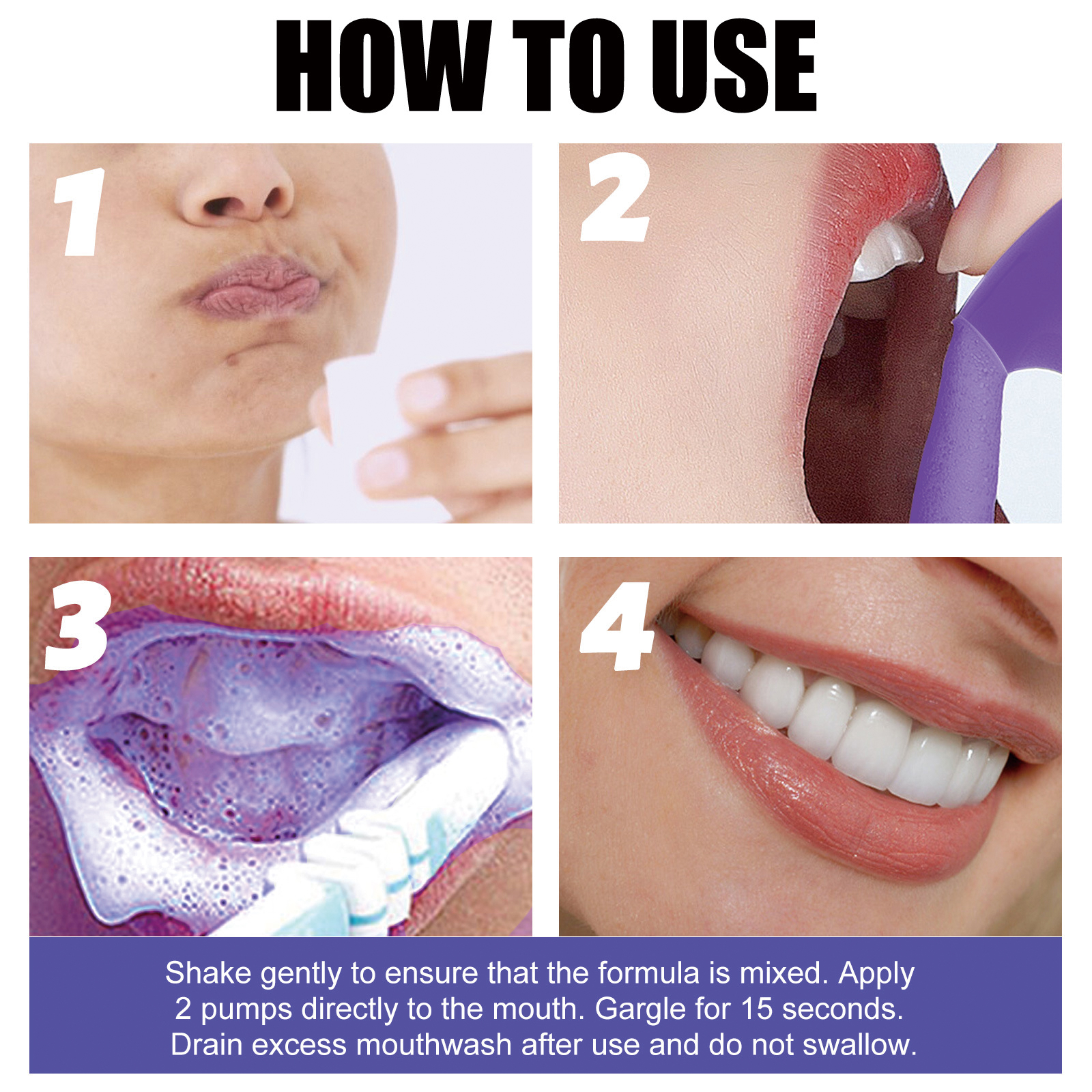 Our tooth whitening mousse contains Lactobacillus, dipotassium glycyrrhizinate, xylitol. It can effectively remove tartar, repair gum periodontitis, whiten teeth, soothe gums, remove tooth bacteria, relieve tooth discomfort, and freshen breath. How to use it is simple: First give it a gentle shake to make sure the formula is thoroughly mixed. Then apply the pump directly to your mouth twice. Gargle for 15 seconds. Spit out excess mouthwash after use, do not swallow, after use will help protect the gums, prevent tooth decay, suppress harmful tooth bacteria, whiten teeth, keep fresh breath.