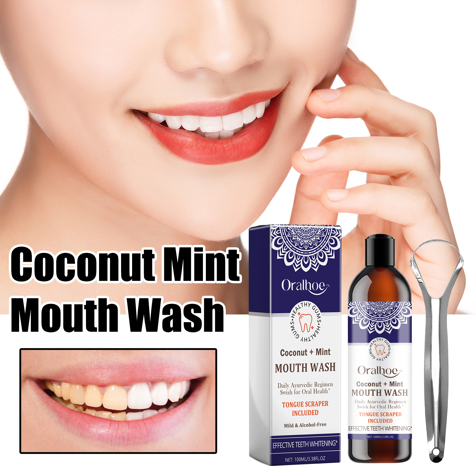 Our Coconut Mint Mouth Wash contains coconut extract, mint leaf extract, alternate leaf Melaleuca melaleuca extract. It can effectively remove plaque and tartar in the mouth, promote overall oral health, completely reduce bad breath, bring lasting fresh breath, and enhance oral comfort. Its use is very simple: take 1 tablespoon of mouthwash, gargle for at least 2-3 minutes, up to 10 minutes, then spit out the mouthwash, then brush your teeth, scrape your tongue with a tongue scraper, and rinse your mouth. It can effectively prevent tooth decay and relieve tooth discomfort.