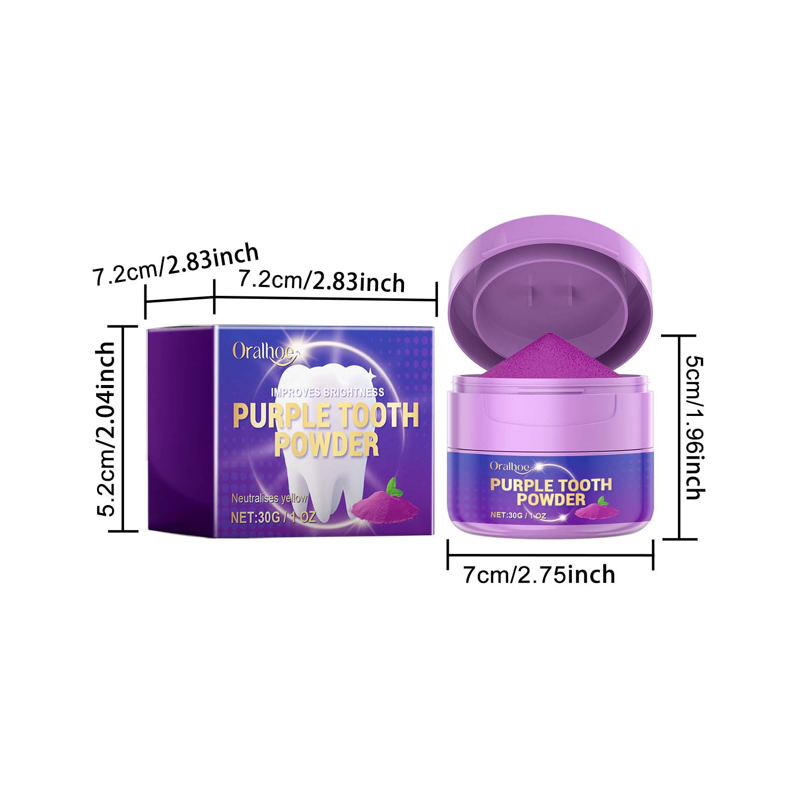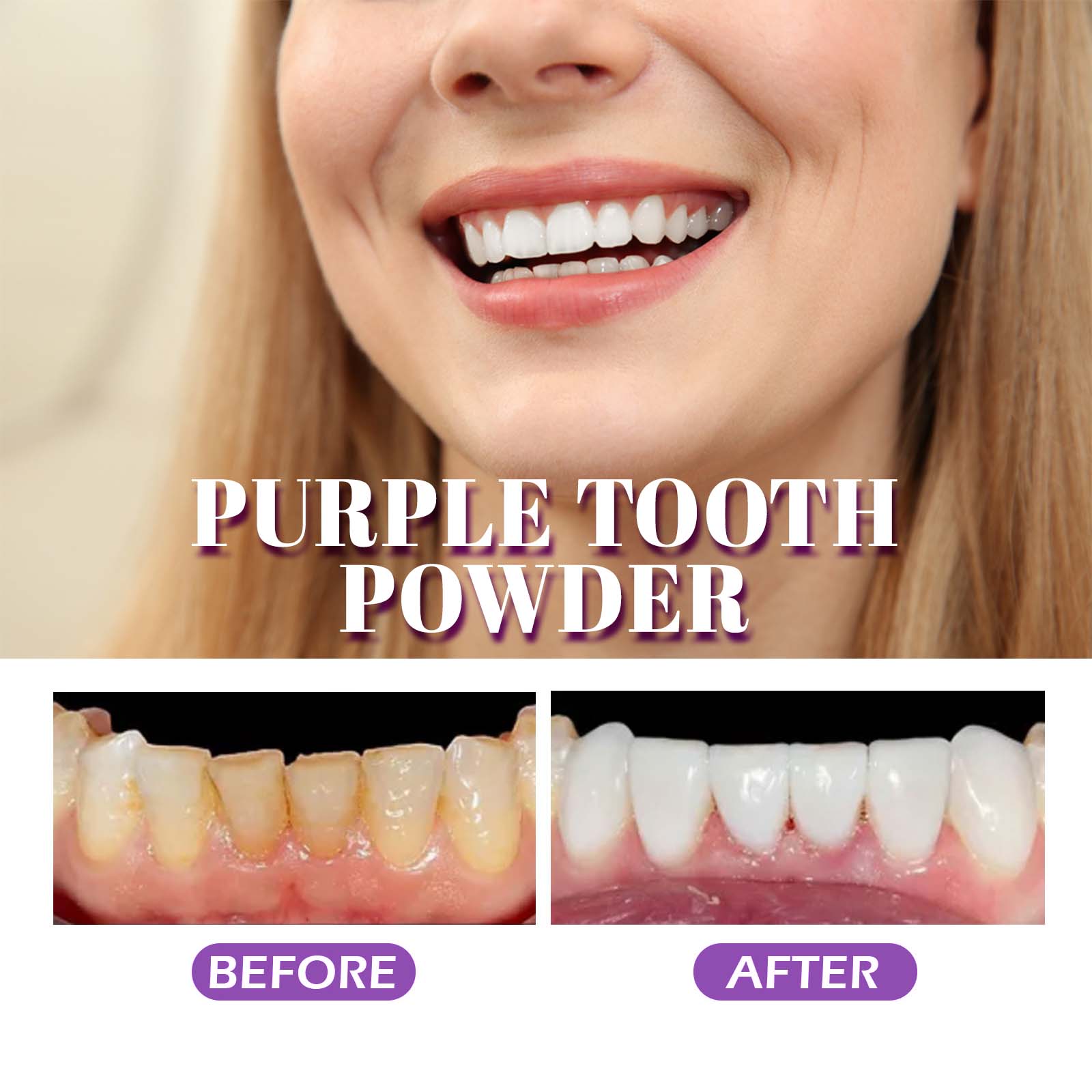 Our Purple Tooth Powder contains glycerin, poria powder, honeysuckle. It can completely solve the problem of plaque and yellowing, and restore the natural whiteness, refreshing your mouth odor, lasting fragrance, and improving your comfort. Its use method is very simple: apply tooth powder on the toothbrush, brush with the correct steps for 2 minutes, and rinse with water after brushing. It can awaken the bright white luster of your teeth and make your smile more attractive and eye-catching.