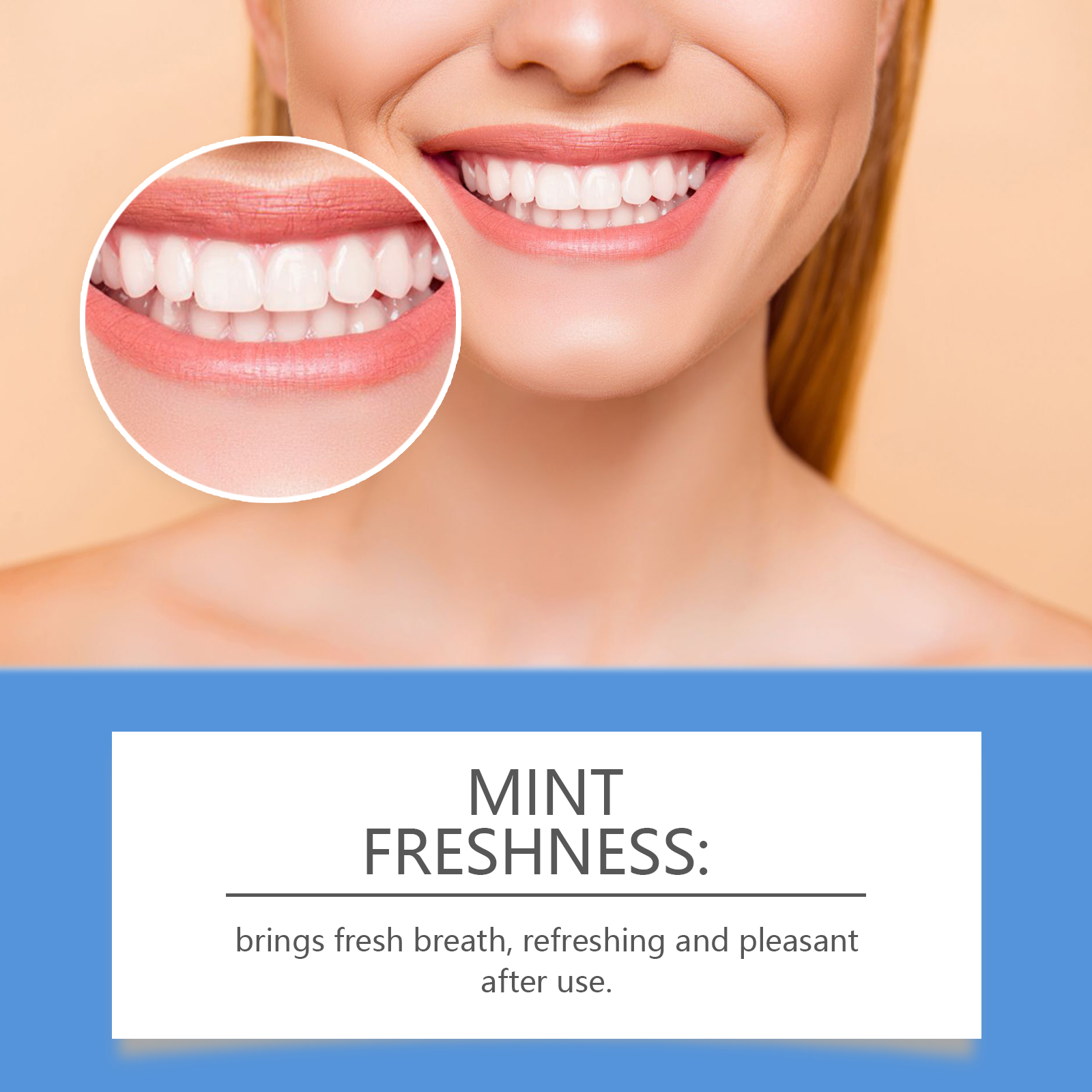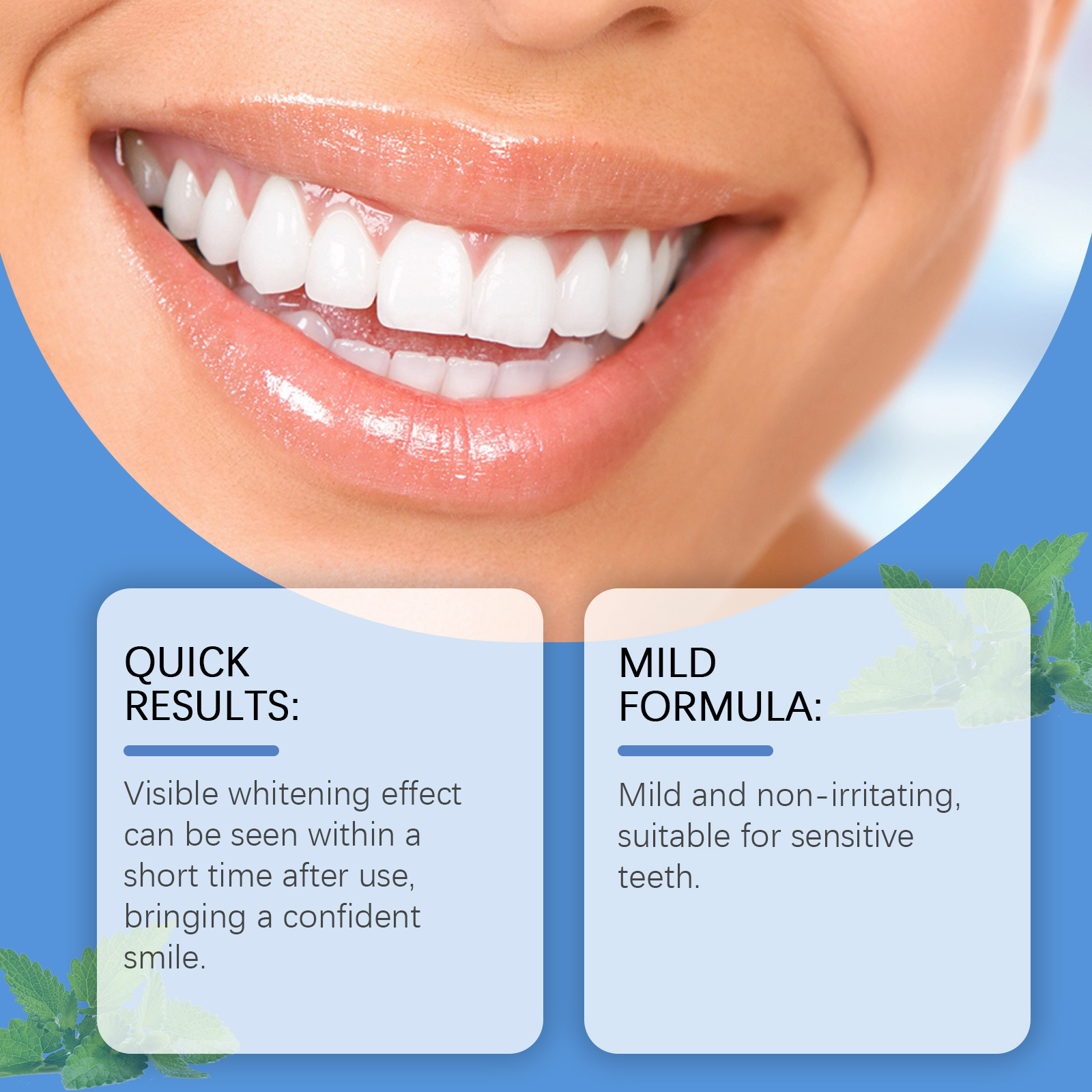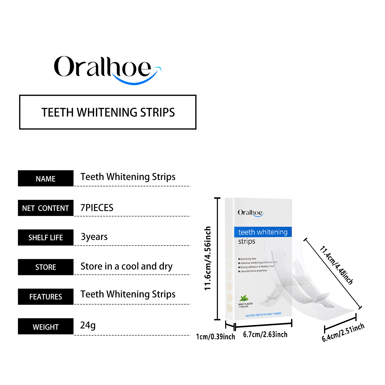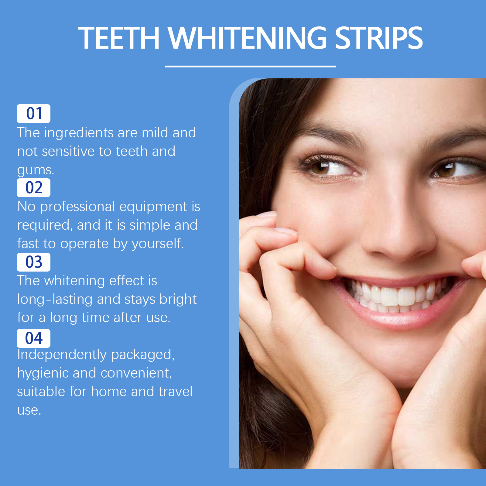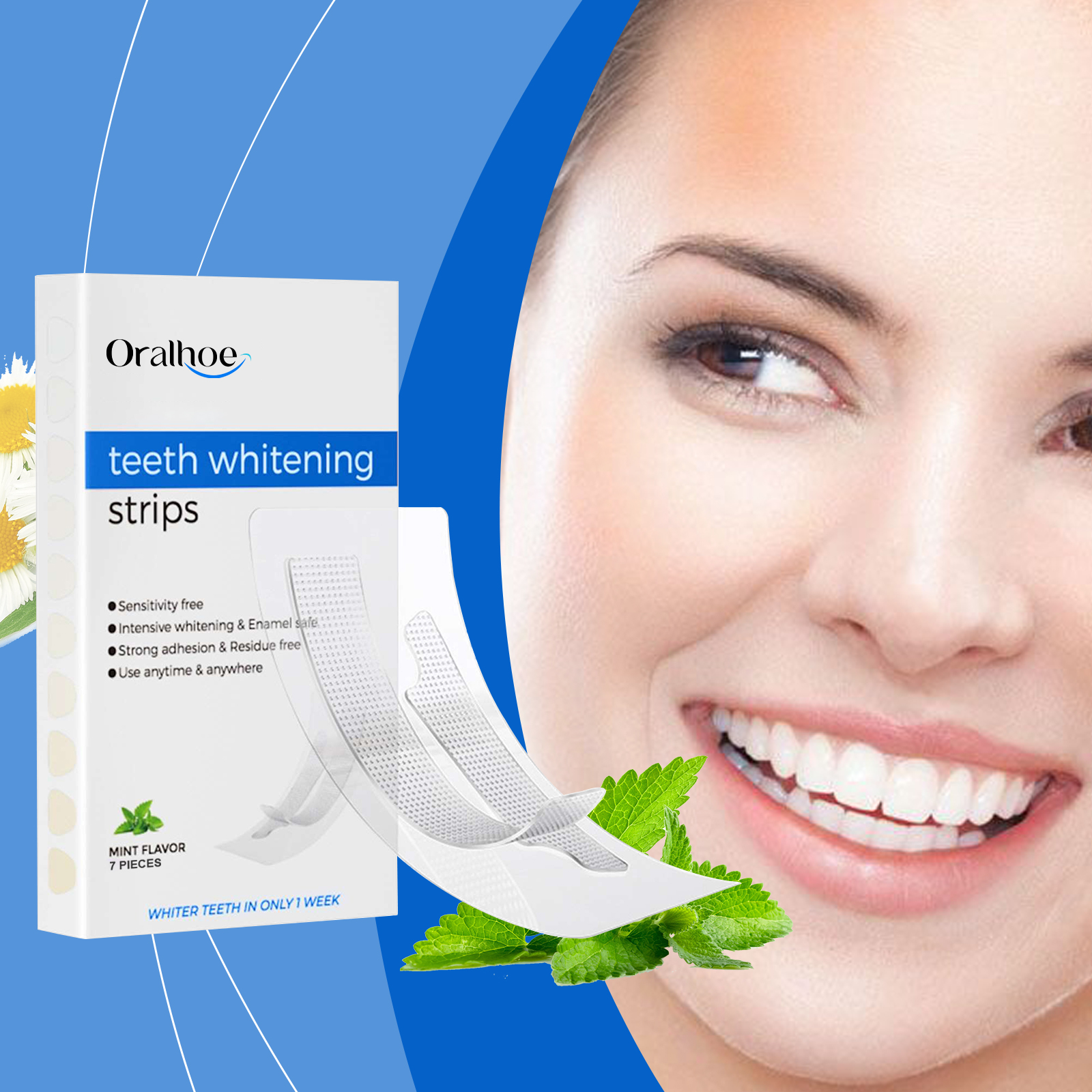 Our Teeth whitening strips contain hyaluronic acid, ascorbic acid (vitamin C), mint leaf extract. It locks in moisture and protects the health of your gums. Enhance whitening effect and protect teeth. Fresh breath, feeling fresh and pleasant after use. Its use method is very simple: 1. After gargling; 2. Place the gel side of the product on the gums and teeth, pressing firmly to ensure that the product is fully attached to the surface. Teeth whitening strips have obvious whitening effect in a short time after use. With a confident smile. Mild and non-irritating, suitable for sensitive teeth.