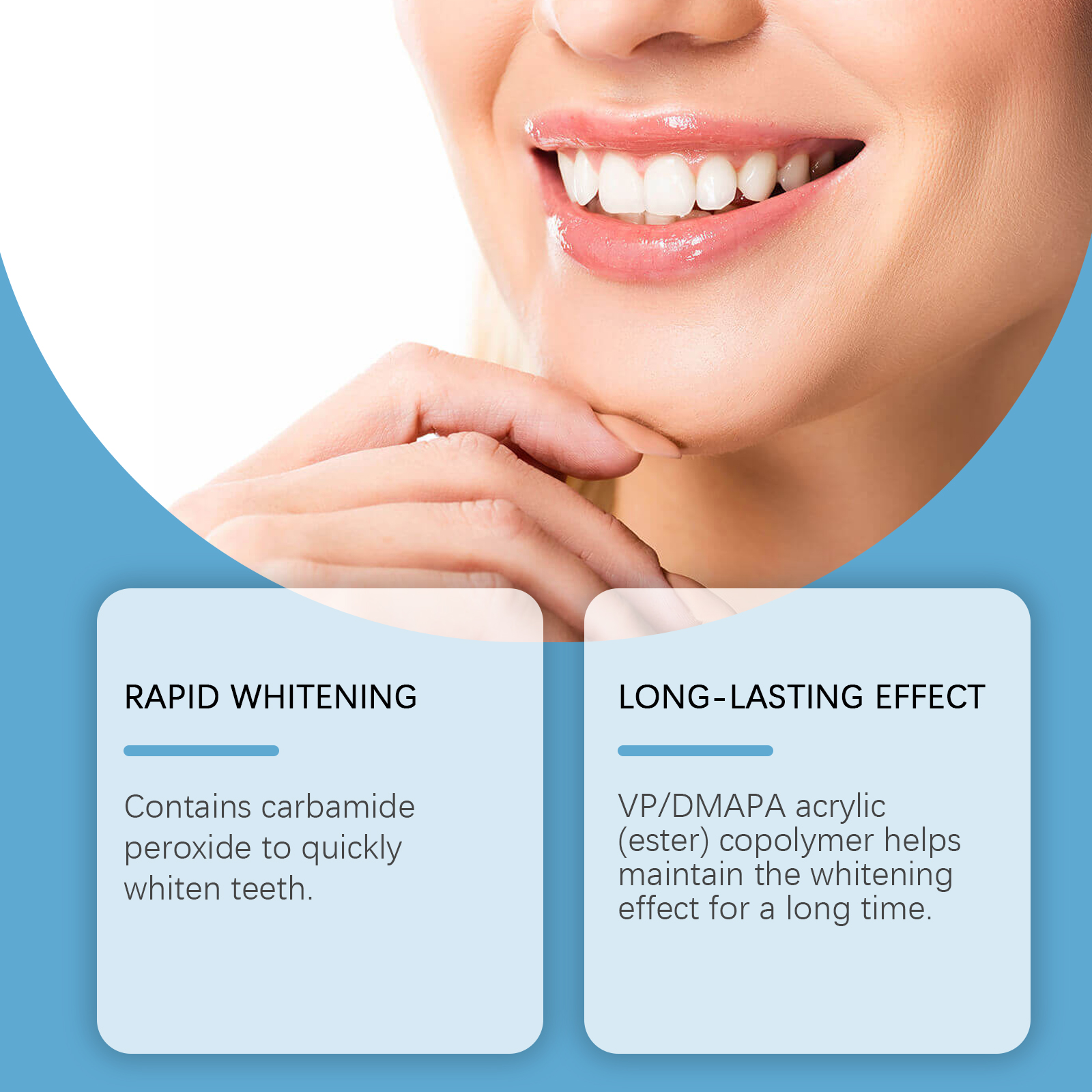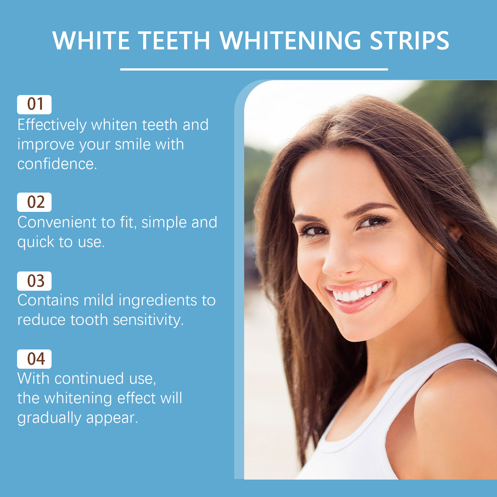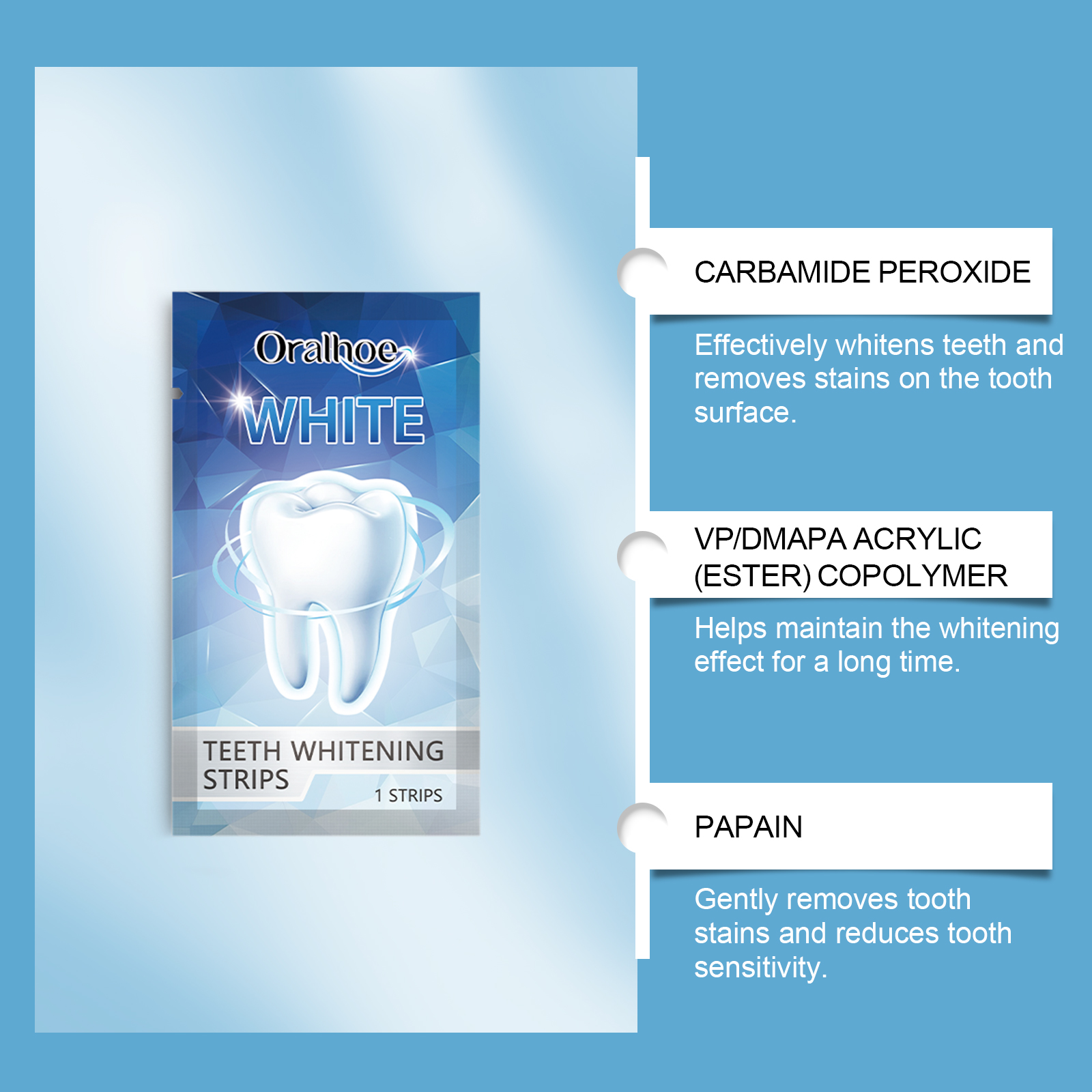 Our white tooth stickers contain glycerin and saccharin sodium. It whitens teeth quickly. Its use method is very simple: wipe the tooth surface to keep the tooth dry, take out the whitening patch on the tooth surface, gently press with your fingers, then fold the inside of the tooth, wait 15-30 minutes, gently remove the whitening patch. And easy to install, easy to use.