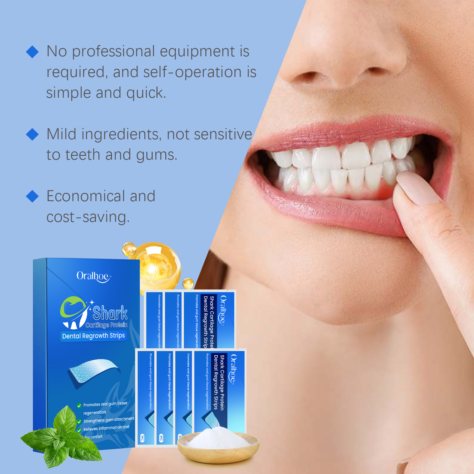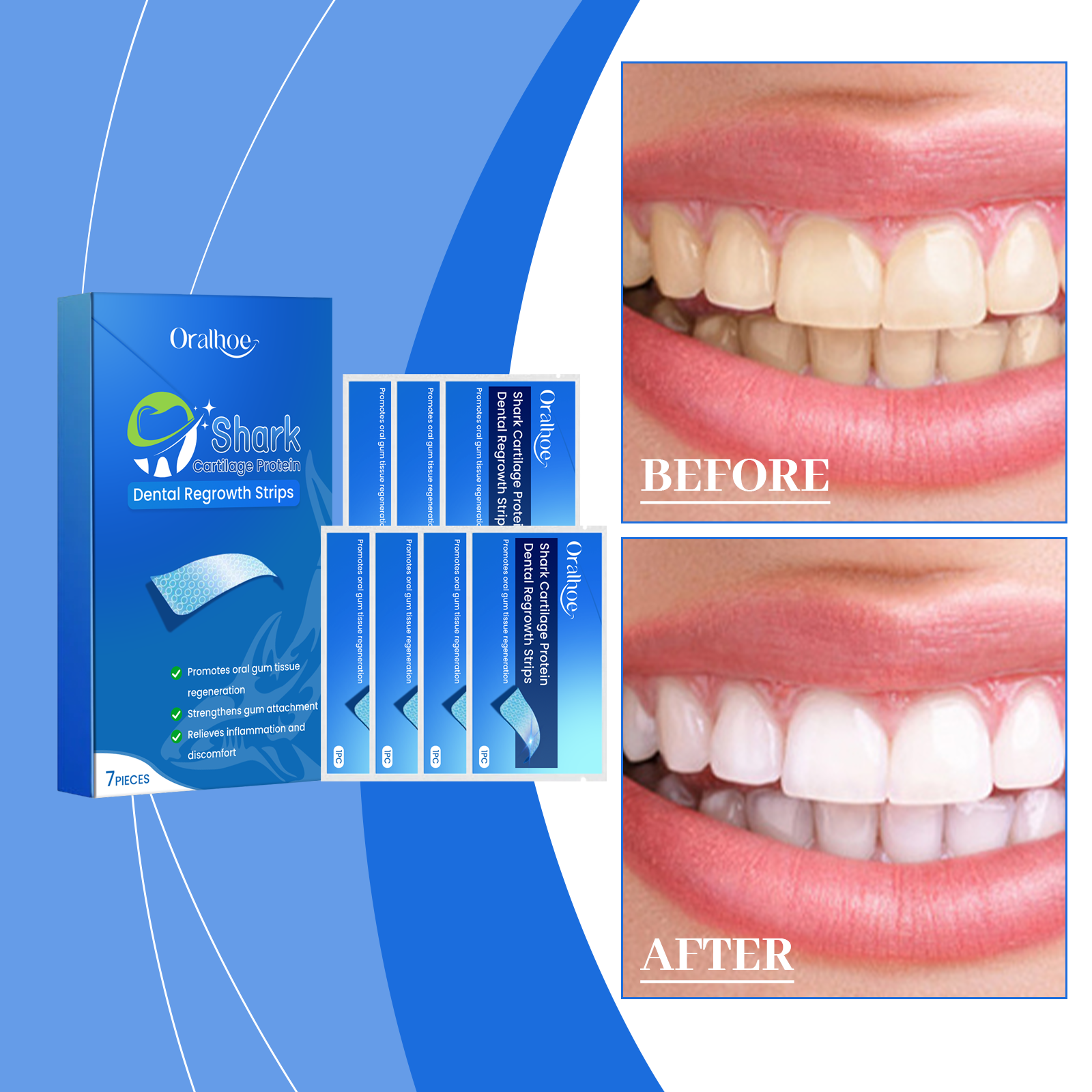 Our dental beauty strips contain peppermint extract, vitamin C (ascorbic acid). It can bring fresh breath, refreshing and pleasant after use. It can keep whitening for a long time. Lock in moisture to protect healthy gums. Its application is simple: After gargling, place the gel side of the product on your gums and teeth and press gently to ensure that the product fully adheres to the surface. And you can see the obvious whitening effect in a short time after use, bringing a confident smile.