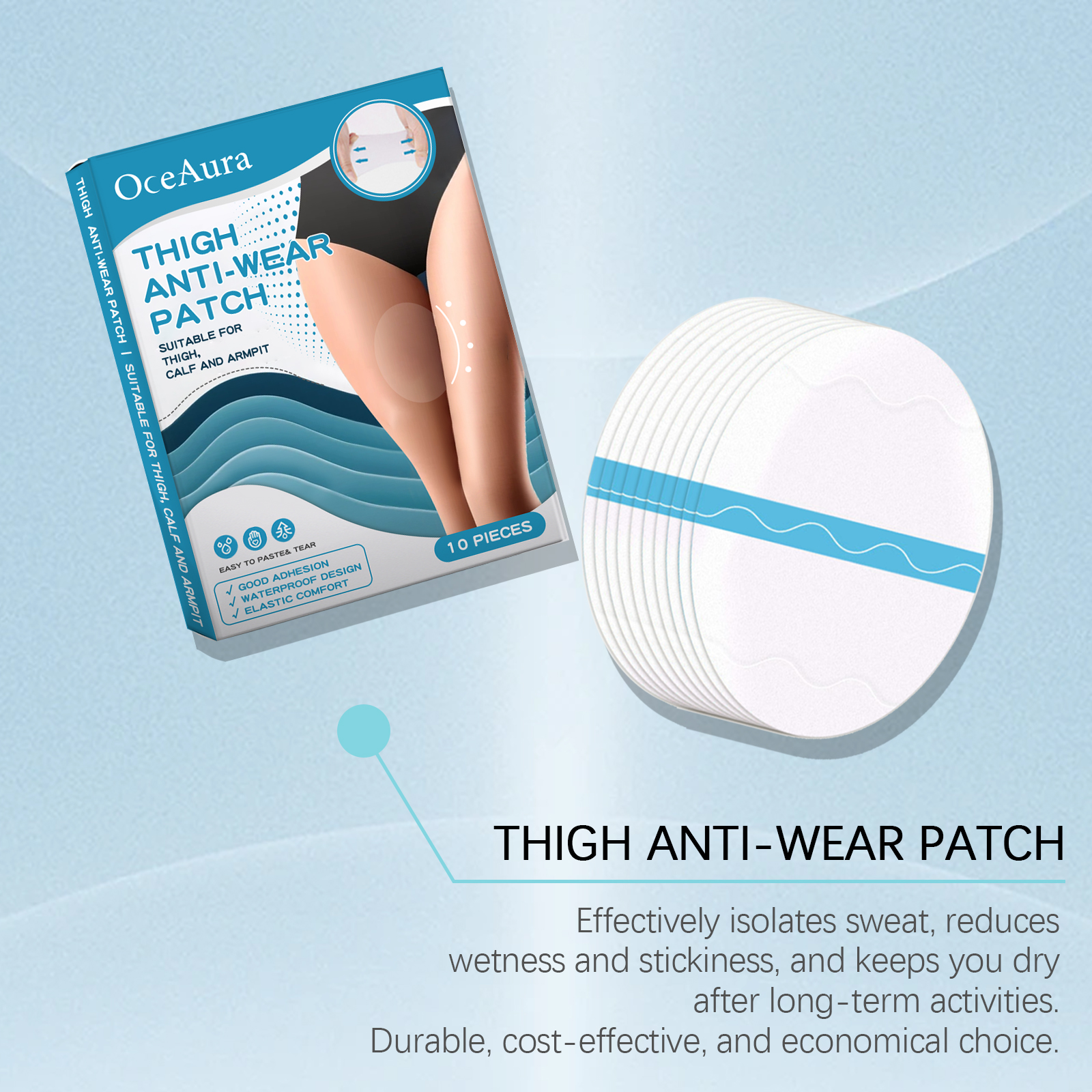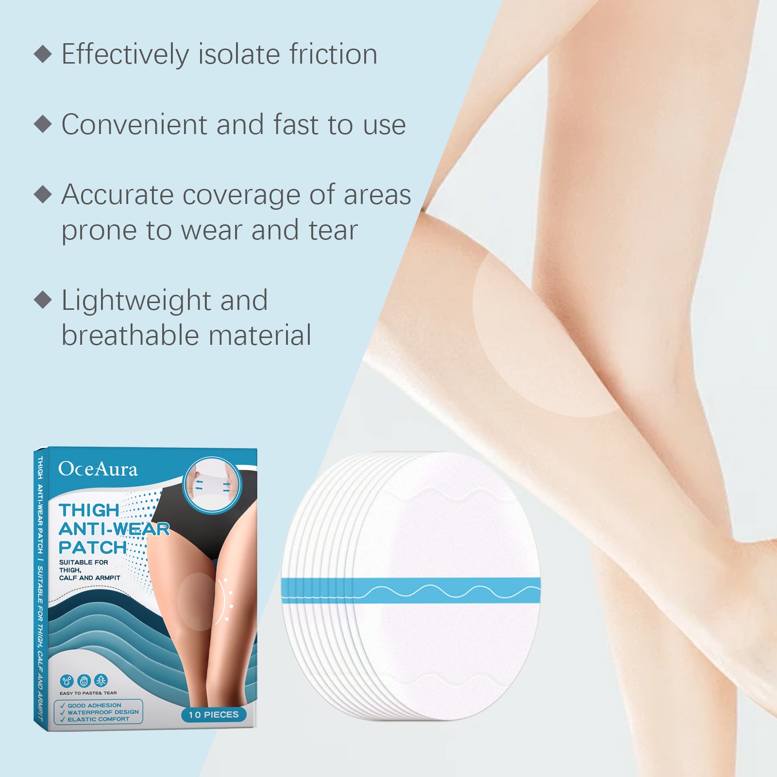 Our thigh wear pads contain PU film. It can effectively prevent thigh friction and improve comfort. Its use method is very simple: tear off the protective paper on the back of the patch, paste the product for the part that is often worn, and gently press the anti-wear sticker to make it tight. And can form a protective barrier, effectively isolate sweat, keep dry.