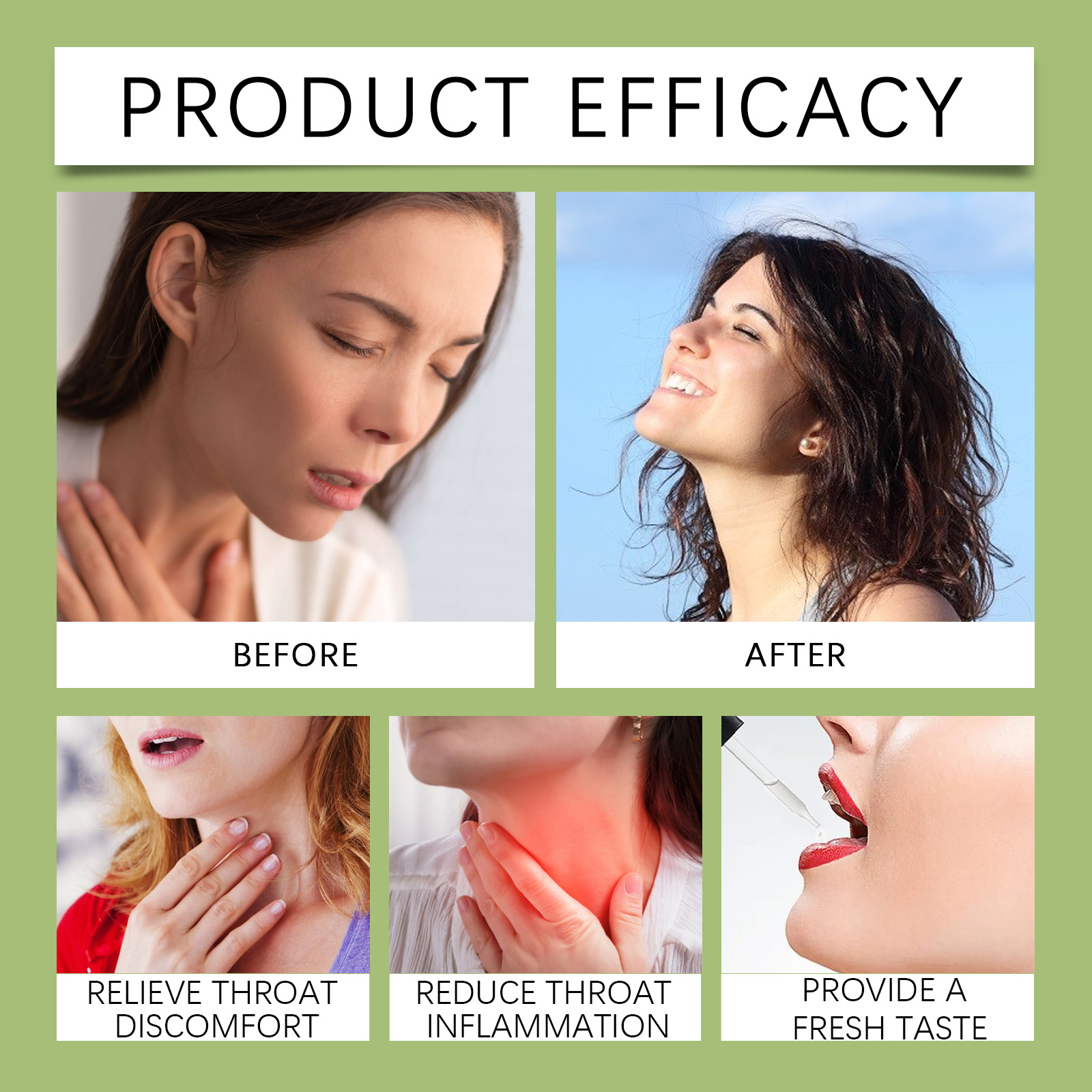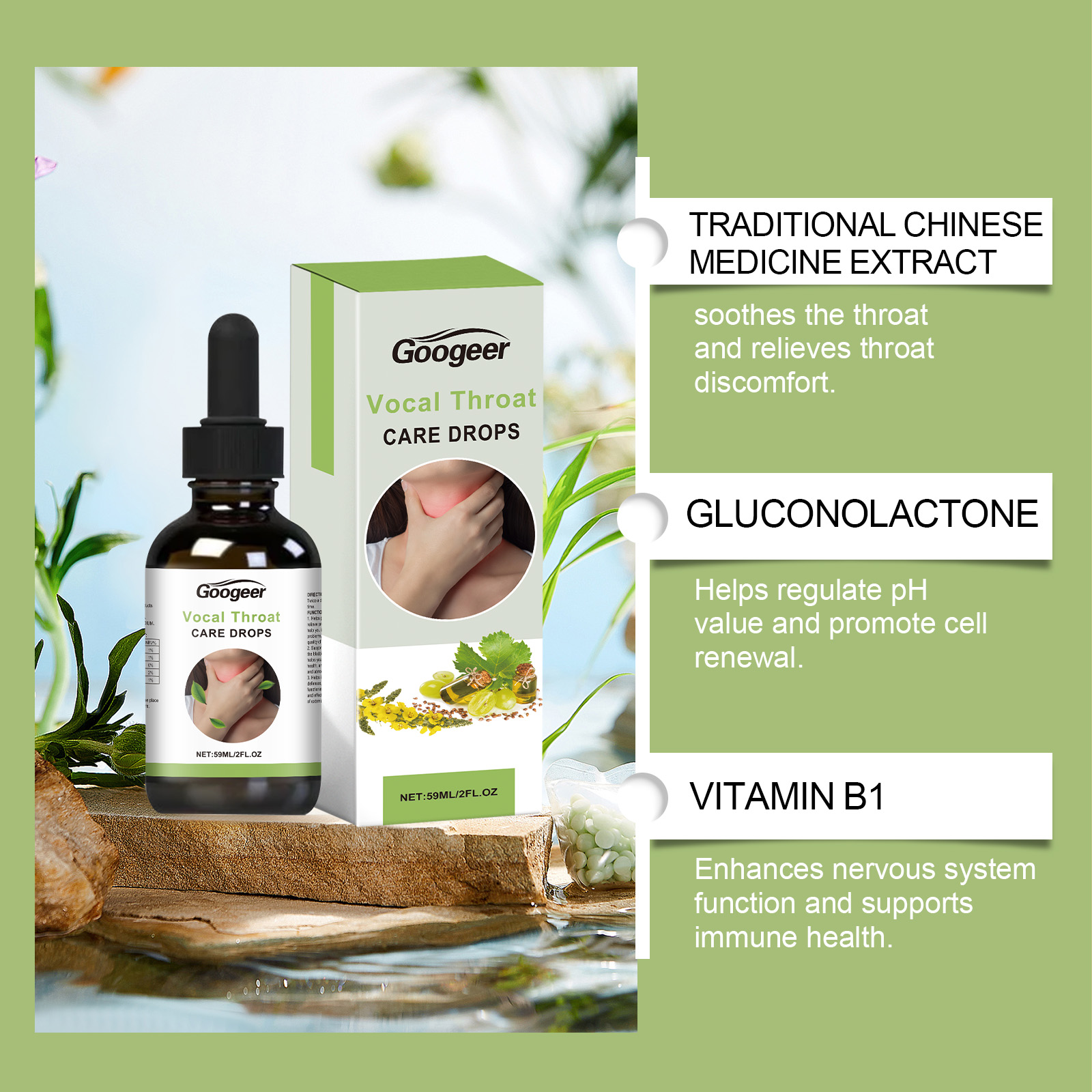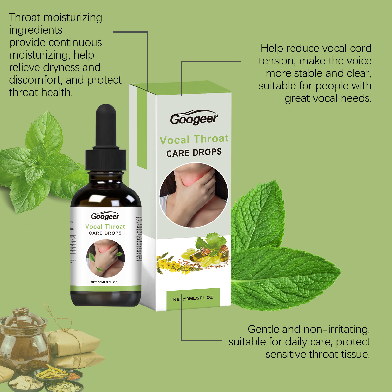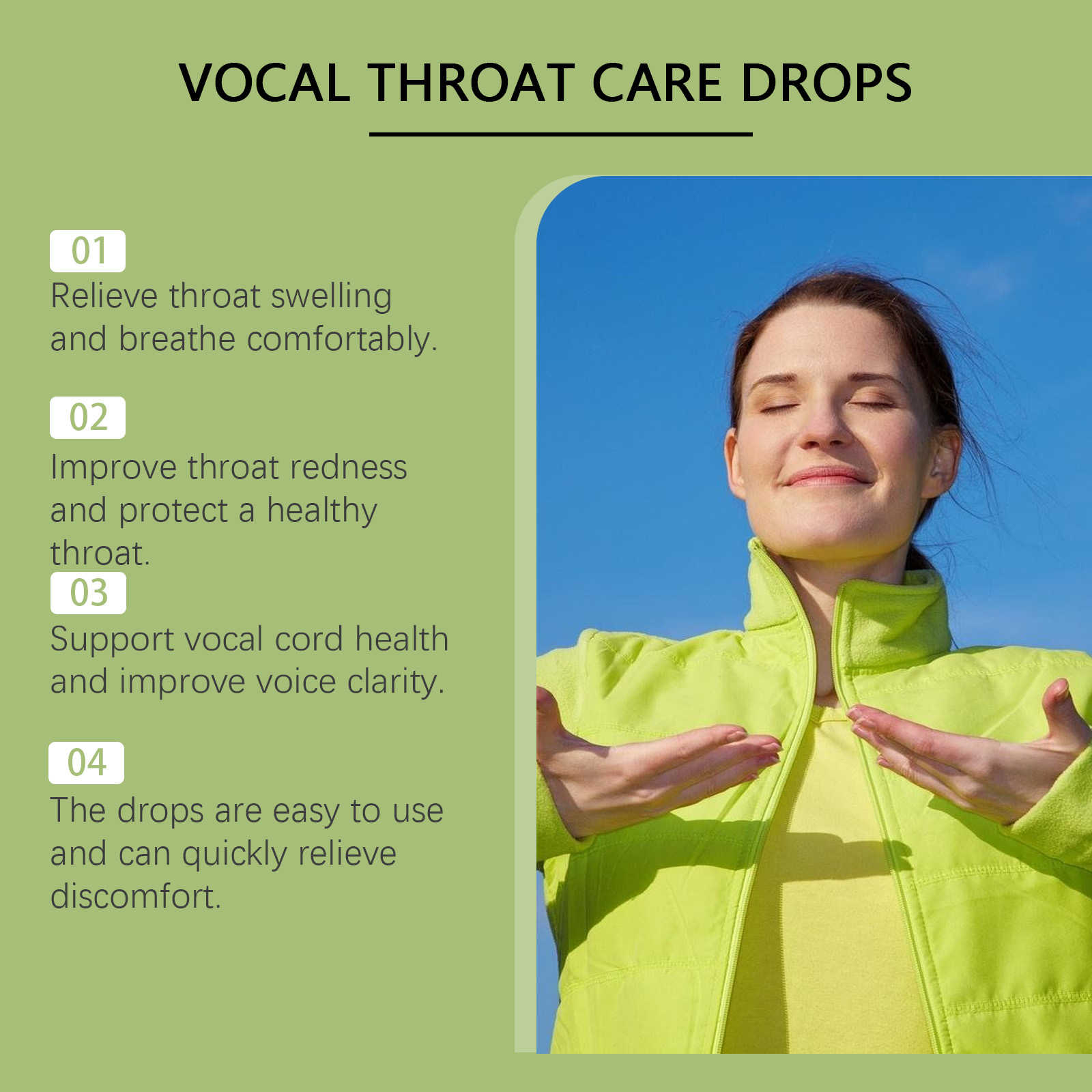 Our throat drops contain vitamin b1, potassium sorbate and mint leaf extract. It can effectively relieve throat swelling, redness and other discomfort, make the throat more comfortable. The way to use it is very simple: shake it well before eating, 1-2 drops each time, 1-2 times a day. It can also improve the condition of the vocal cords and make the voice clearer.