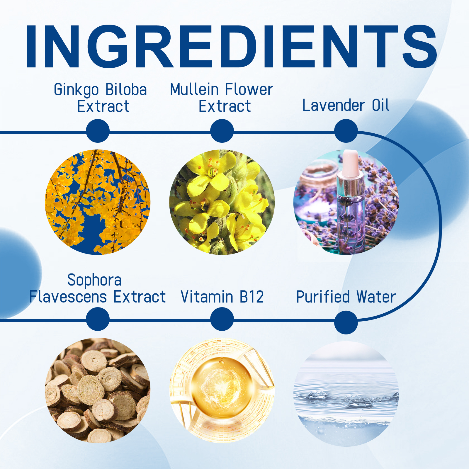 Our tinnitus relief spray contains Ginkgo biloba extract, heavy coat oil, and matrine extract. It can reduce tinnitus, reduce ear discomfort, reduce ear sensitivity to noise, fresh smells, help people improve concentration, reduce distractions, communicate better with others, and improve life and work efficiency. The way to use it is simple: First shake the bottle before each use to make sure the ingredients are well mixed and remove the cap. Holding the bottle upright, carefully place the mouth of the bottle close to the entrance of the affected ear and gently squeeze the bottle to drop a few drops of the solution into the ear canal. Do not insert the nozzle too far into the ear canal, and finally leave the solution in the ear for several to ten minutes. Then turn your head to the side or gently blot the excess solution in your ears with a tissue to help calm the mind, soothe ear nerves, relieve headaches and discomfort, and help you sleep.