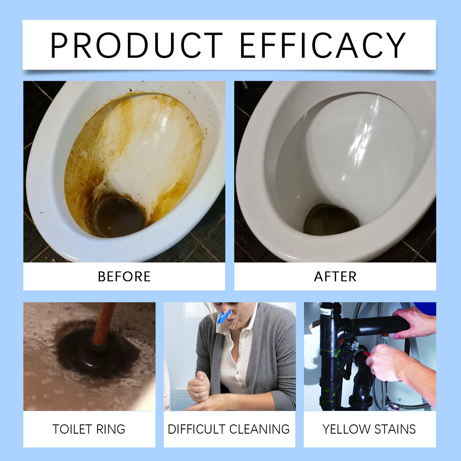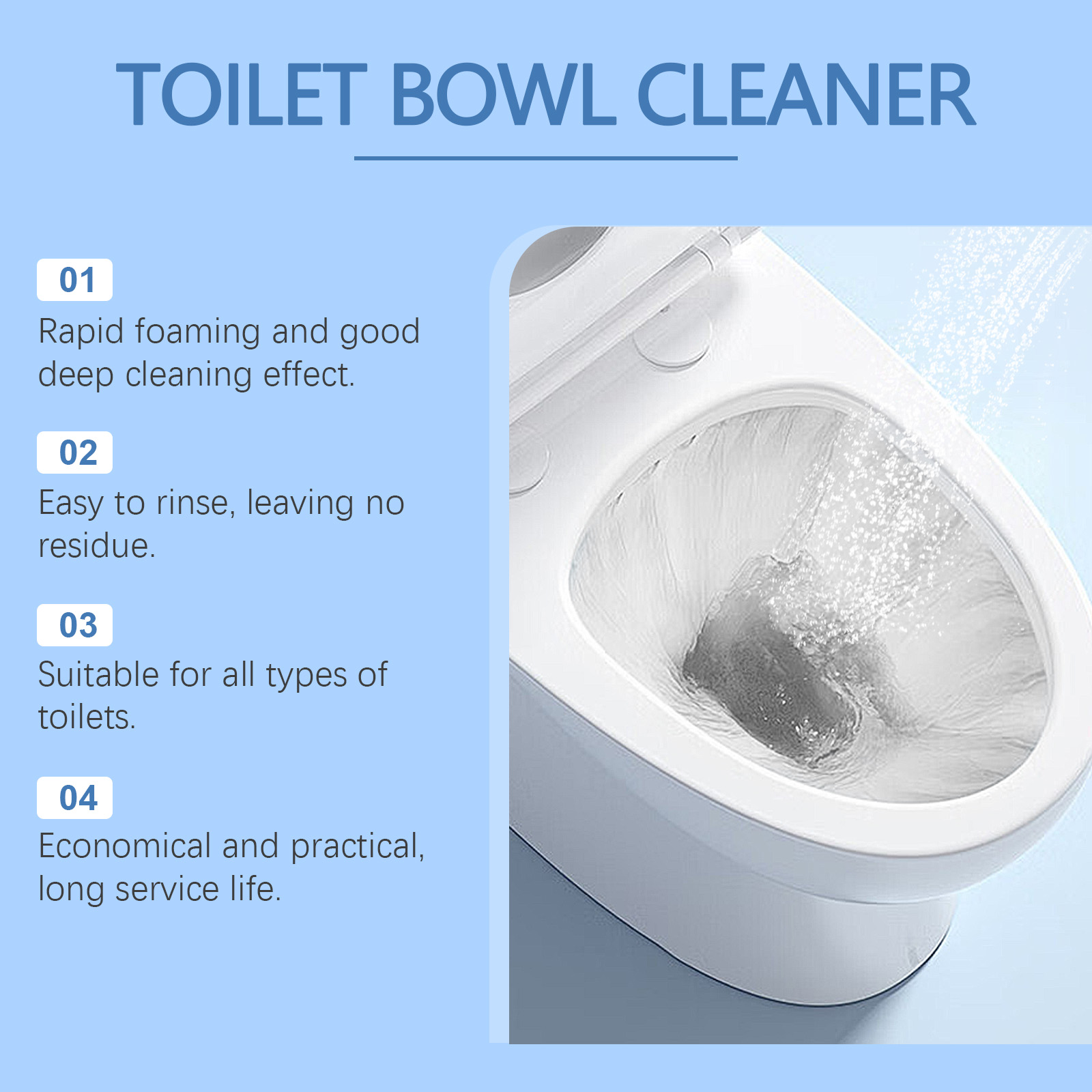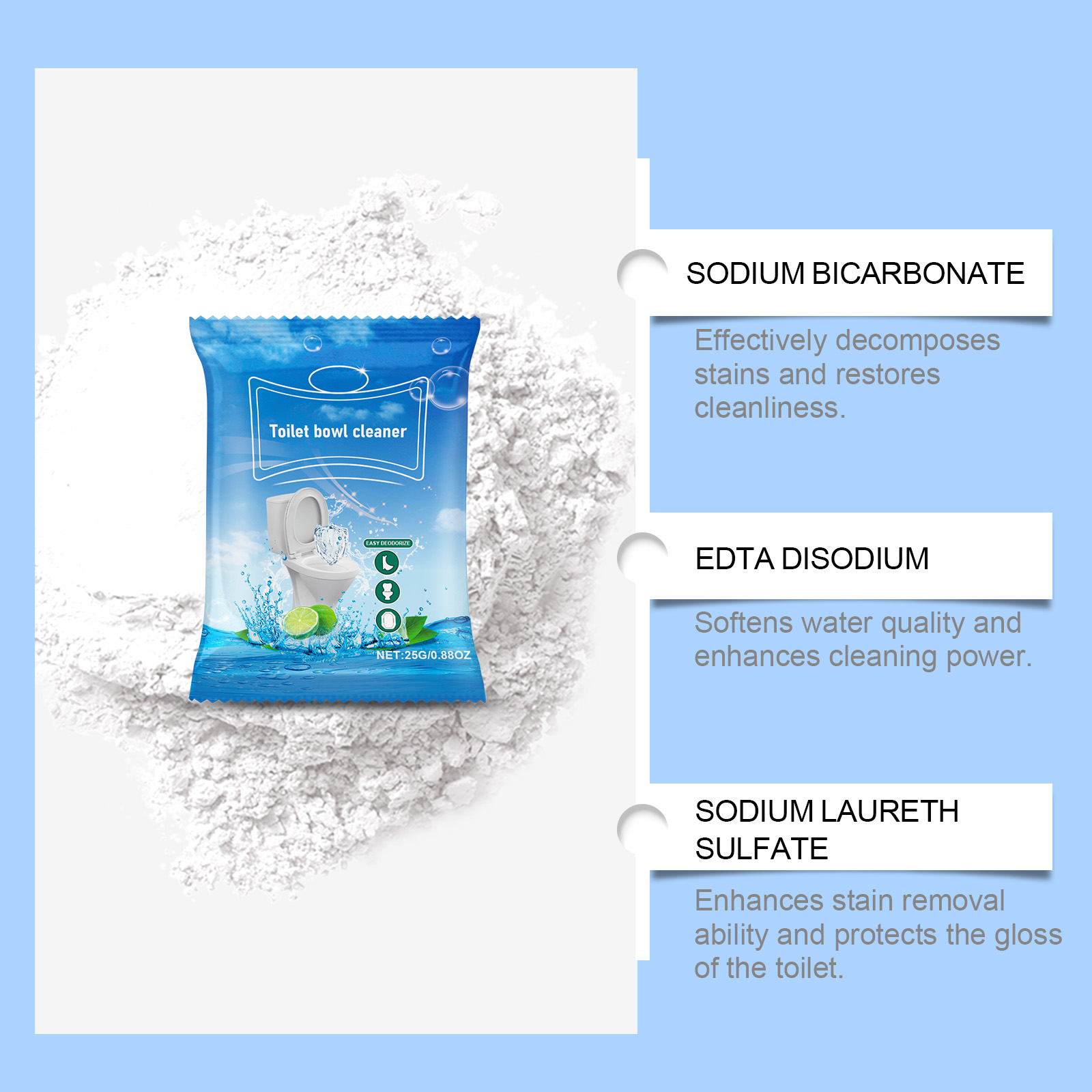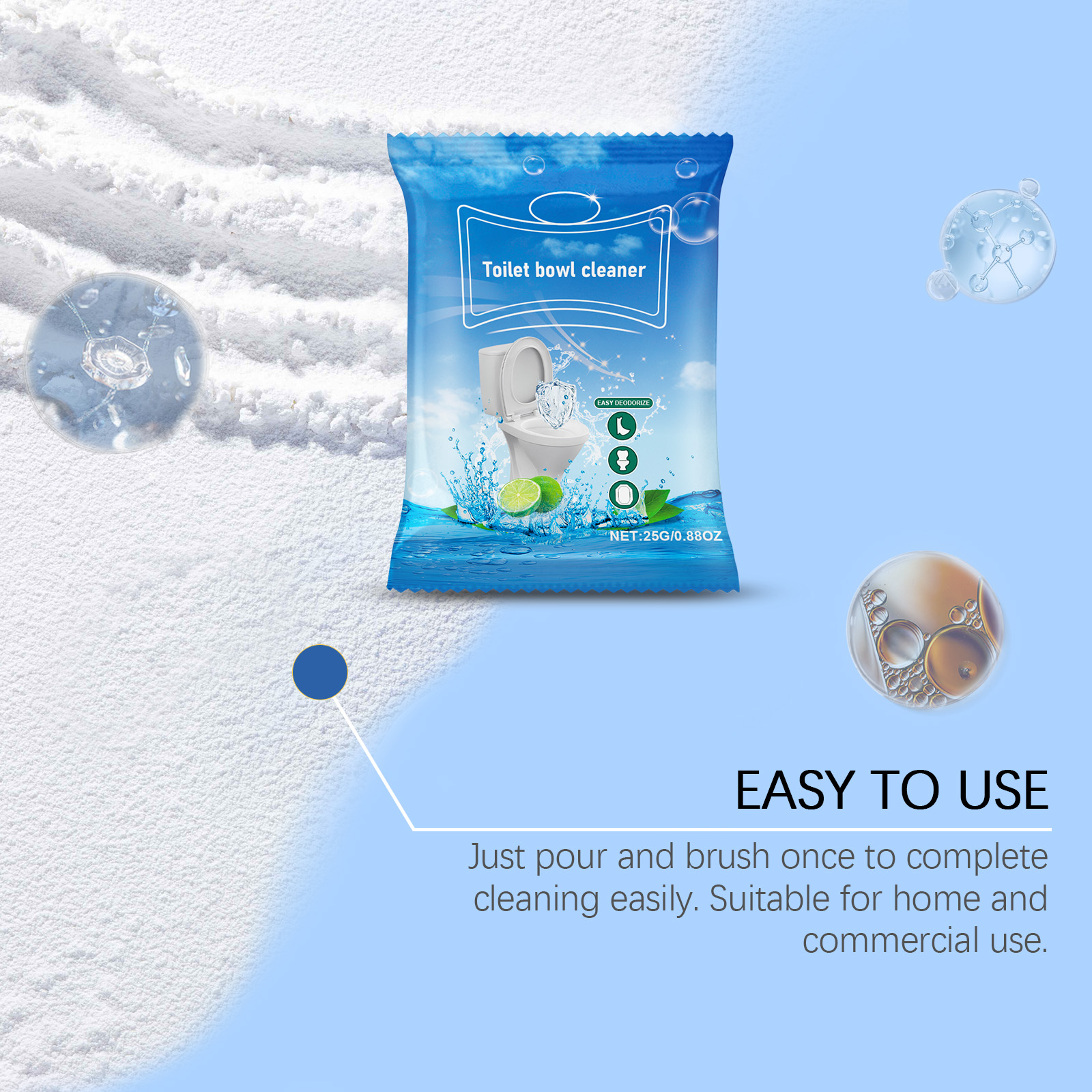 Our toilet cleaning powder contains sodium bicarbonate and citric acid. It can quickly remove dirt, keep clean for a long time, and help improve the toilet environment. Improve the overall hygiene of the bathroom. Its use method is very simple: 1. Pour hot water into the toilet and add an appropriate amount of washing powder. 2. Let stand for 2 hours. 3. By lightly brushing the toilet with a brush, dirt can be easily removed, leaving it looking like new. Formula safe, deep cleaning, safe and harmless, not easy to residue, not easy to hurt hands. Scientific descaling, no damage to tooth enamel, stains can be easily removed by rinsing, simple and hygienic.