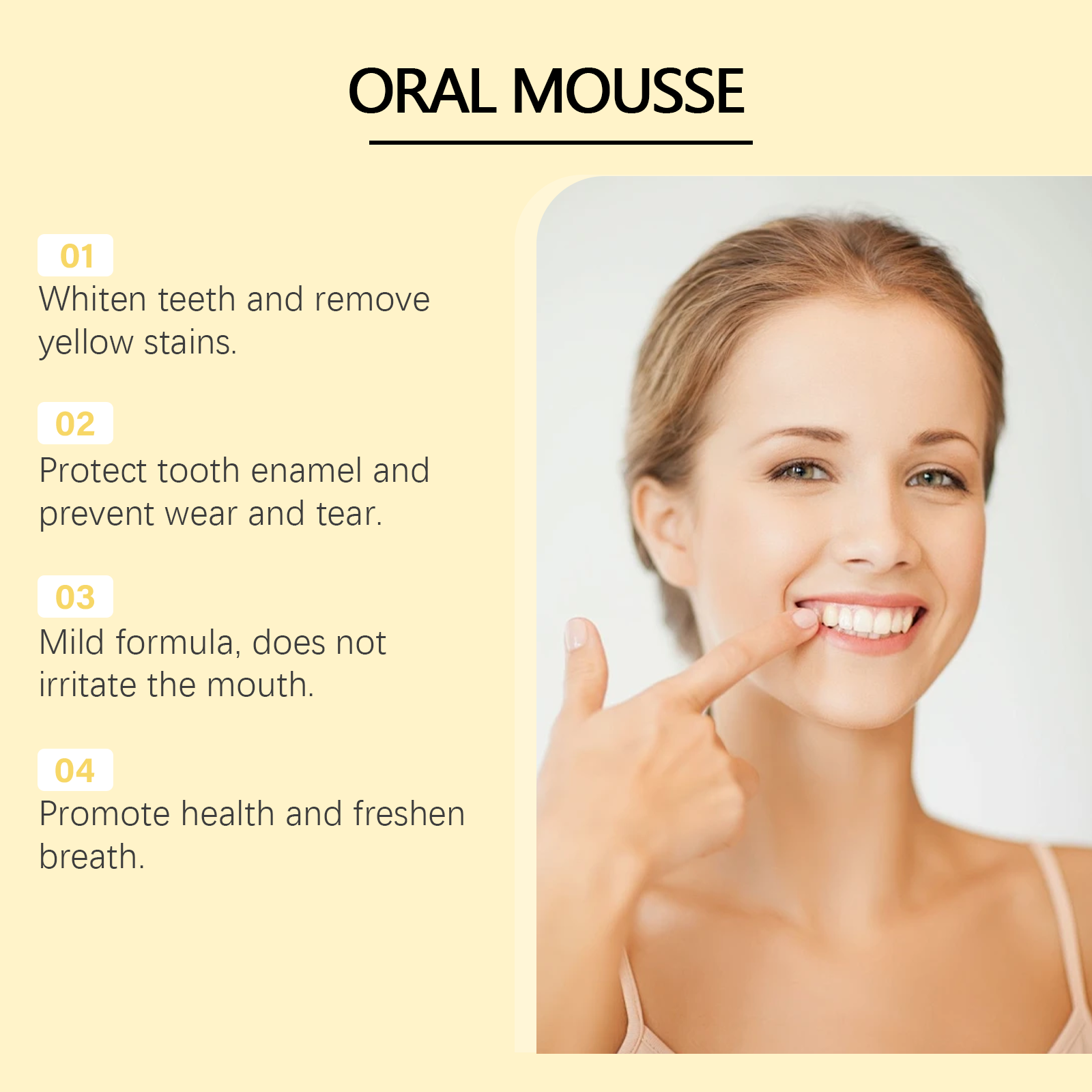 Our dental Mousse toothpaste contains sodium lauryl sulfate, 1, 2-hexadiol. It protects tooth enamel from acid attack and enhances tooth protection. The way to use it is very simple: take the right amount of this product on the toothbrush and brush gently for 3 minutes with the correct brushing method. Rinse your mouth thoroughly with water. It can effectively remove yellow stains and stains on the surface of teeth, promote dental health, maintain oral hygiene, and prevent tooth decay and gum problems.