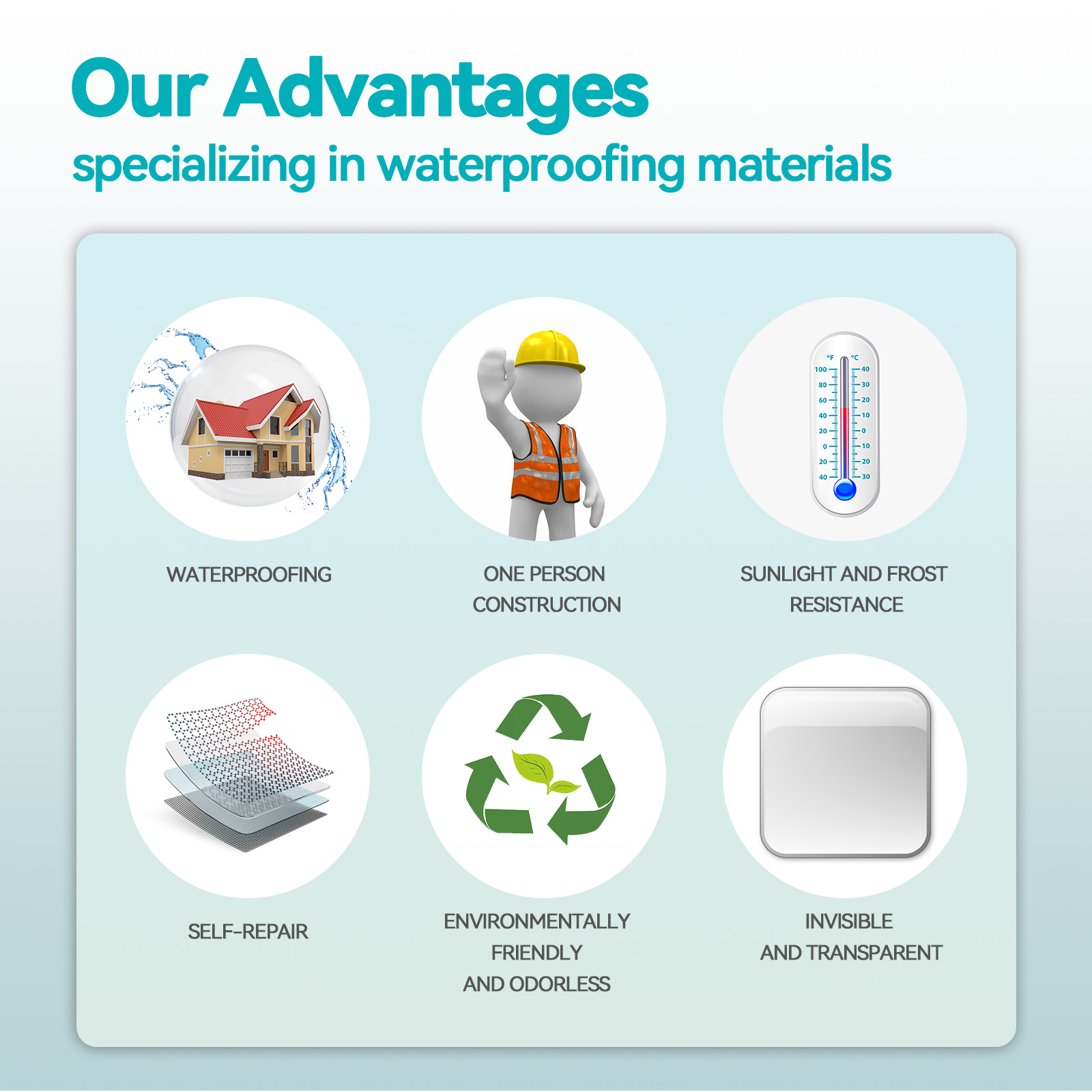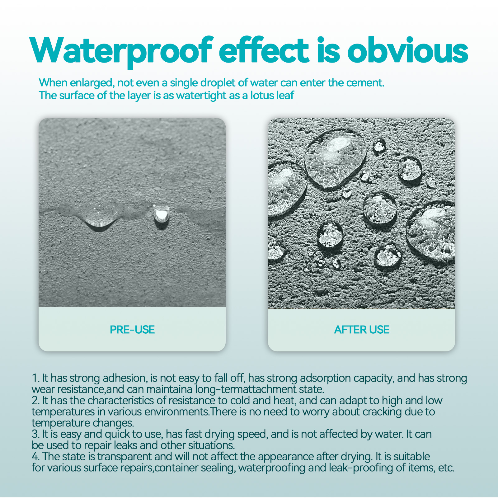 Our transparent waterproof adhesive contains pure acrylic emulsion, silicone acrylic emulsion, defoamer. It can have strong adhesion, not easy to fall off, strong adsorption capacity, strong wear resistance, and can maintain adhesion for a long time. It has the characteristics of cold resistance and heat resistance, and can adapt to high and low temperatures in various environments. There is no need to worry about cracking due to temperature changes. Its use method is very simple: 1. Clean the work surface to avoid water; 2. Find the leak and apply the first layer of waterproof glue; 3. After 6-8 hours, apply another coat; 4. After the painting is completed, it has been brushed with waterproof glue to achieve waterproof effect. Easy to use, fast drying speed, not affected by moisture. It can be used to fix leaks and other situations. The state is transparent, and the appearance will not be affected after drying. Suitable for surface repair, container sealing, waterproofing and leakproof.