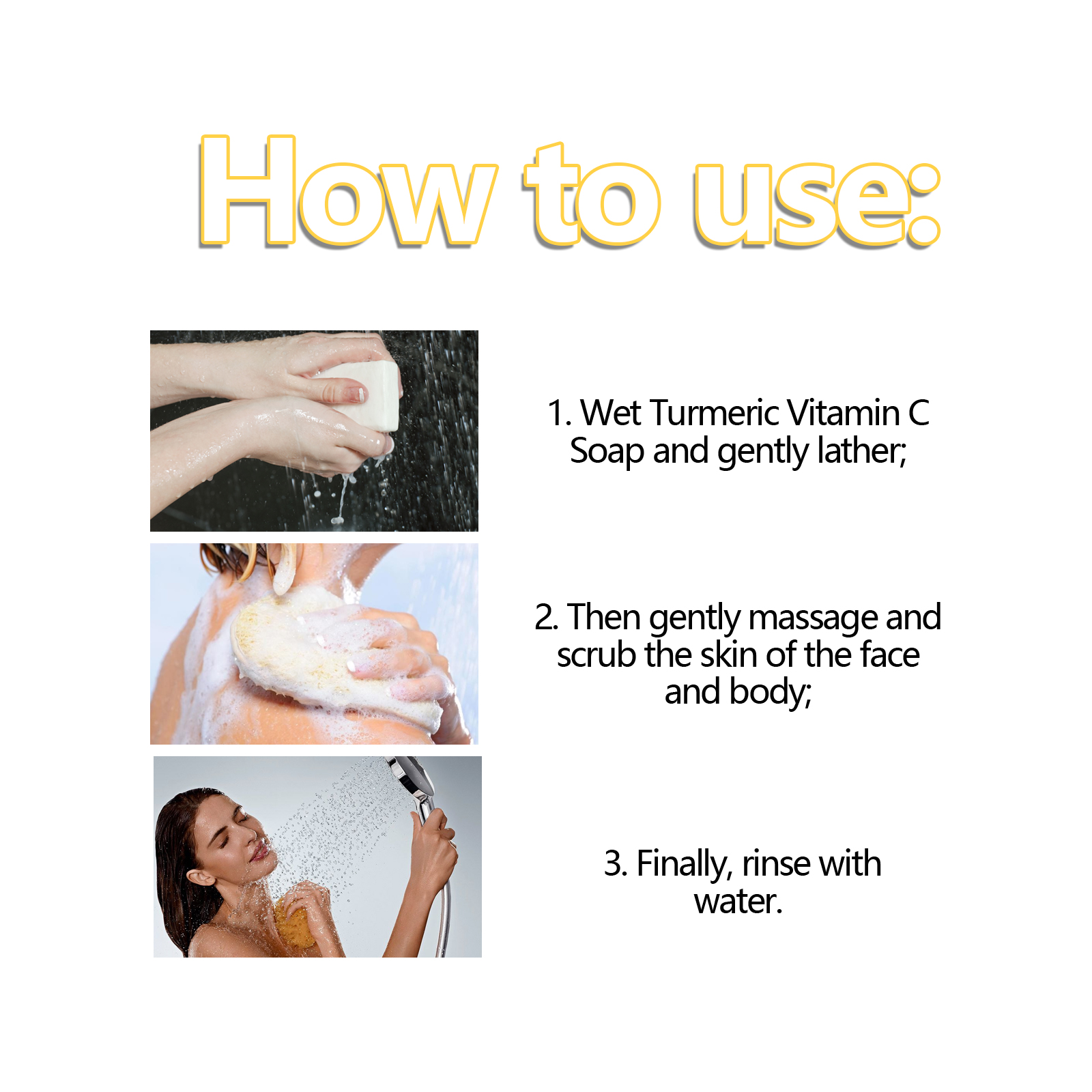 Our turmeric cleansing soap contains turmeric root extract, Ursa smoothie, oat extract. It can be used on the face and body to combat acne, dark spots, discoloration, etc., and improve the overall health of the skin. Its use is very simple: 1. Wet turmeric vitamin C soap and gently foam; 2. Then gently massage and scrub the face and body skin; 3. Finally, rinse with water. Turmeric cleansing soap bids farewell to melanin-rich skin problems and pigmentation. This turmeric soap for dark spots can improve uneven skin tone and help you restore your perfect complexion.