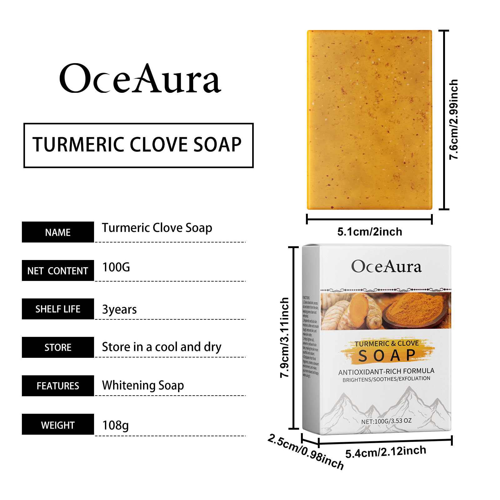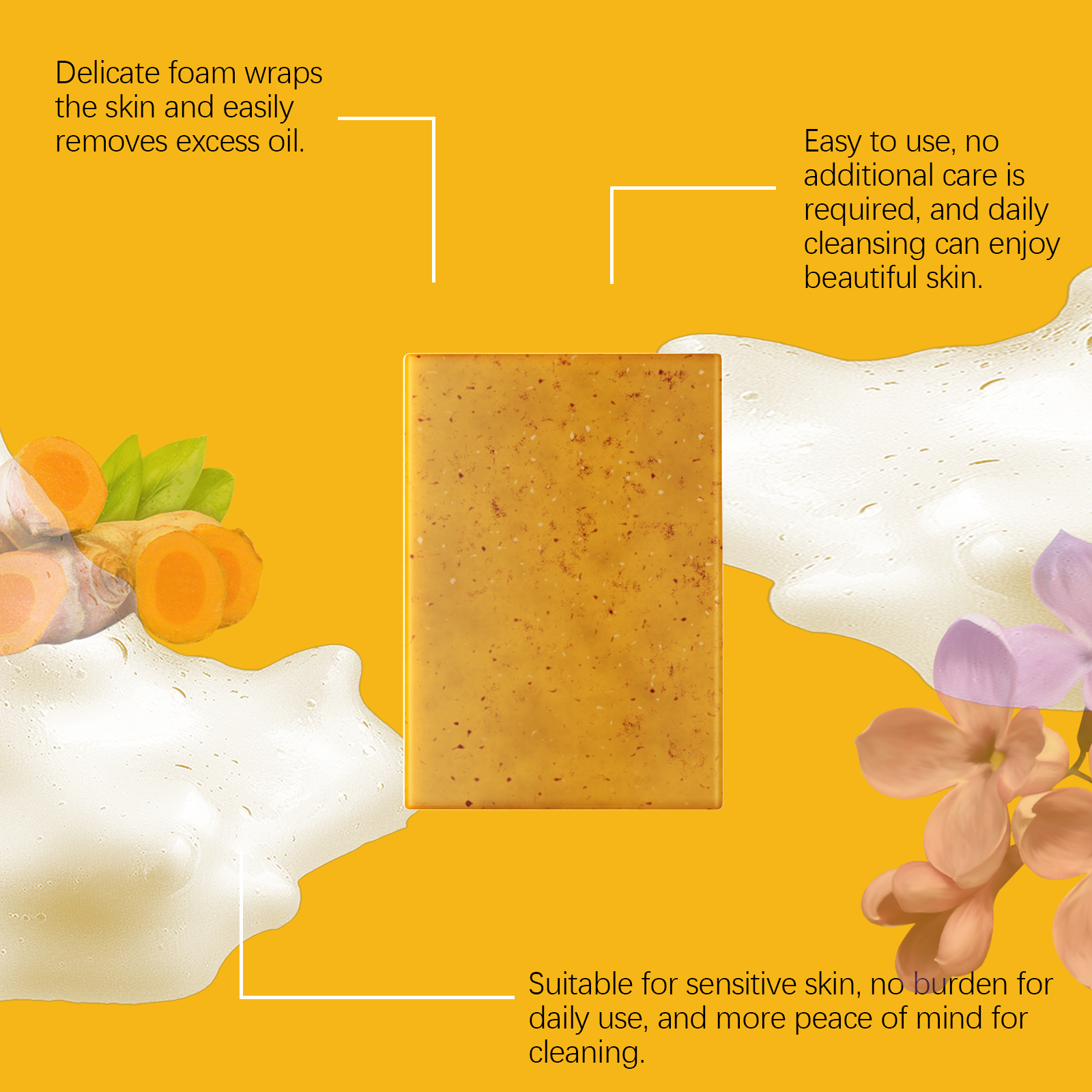 Our turmeric clove essential oil soap contains turmeric root extract, lilac flower extract. It can enrich the foam, remove the surface grease, and keep fresh. Effectively locks in moisture and moisturizes skin, improving skin moisture. The method of applying it is simple: wet the face or body with warm water, lather the soap with the palm of the hand, massage it into the skin in gentle circular motions, and finally, rinse the foam with warm water. And can be gently formulated to help exfoliate and help improve uneven skin tone.