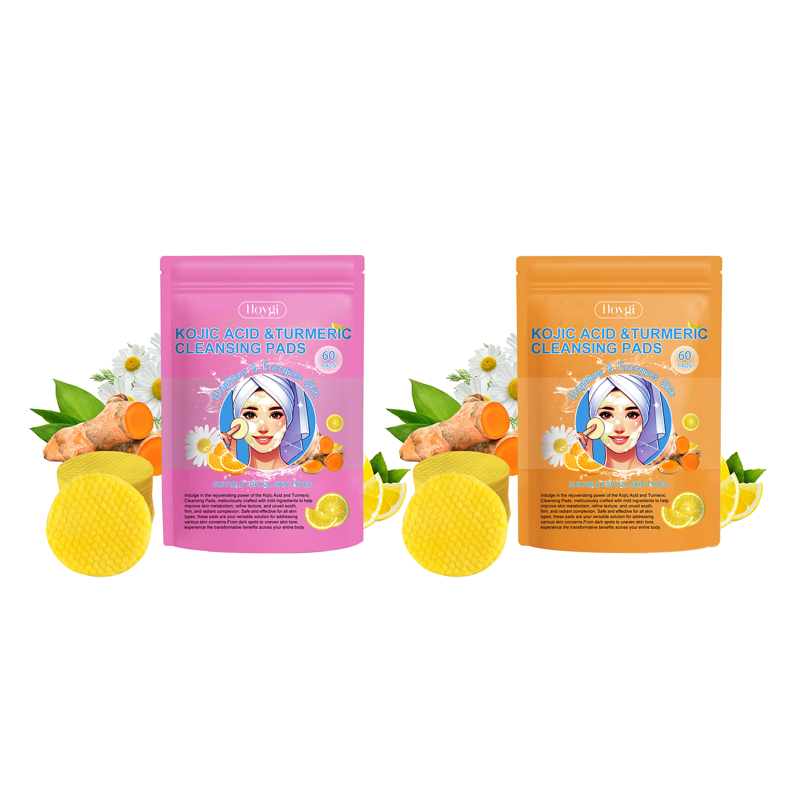 Our turmeric acid cleaning spacers contain glycerin, turmeric root extract, and kojic acid. It can effectively lighten the skin tone, even the skin tone, fade the stain. Its use method is very simple: 1. First, moisturize the facial skin; 2. Take one piece of this product, gently rub on face, massage in circular motion; 3. Finally, rinse with water to promote absorption. Turmeric and kojic acid ingredients deep clean pores and remove excess soil. The delicate fiber gently exfoliates and enhances skin shine.