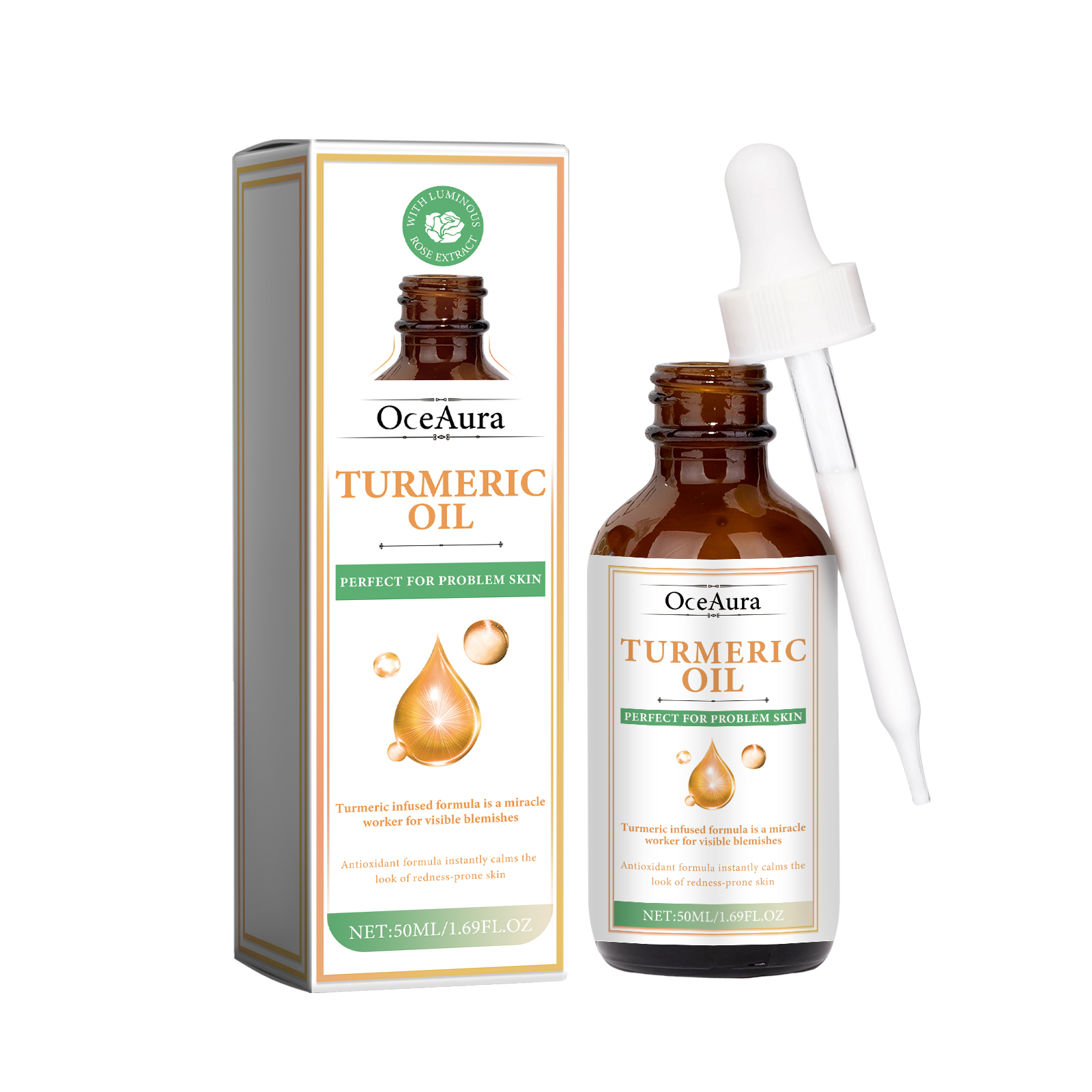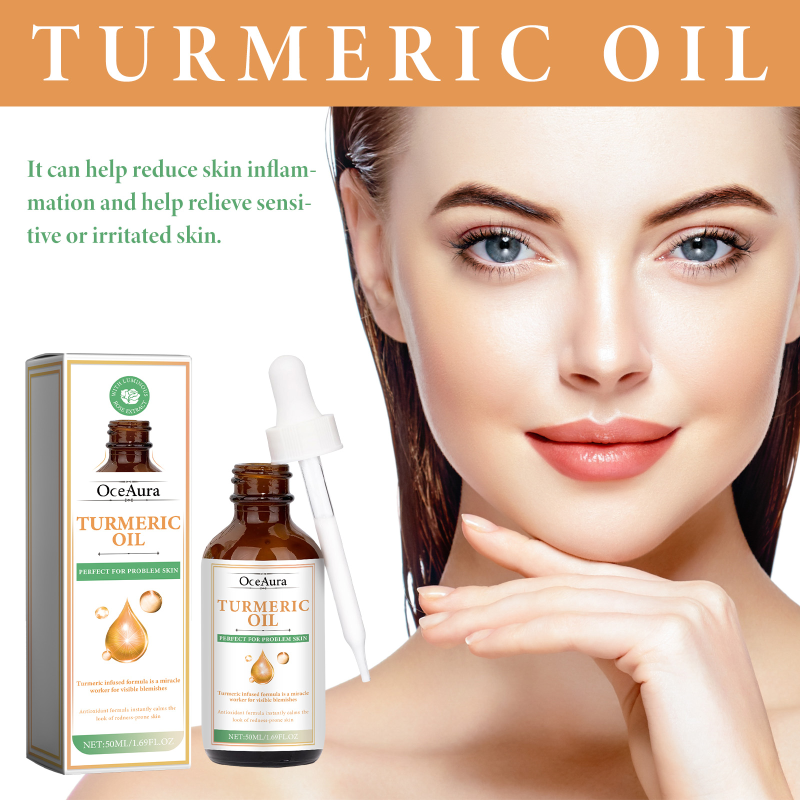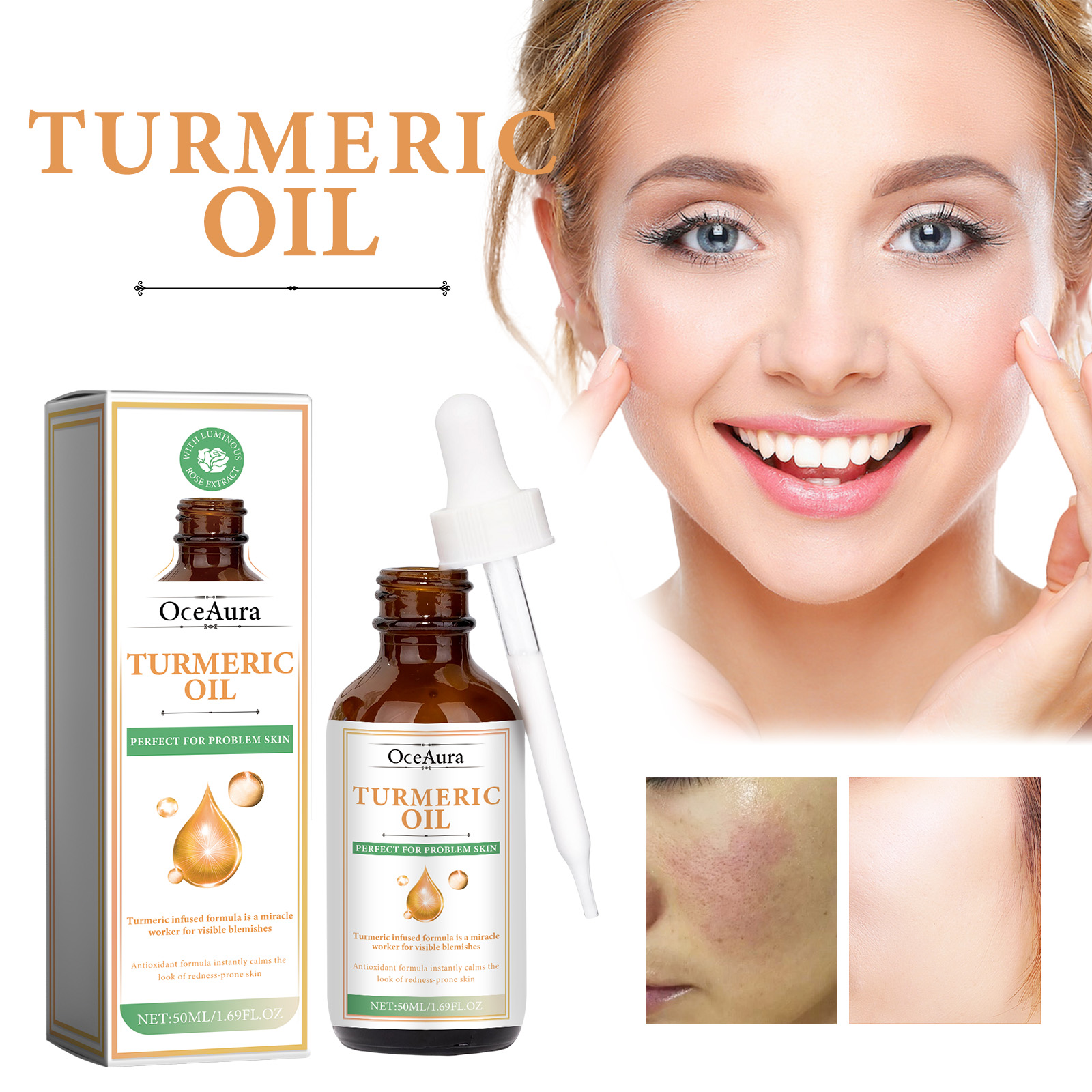 Our Turmeric Oil contains Curcuma Longa (Turmeric) Root Oil, Simmondsia Chinensis (Jojoba) Seed Oil, Persea Gratissima (Avocado) Oil. It can reduce skin pigmentation, make skin tone more even, help reduce skin inflammation, and help relieve sensitive or irritated skin. Its use method is very simple: after cleansing and toning, take appropriate amount of essence evenly apply to the face skin, gently massage with the hand to absorb. Helps fight the signs of skin aging, reduces the appearance of fine lines and wrinkles, deeply moisturizes the skin, reduces dryness and roughness, and keeps the skin hydrated.