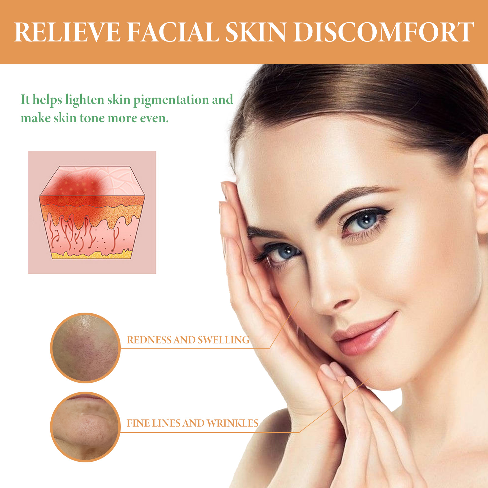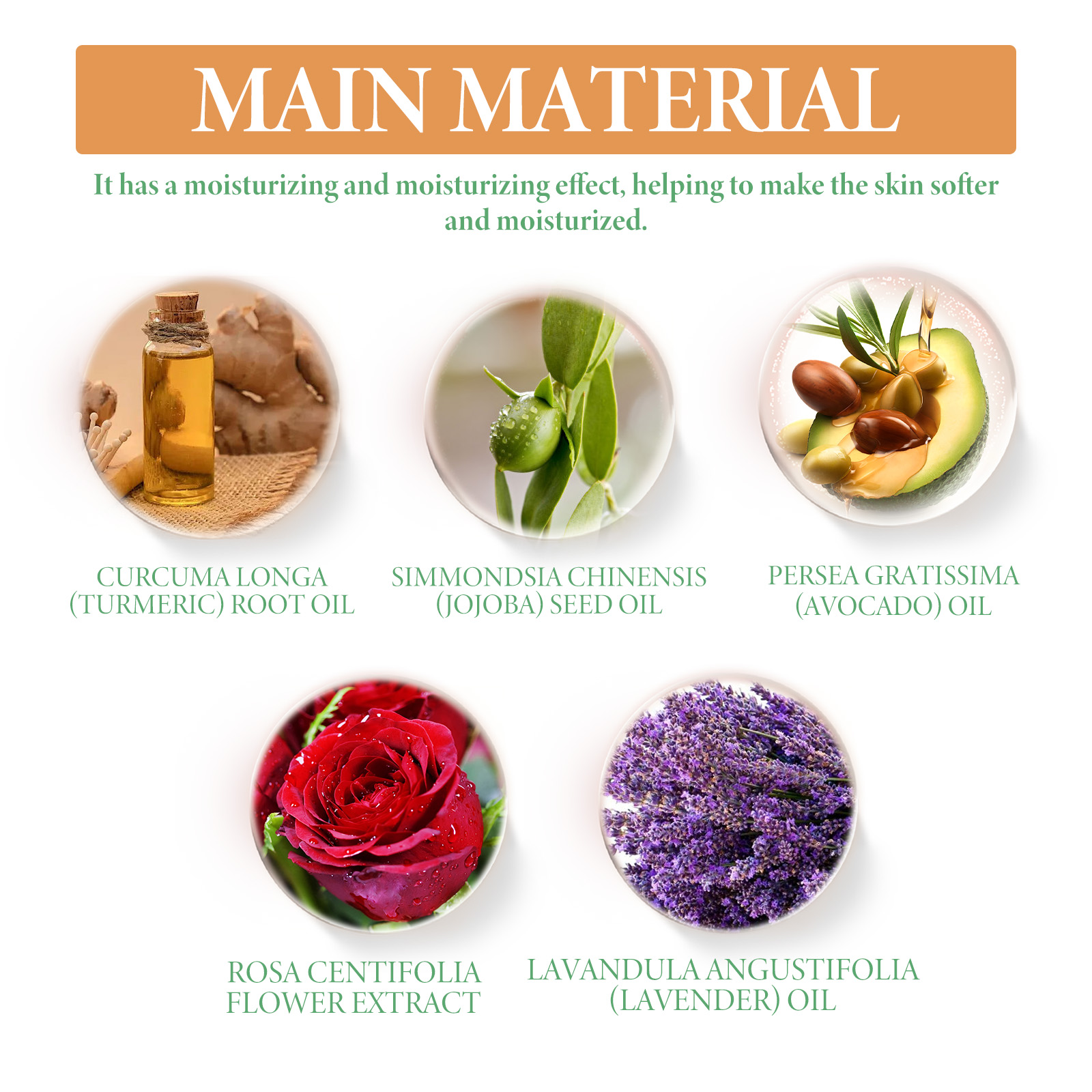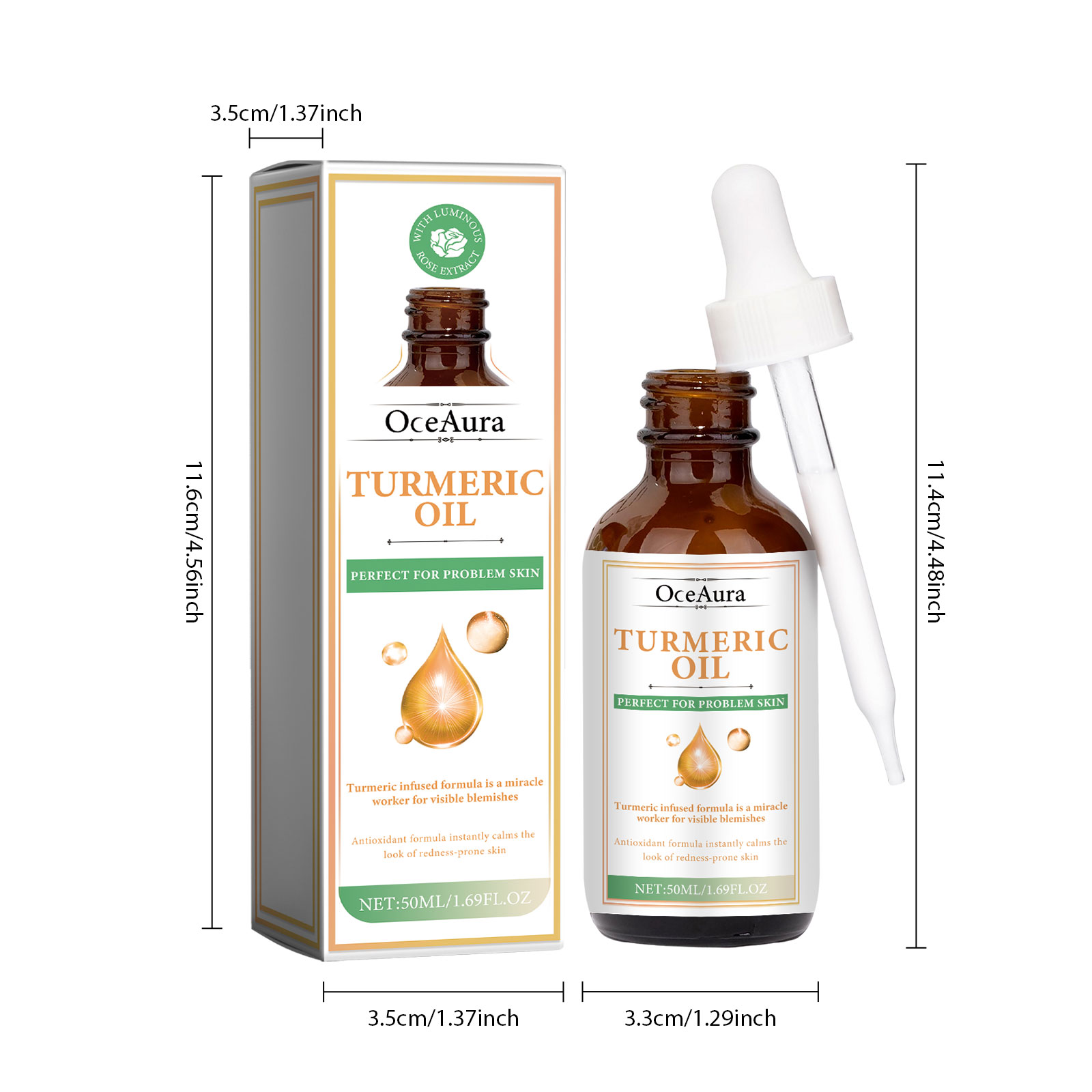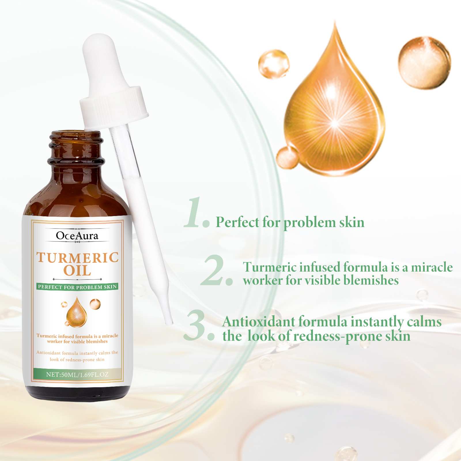 Our Turmeric Oil contains Curcuma Longa (Turmeric) Root Oil, Simmondsia Chinensis (Jojoba) Seed Oil, Persea Gratissima (Avocado) Oil. It can reduce skin pigmentation, make skin tone more even, help reduce skin inflammation, and help relieve sensitive or irritated skin. Its use method is very simple: after cleansing and toning, take appropriate amount of essence evenly apply to the face skin, gently massage with the hand to absorb. Helps fight the signs of skin aging, reduces the appearance of fine lines and wrinkles, deeply moisturizes the skin, reduces dryness and roughness, and keeps the skin hydrated.