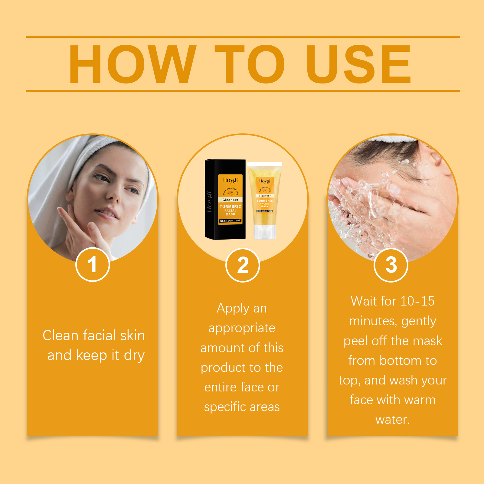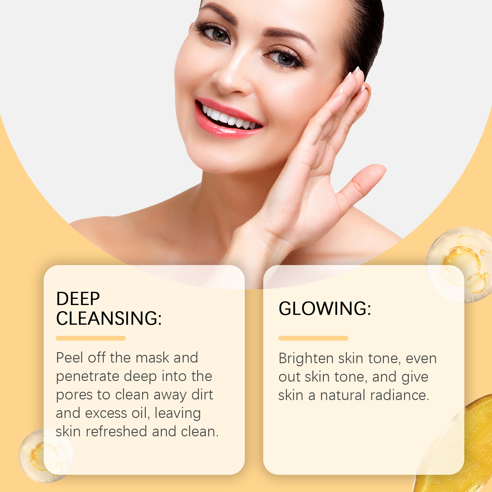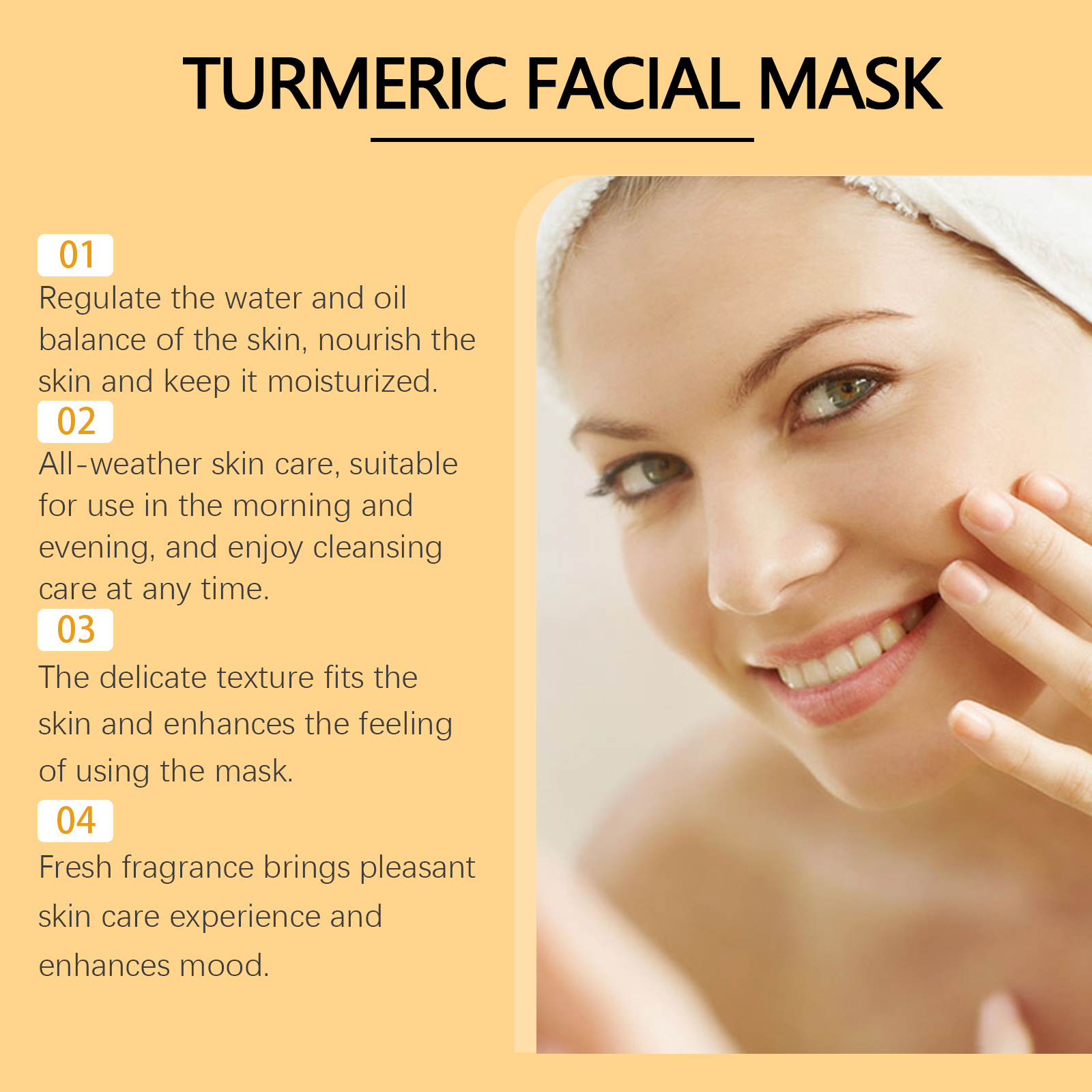 Our turmeric Peel mask contains turmeric root extract, chrysanthemum extract, mint leaf extract. It can gently remove aging dead skin cells, promote skin metabolism, and leave skin smooth and smooth. Its use method is very simple: 1. Clean facial skin, keep dry; 2. Apply appropriate amount of the product to the whole face or specific parts; 3. Wait 10-15 minutes, gently peel off the mask from bottom to top, and wash your face with warm water. Turmeric Peel Mask Lifts the mask, penetrates pores, removes dirt and excess oil, and rejuvenates skin. Lighten skin tone, even skin tone and give skin a natural glow.