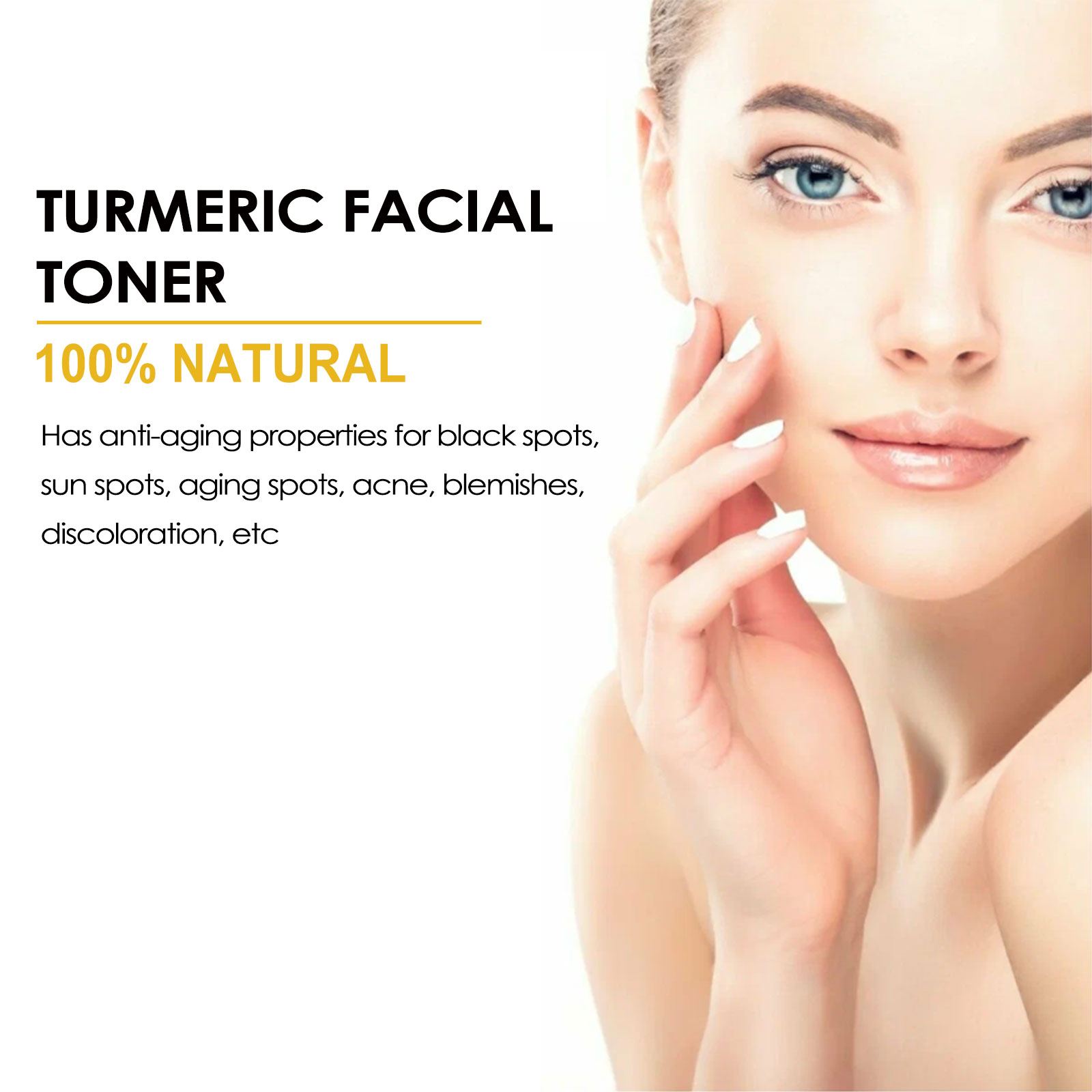 Our Turmeric Facial Toner contains Turmeric Extract, Licorice Extract, Rosehip Oil. It can achieve anti-aging effects, improve overall health bid farewell to hyperpigmentation, and usher in a soft and clear skin tone. Its use method is very simple: after cleansing, take appropriate amount of this product evenly apply to the face skin, and gently massage with the finger until absorbed. It can have anti-aging effect on dark spots, sun spots, aging spots, acne, blemishes, discoloration and so on.