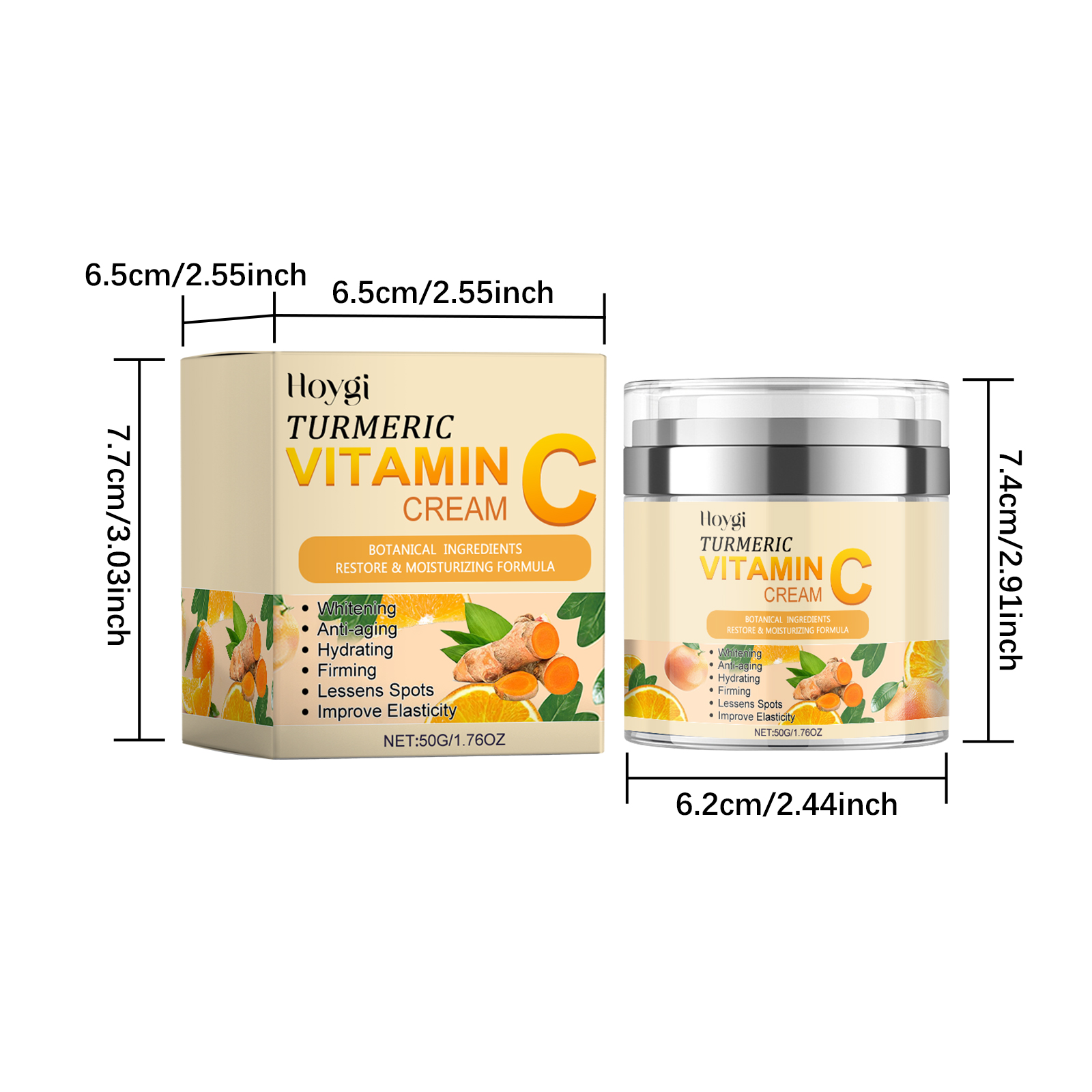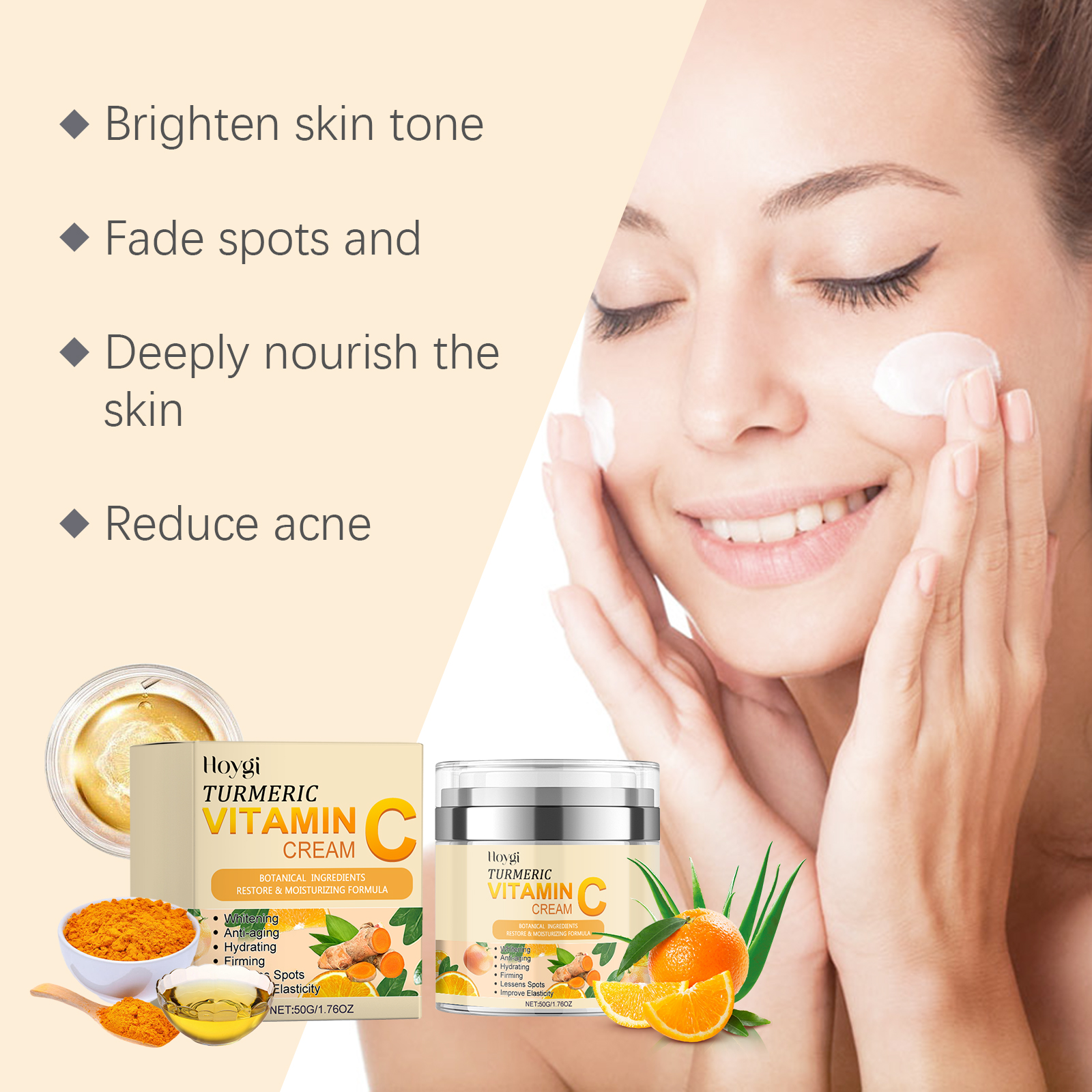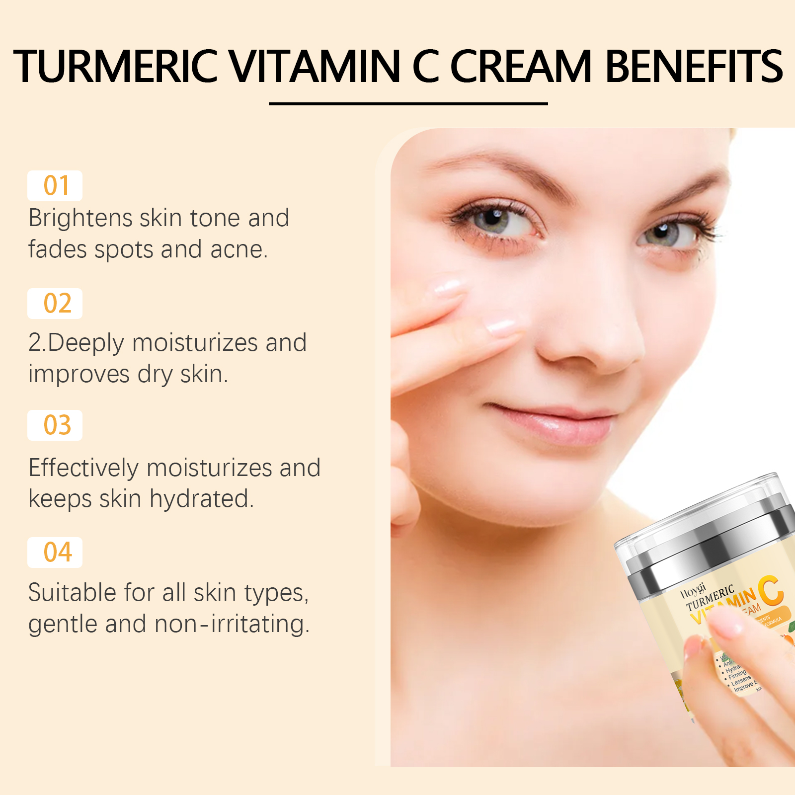 Our turmeric vitamin C brightening cream contains jojoba oil, hyaluronic acid. It can deeply moisturize and improve dry skin. The way to apply it is very simple: start by cleaning and conditioning your facial skin, and apply the right amount of cream evenly to your face. You can massage it gently with your fingertips until it is completely absorbed into the skin. It can also strengthen the skin barrier, prevent water loss, and maintain water and oil balance.