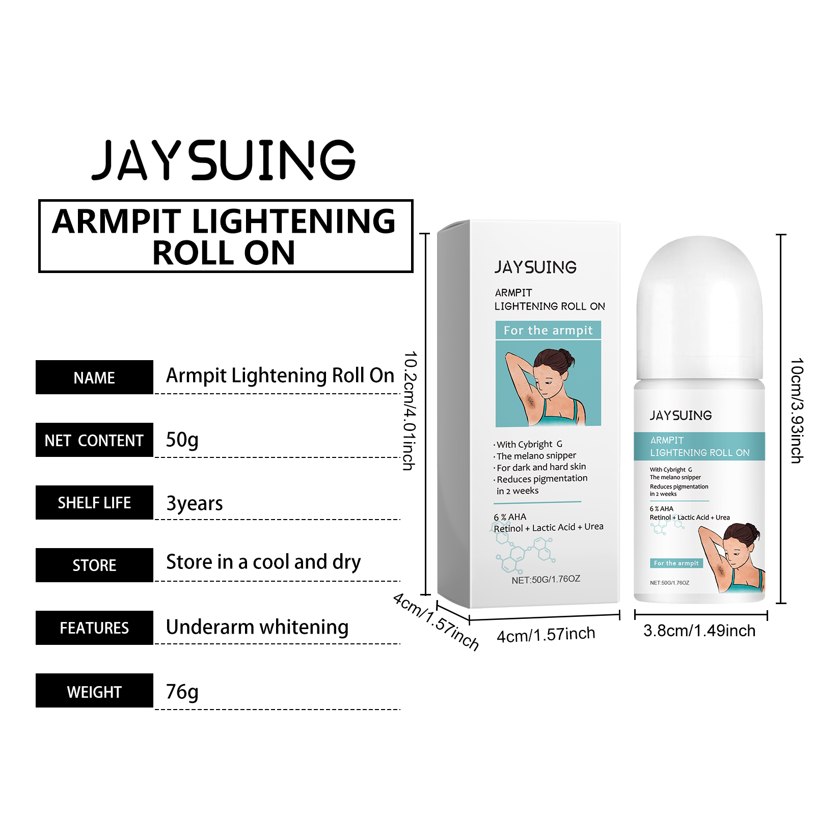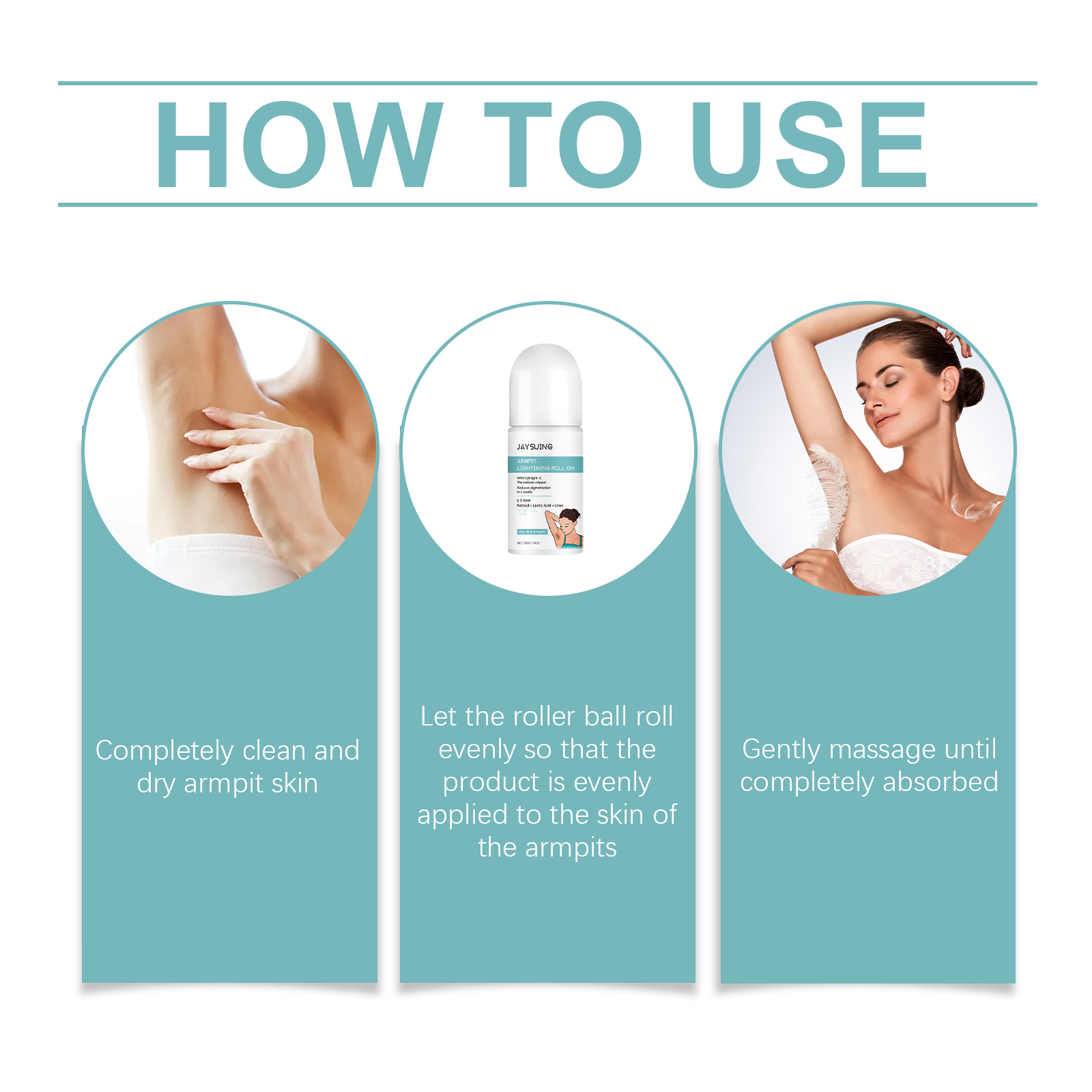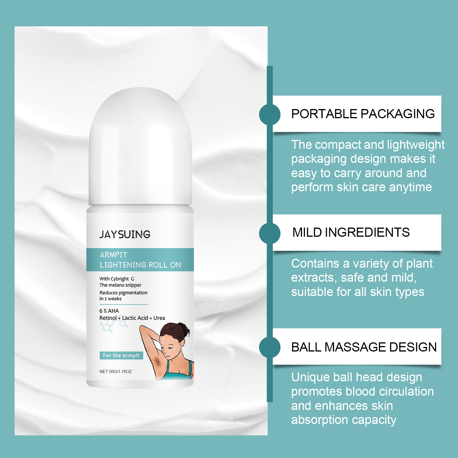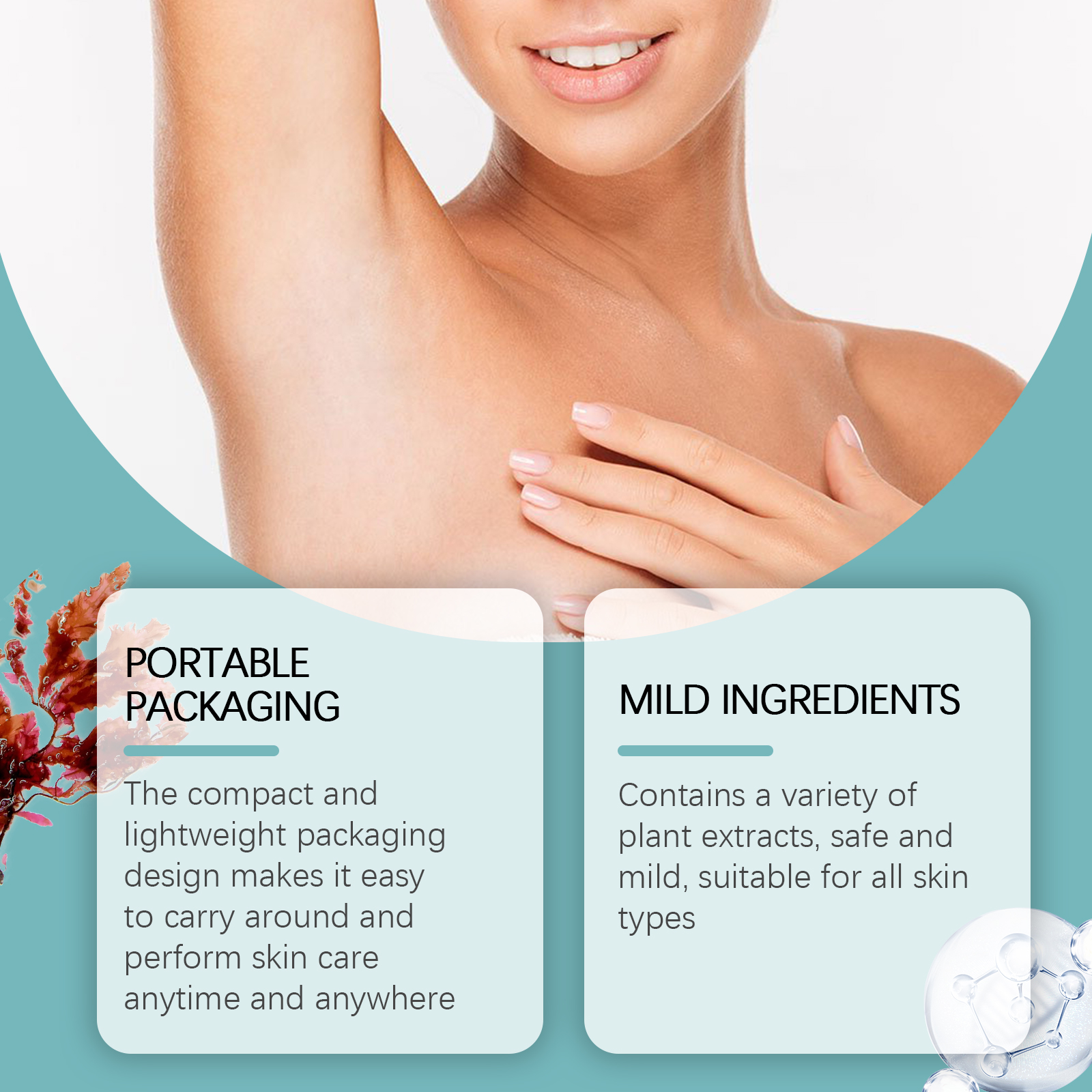 Our armpit beauty balls contain lactic acid, retinol, and tea tree oil. It can reduce armpit pigmentation and whiten armpit skin within 2 weeks. It can effectively exfoliate and smooth underarm skin. Its application method is simple: 1. Thoroughly clean and dry the underarm skin; 2. Let the ball roll evenly, so that the product evenly spread on the armpit skin; 3. Gently massage until fully absorbed. Compact and lightweight packaging design makes it easy to carry and perform skin care; Contains a variety of plant extracts, safe and gentle, suitable for all skin types anytime, anywhere.