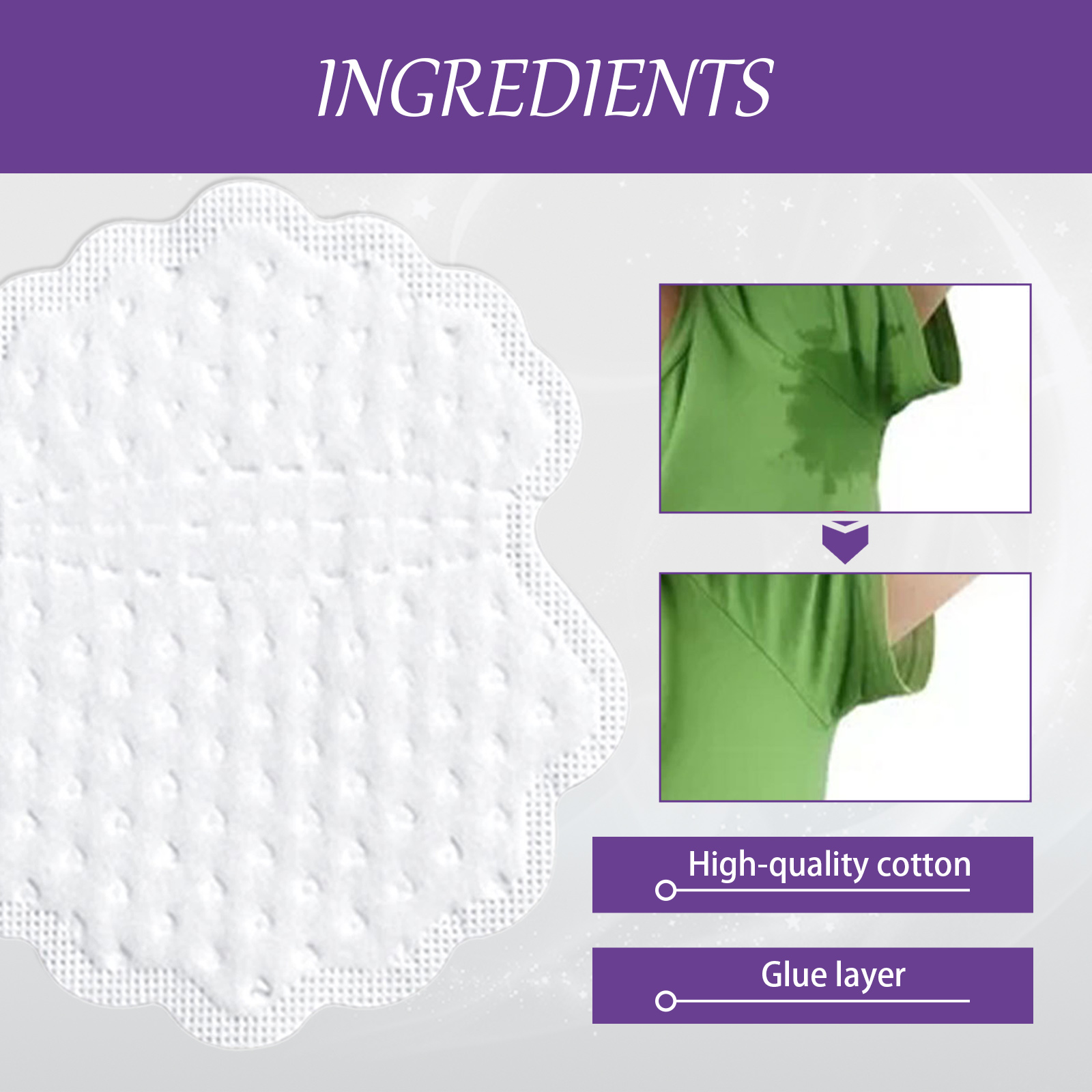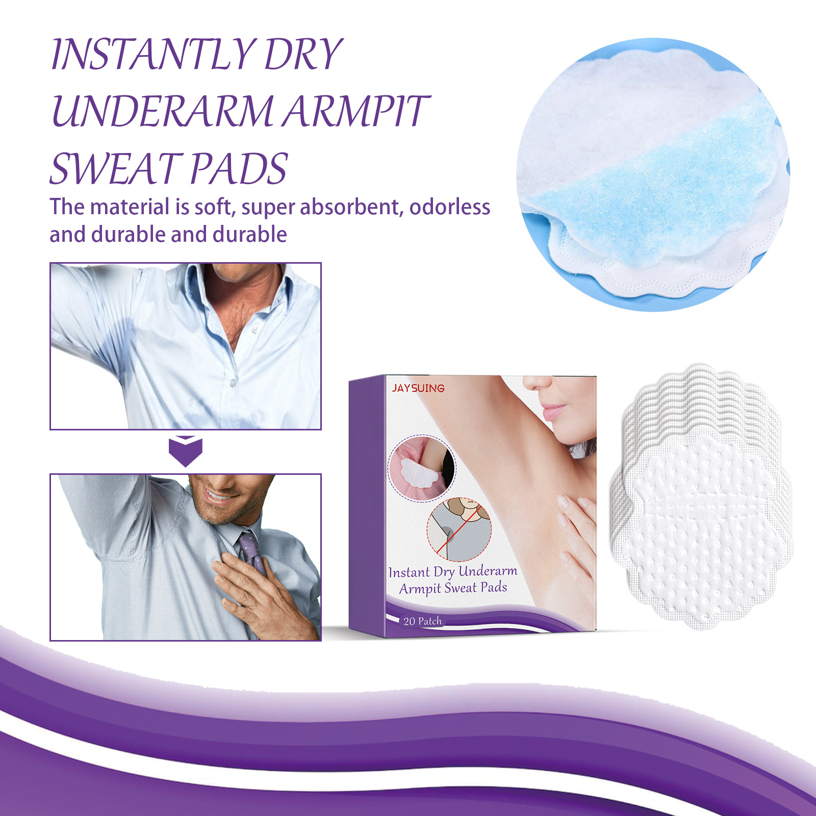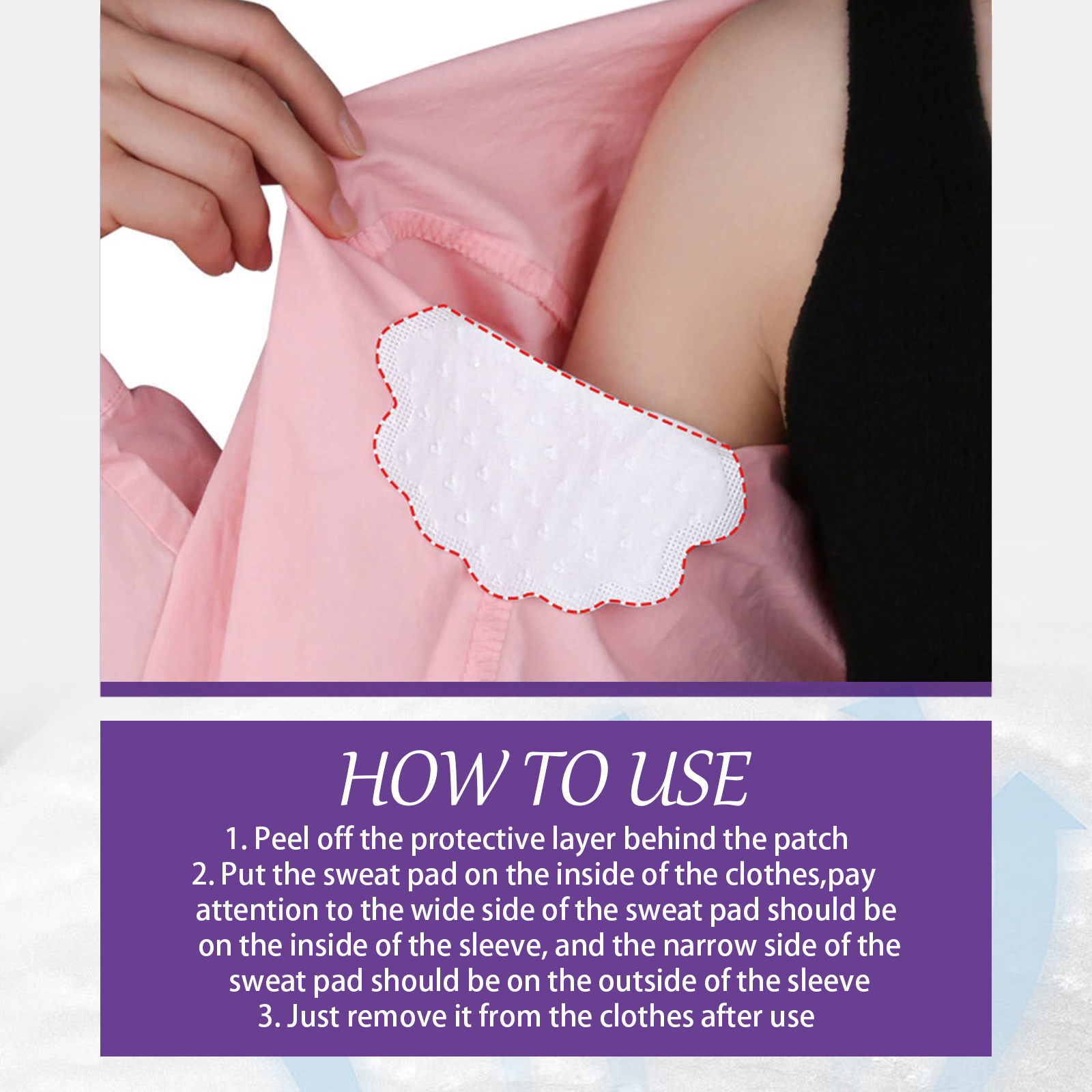 Our armpit sweat pads contain a premium cotton, glue layer. It can quickly absorb underarm sweat, keep armpit dry and fresh, clean odor, fresh and invisible, lasting absorption of sweat. Its use method is very simple: strip the protective layer behind the patch; Put the sweat pad on the inside of the clothes, pay attention to the wide side of the sweat pad should be attached to the inside of the sleeve, and the narrow side of the sweat pad should be attached to the outside of the sleeve; Remove it from your clothes after use. Armpit sweat pad material is soft, super absorbent, odorless, durable, breathable and absorbent, aromatic, reduce odor.