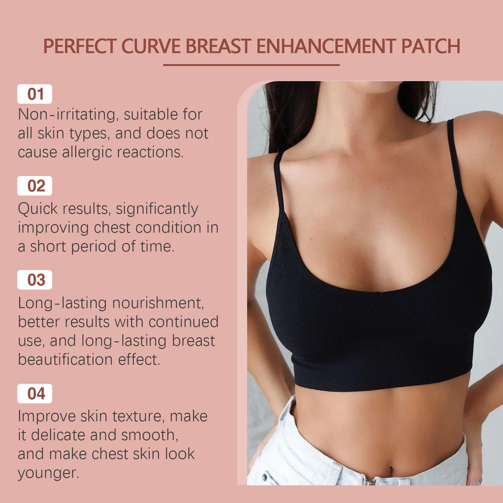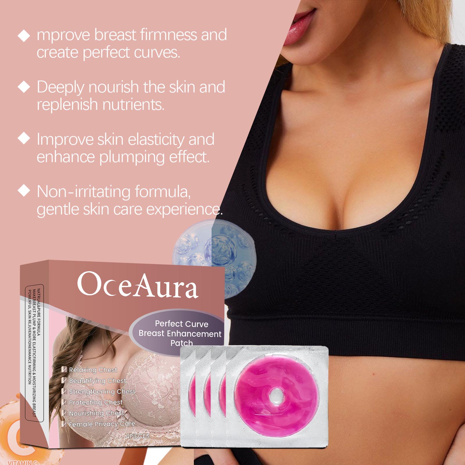 Our upper body skin patches contain hop extract, fenugreek extract, ascorbic acid (vitamin C). It can effectively improve breast firmness, make the breasts fuller and rounder, and the curves are charming. Made from plant extracts, it is safe, has no side effects and gently moisturizes the skin. The way to use it is simple: 1. First thoroughly wash and dry the chest skin. 2. Place the patch directly on the chest skin and gently press to ensure that the patch is firmly attached. 3. Wait 6-8 hours and then remove the patch. Deeply moisturize the chest skin, retain moisture for a long time, and improve dryness and roughness. Easy to use, the patch design is simple to use, suitable for daily care.