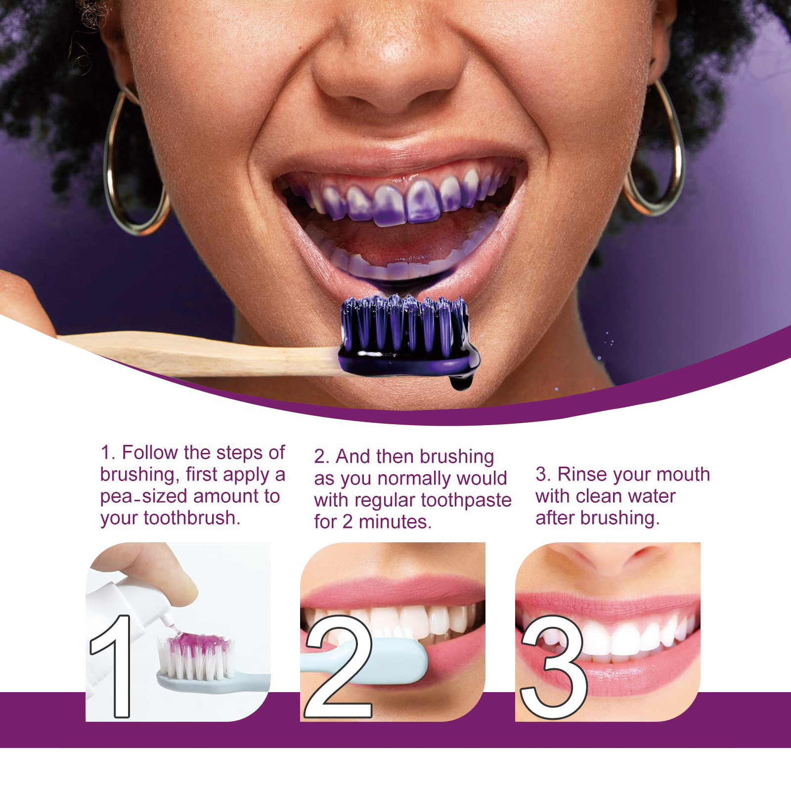Our tooth whitening toothpaste contains water, garlic extract, gallnut extract, etc. It can use color correction technology to lighten the teeth. By balancing different shades in the teeth, the V34 can hide stains and increase brightness. The way to use it is simple: apply a pea-sized amount to the toothbrush first, following the steps of brushing. Then brush your teeth with regular toothpaste for 2 minutes as usual, and rinse with water after brushing. Effectively remove tooth stains, whiten teeth, protect oral health, and make you smile.