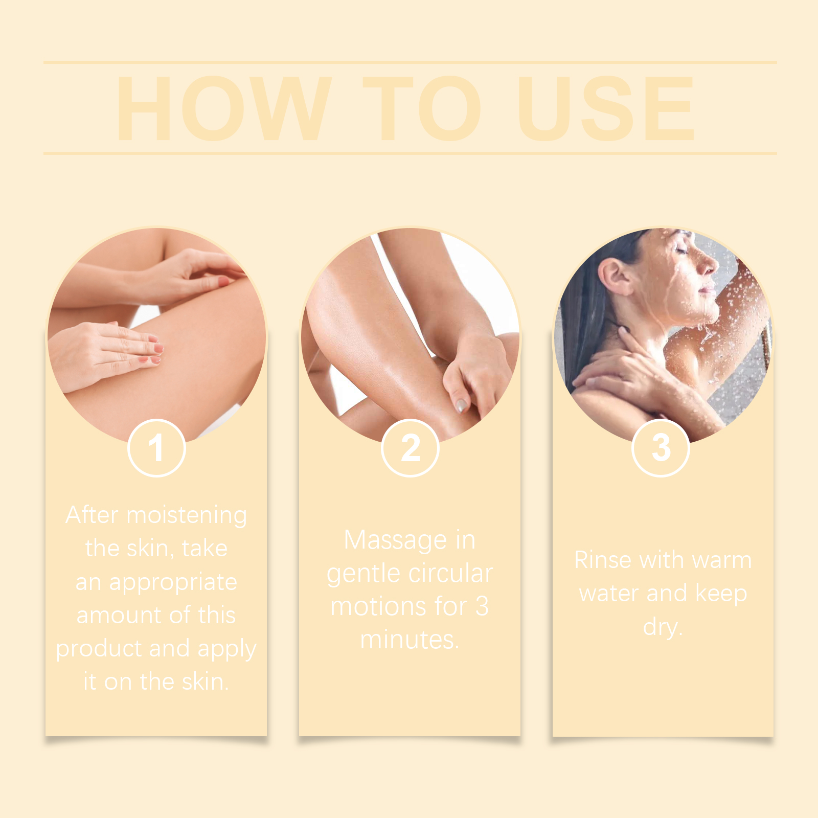 Our vanilla body scrub contains glycerin, vitamin E (tocopherol). It deeply nourishes the skin, helps to lock in moisture, keeps skin soft and smooth, and effectively relieves dryness and tightness. Its application method is very simple: after moisturizing, apply appropriate amount of this product to the skin, massage in gentle circular motions for 3 minutes, rinse with warm water, and keep dry. It is mild and non-irritating, safe for daily use, and restores skin health.