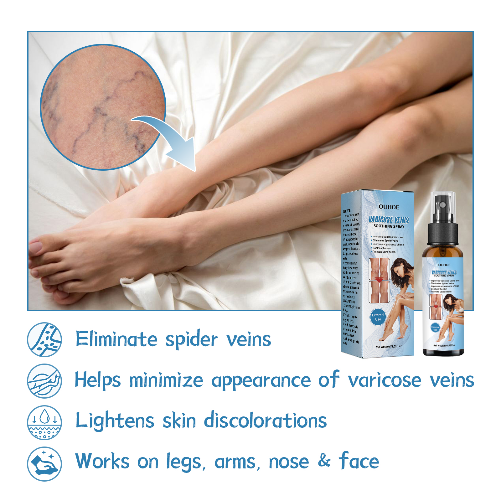 Our intravenous spray contains safflower extract, Angelica extract and Arnica extract. It can help improve blood flow in the legs produced by standing for long periods of time, wearing high heels, postpartum, or being overweight, less varicose veins appear, smoother, more attractive legs improve blood circulation, and reduce venous visibility. Its use method is very simple: first clean and dry the skin of the legs, spray on the legs by 1-2 pumps, then use the hand in a circular motion, gently massage to absorb, daily use can get better results, promote the overall blood vessel health, relieve the pain caused by leg fatigue and varicose veins, increase comfort, improve the phenomenon of varicose veins.