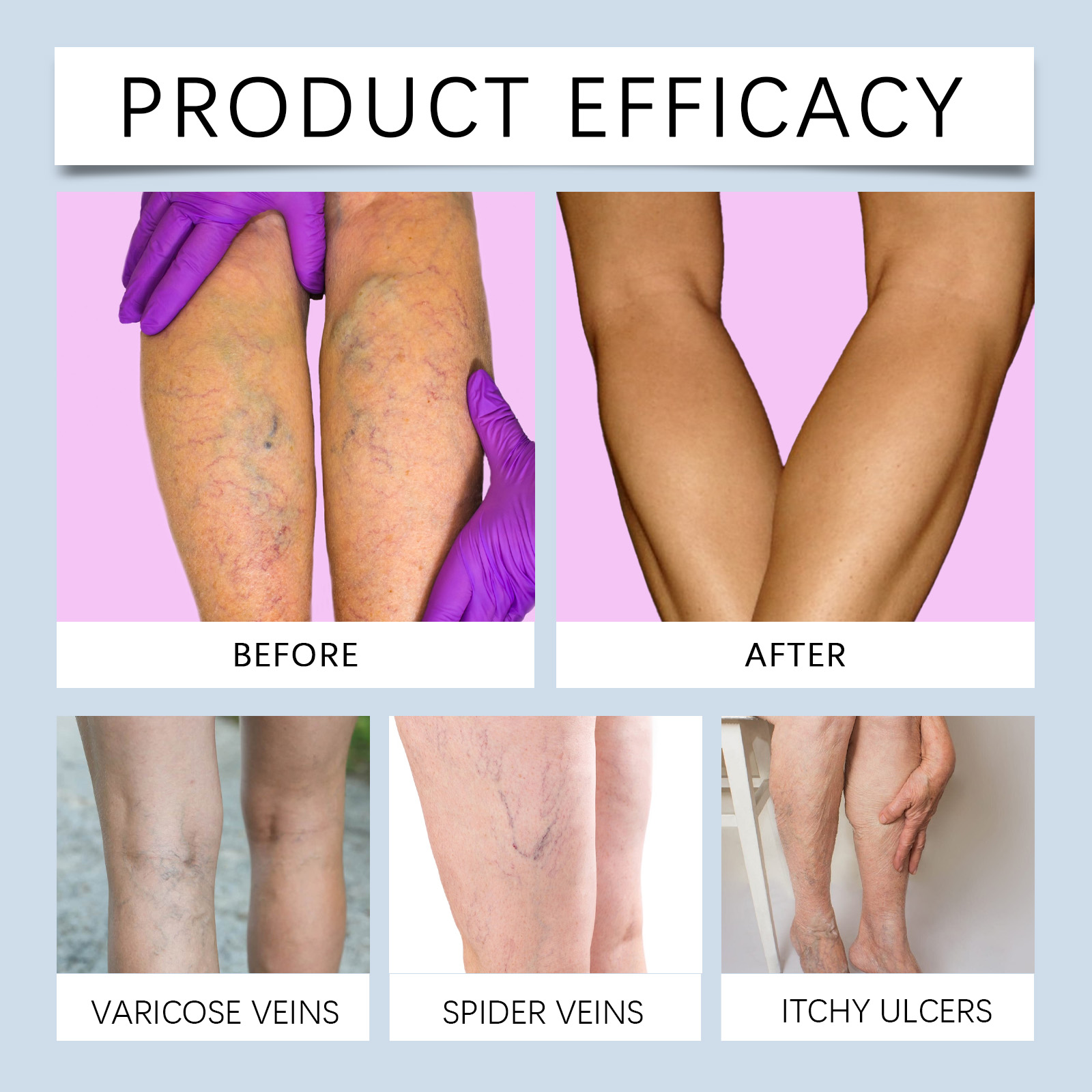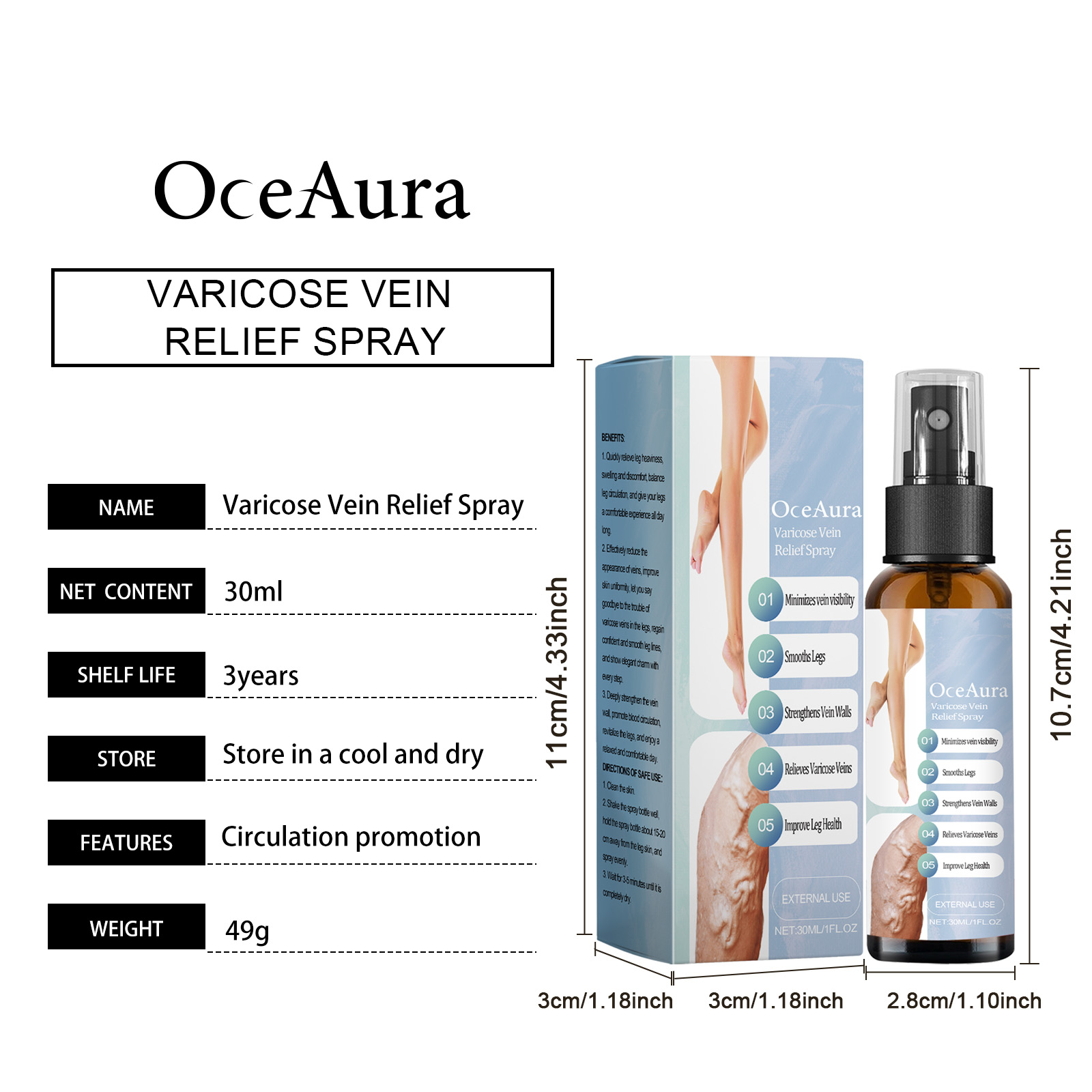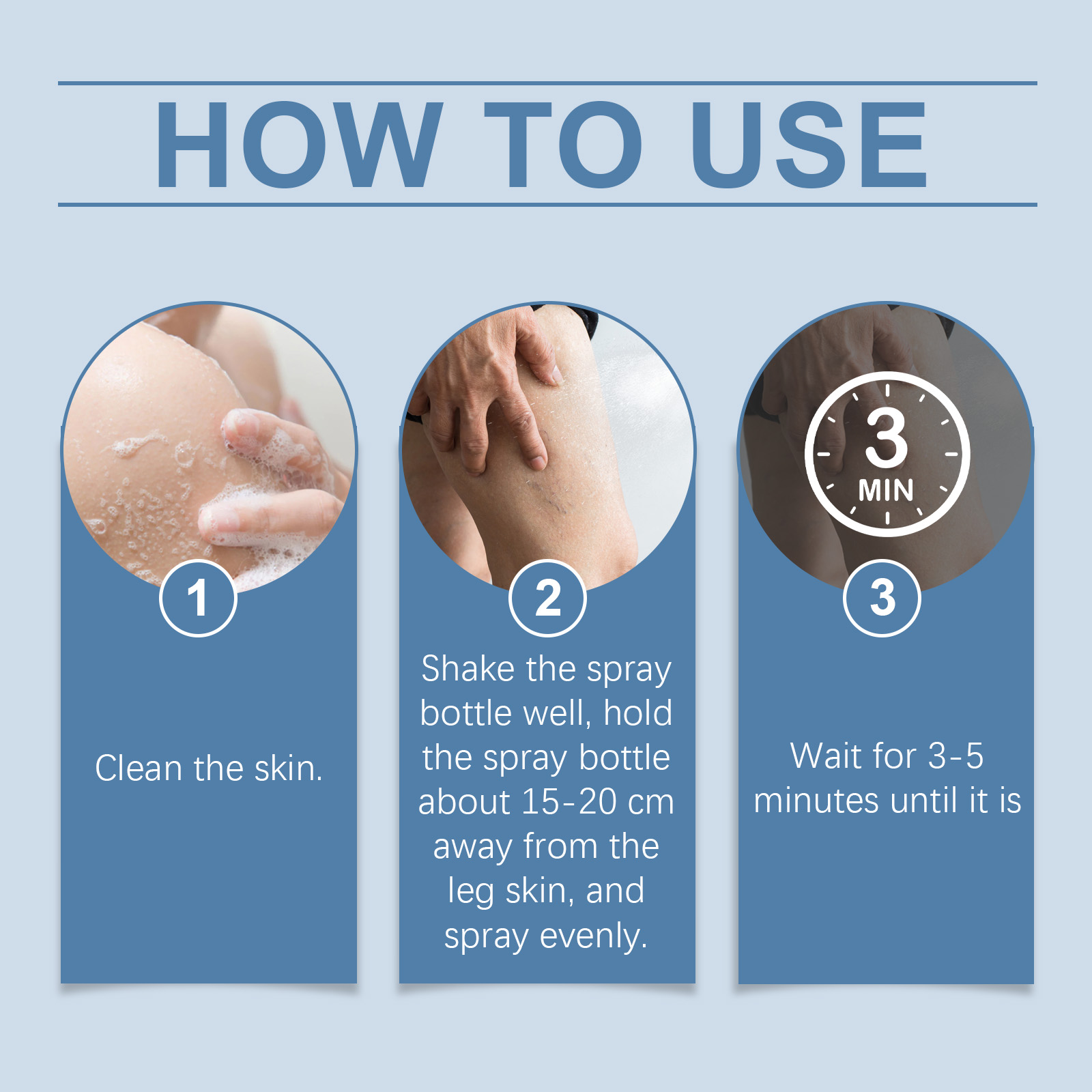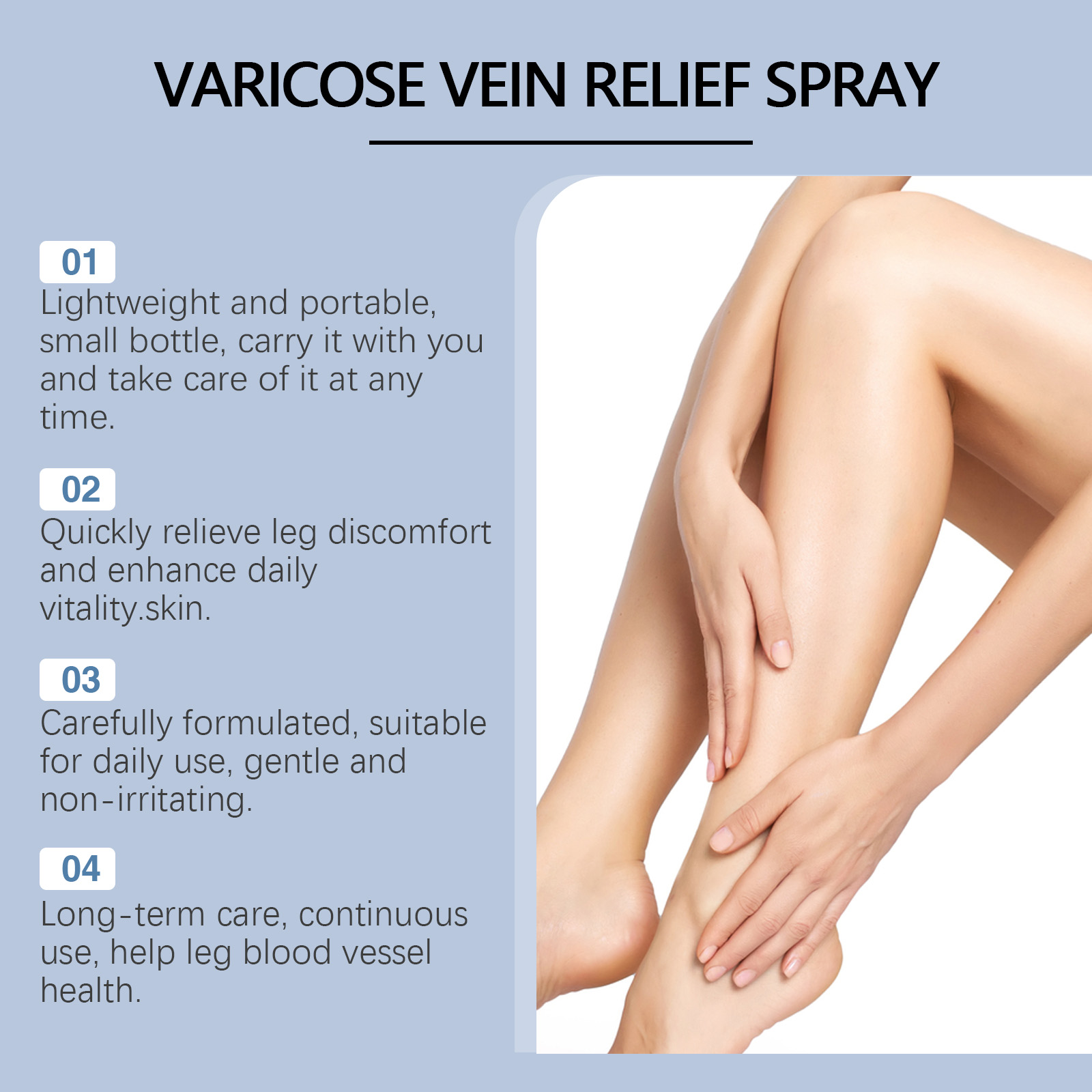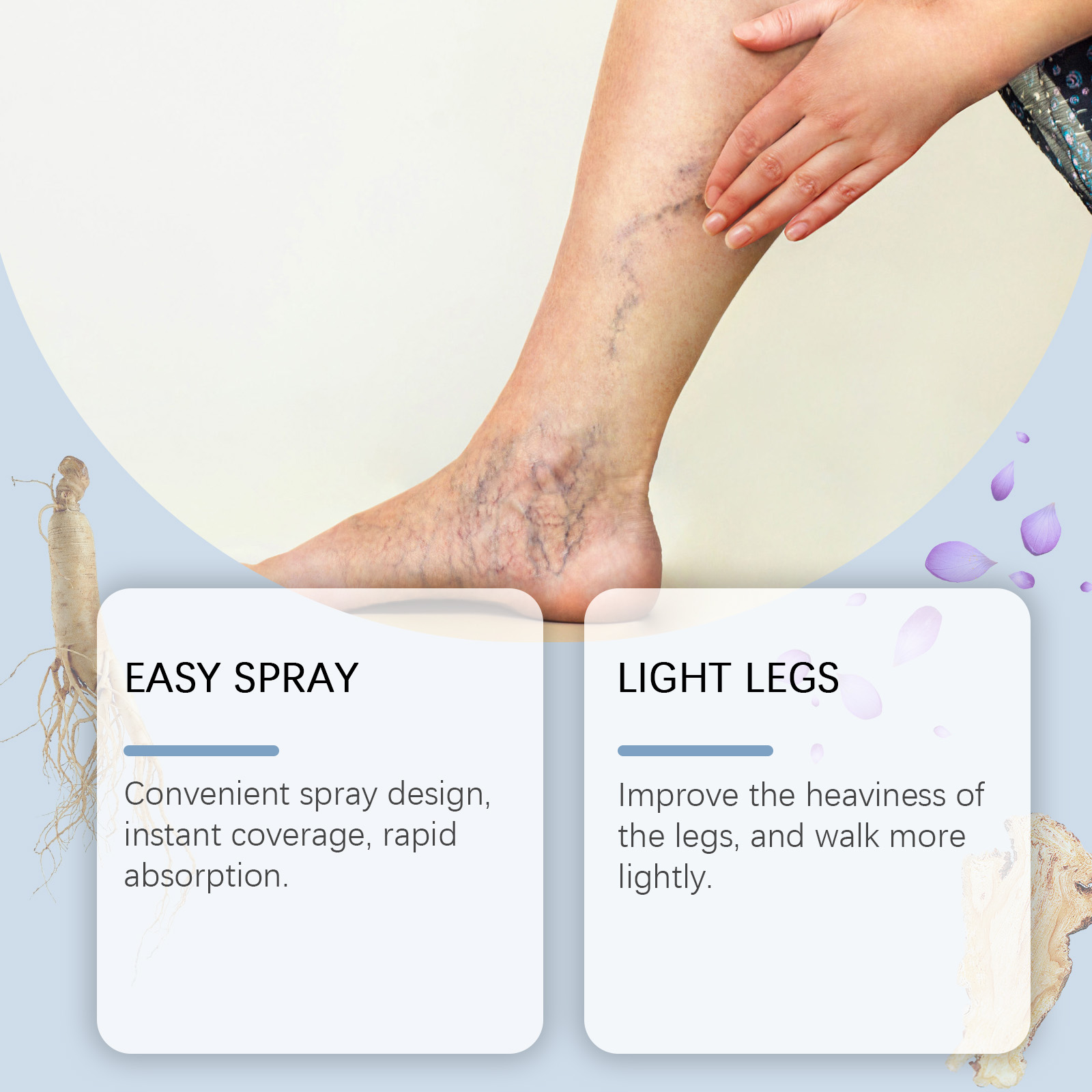 Our vein repair spray contains safflower extract, comfrey extract and ginseng extract. It can promote blood circulation in the lower extremities and restore vitality in the legs. Fresh, not greasy, perfect for any outfit. The way to use it is simple: 1. Clean the skin. 2. Shake the spray bottle, keep the spray bottle about 15-20 cm away from the leg skin, and spray evenly. 3. Wait 3-5 minutes. Convenient spray design, instant coverage, fast absorption. Improve leg weight and walk lighter.