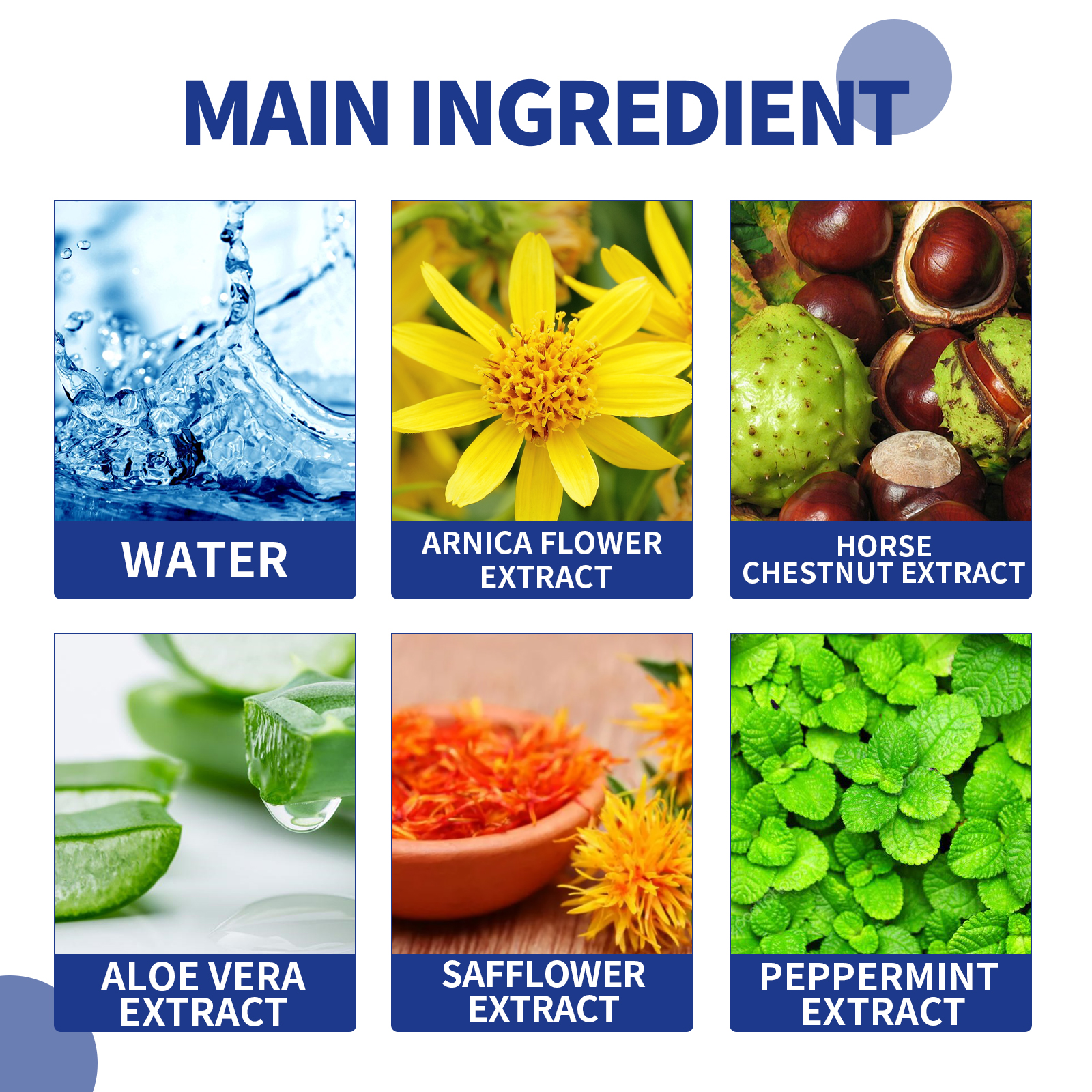 Our intravenous spray contains arnica flower extract and conker tree extract. It can effectively eliminate varicose veins, relieve itching and pain. Its use method is very simple: 1. Clean and dry the skin. 2. Press down and spray on the skin. 3. Gently massage with your hand in a circular motion for 2-3 minutes until absorbed. 4. Use daily to get better results. And it can reduce varicose veins in the legs, relieve leg swelling and stiffness, and reduce discomfort and pain.
