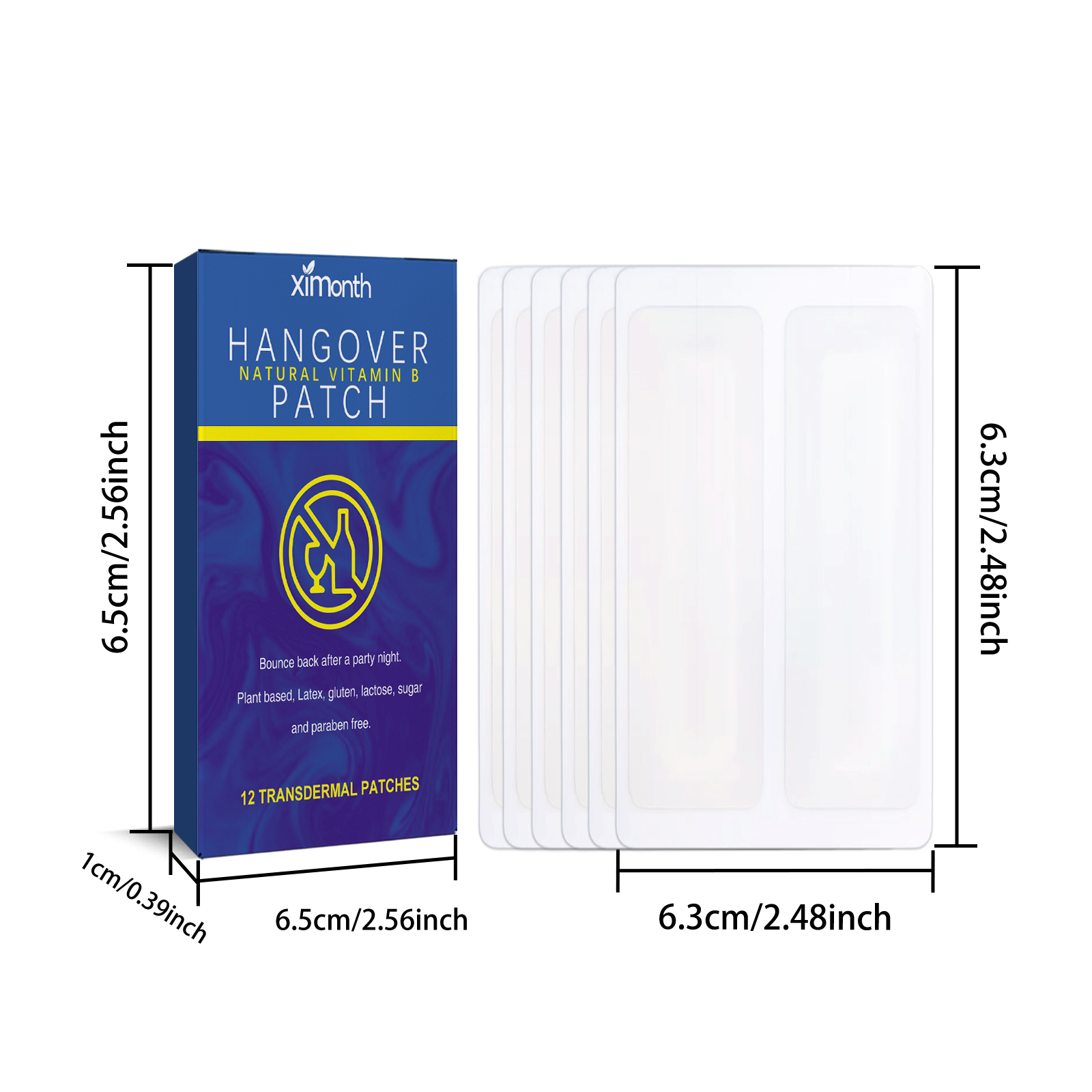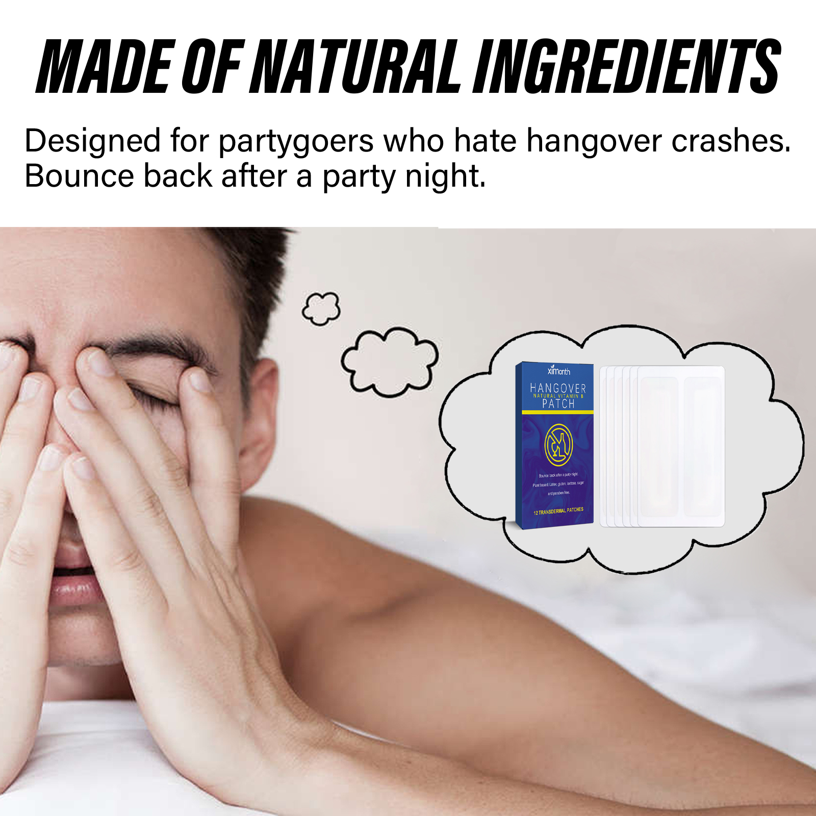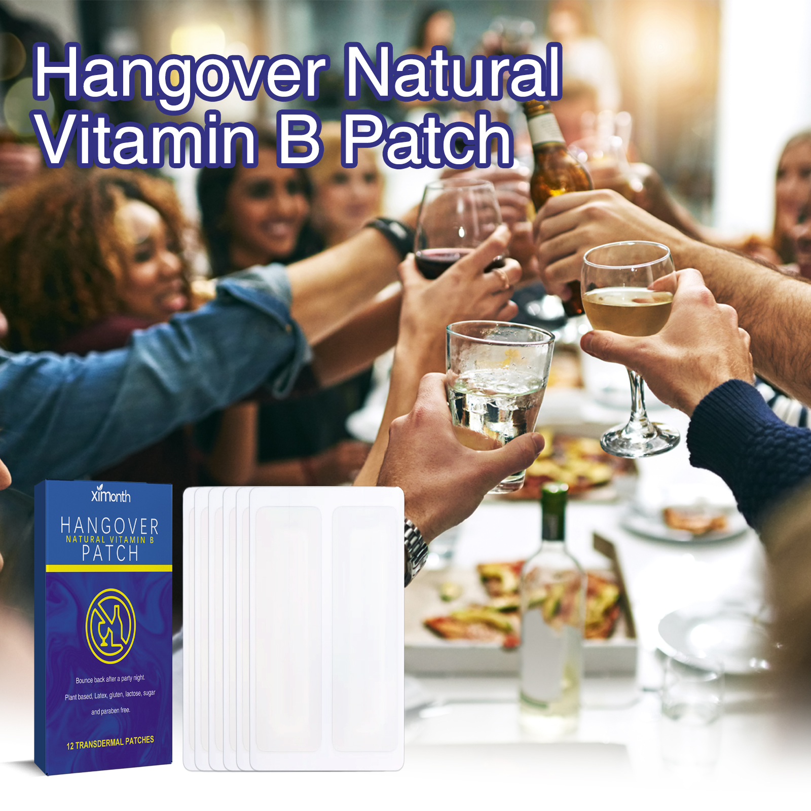 Our B Vitamin hangover cure patch contains B vitamins, beetroot extract, turmeric extract. It can relieve head discomfort and body care. Its application is simple: 1. After cleaning and drying the skin, apply it to the hairless area. The patch can be worn for up to 10 hours. 2. To remove the patch, gently soak it in warm water and peel it off. Made from natural ingredients that can help combat the effects of excessive drinking. Let you make the most of your night, say goodbye to hangovers, headaches and fatigue, and wake up feeling refreshed and energized.