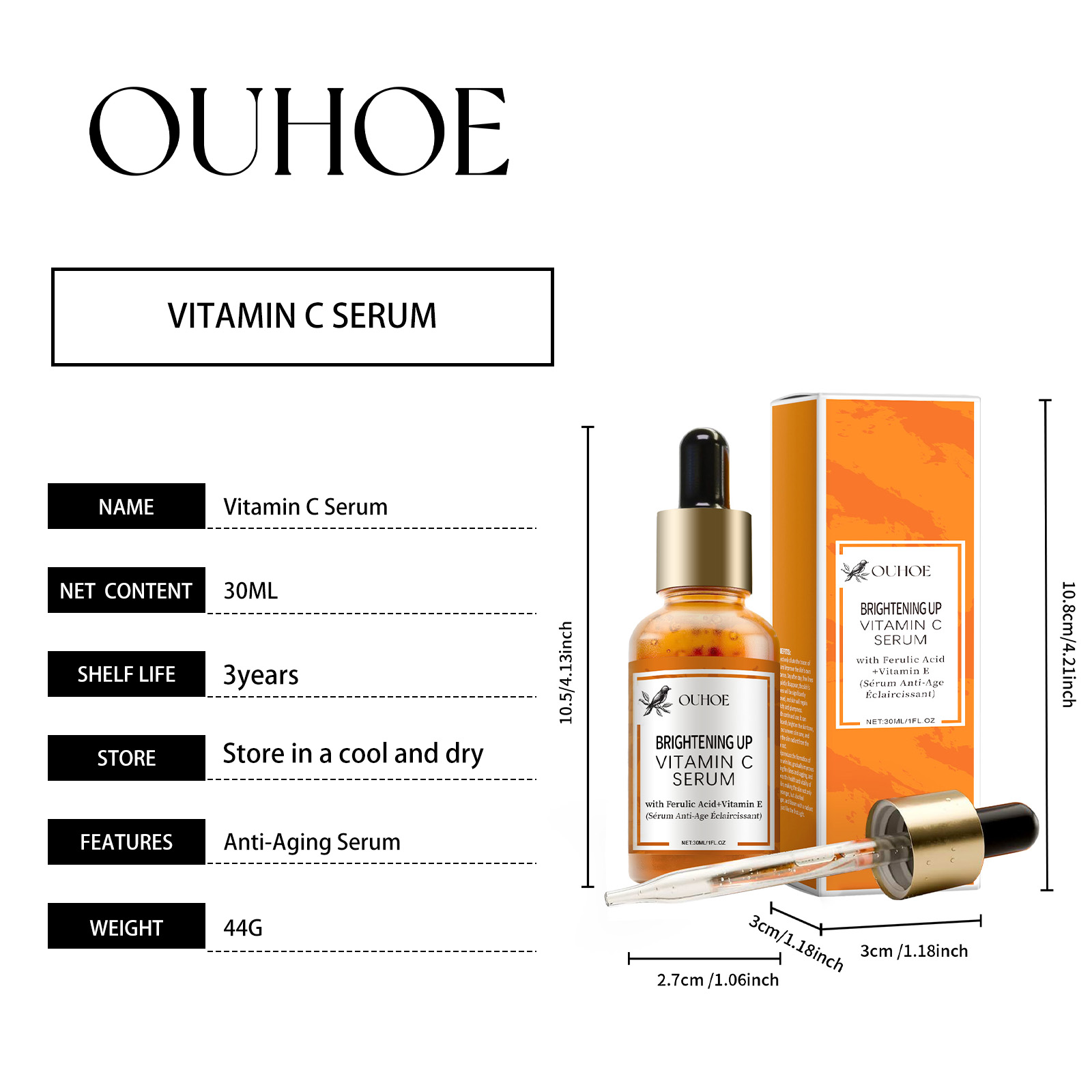 Our Vitamin C brightening serum contains glycerin and hydroxyethyl cellulose. It strengthens the skin barrier and improves defense; Promotes collagen synthesis and brightens skin. Deeply nourishing, anti-oxidant, keeps skin soft and smooth. Its use method is very simple: 1. Wash your face. 2. Apply proper amount of serum to face with eye dropper. 3. Gently massage outward from the center of the face, in a circle, until fully absorbed. Rejuvenate your skin and rejuvenate it. Improve uneven skin tone, even light.
