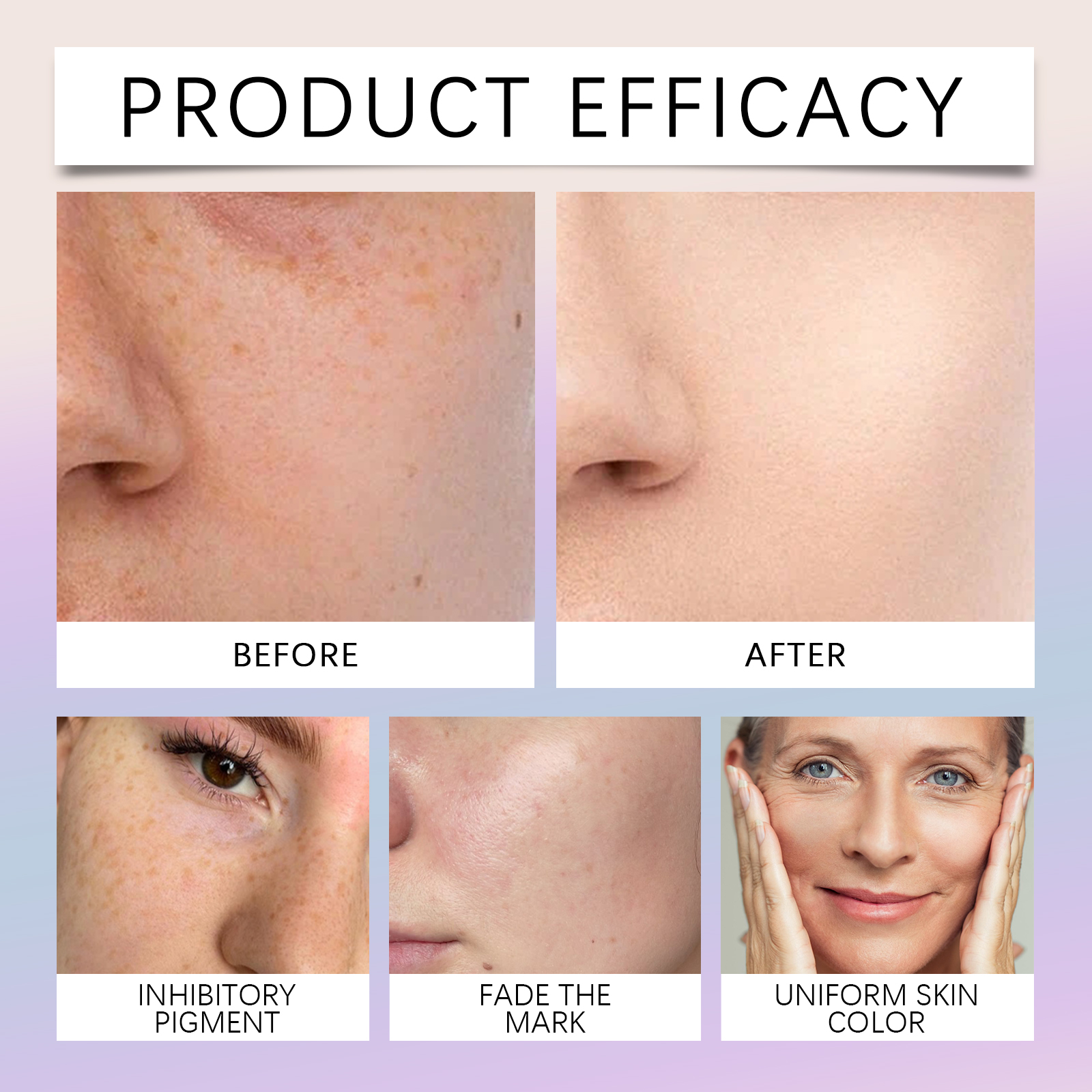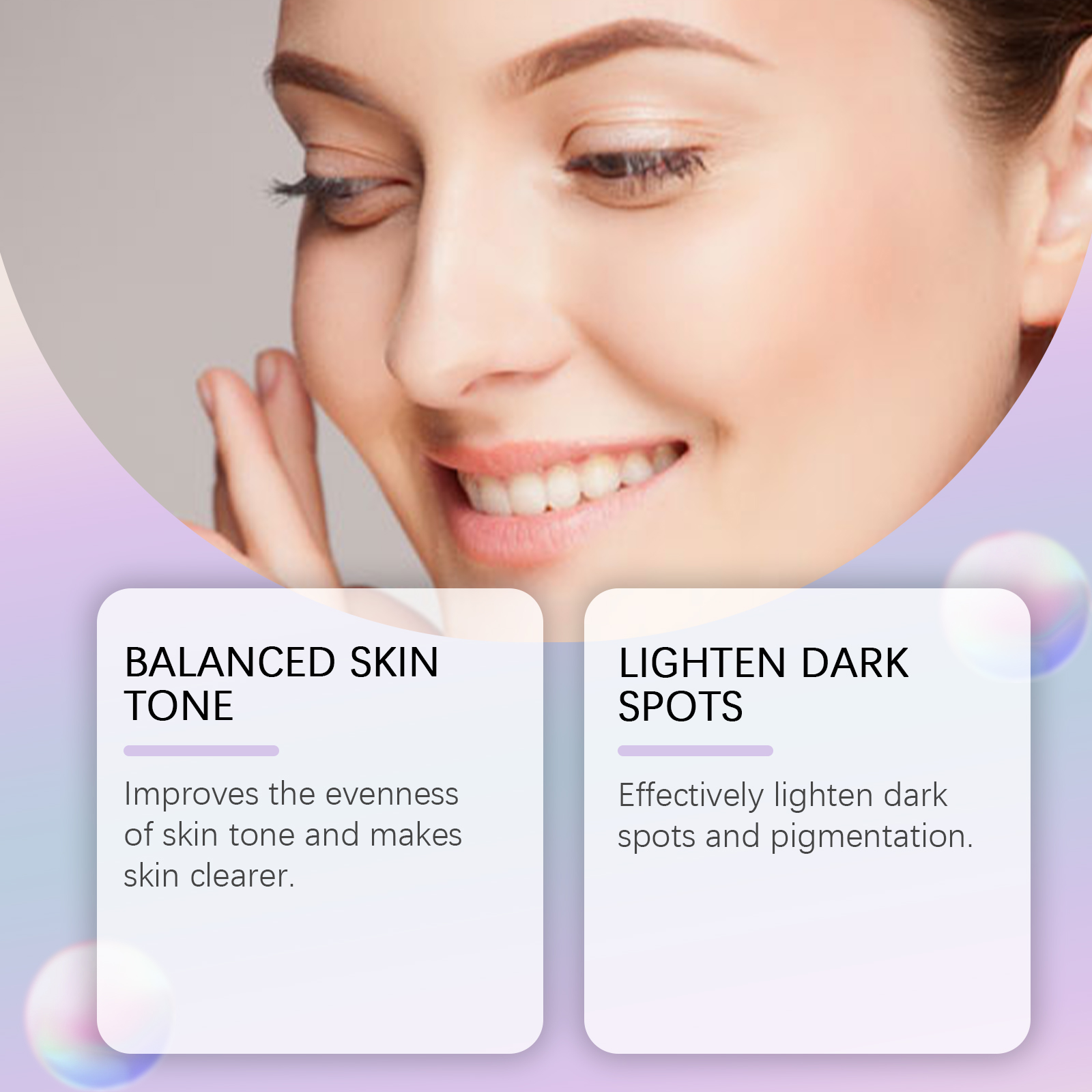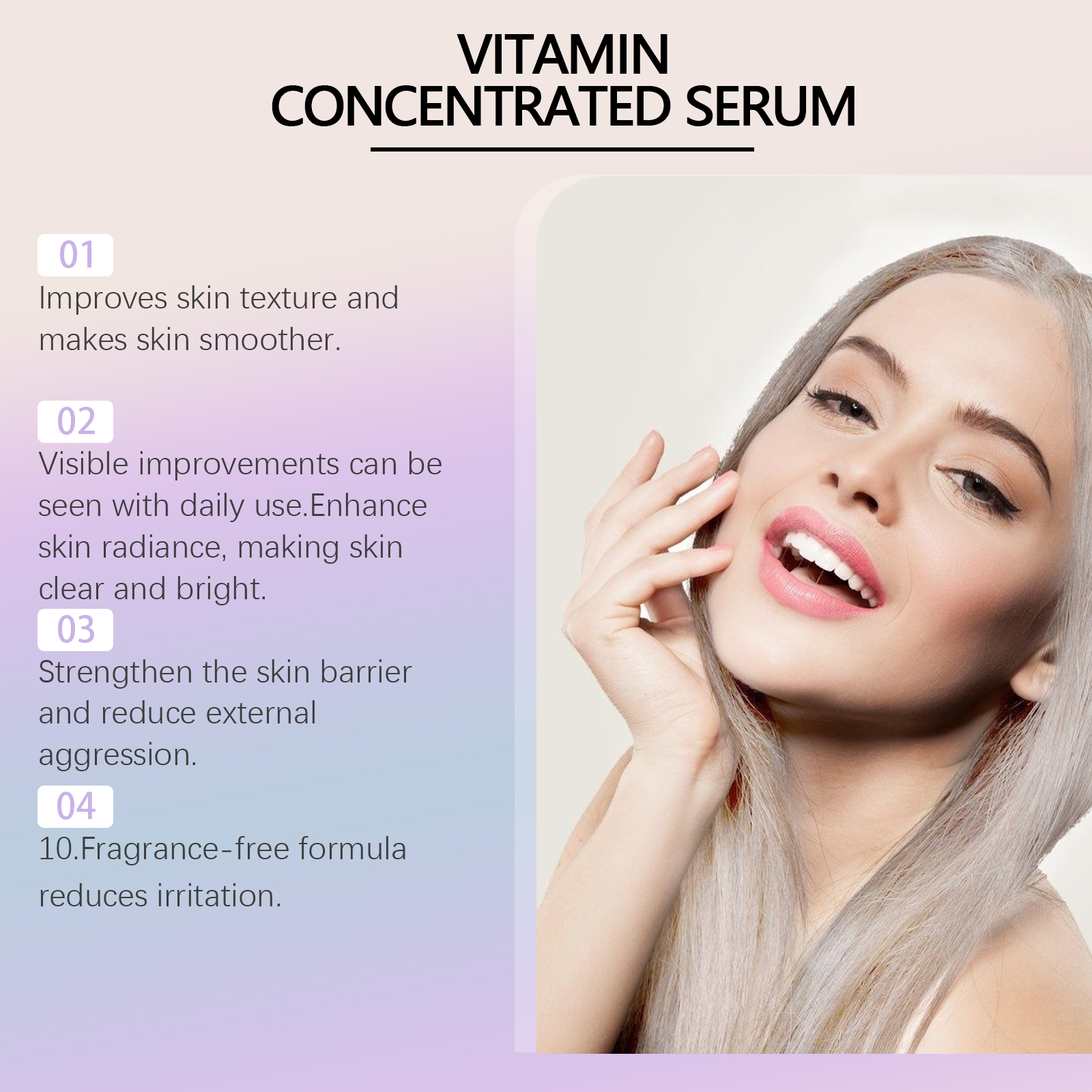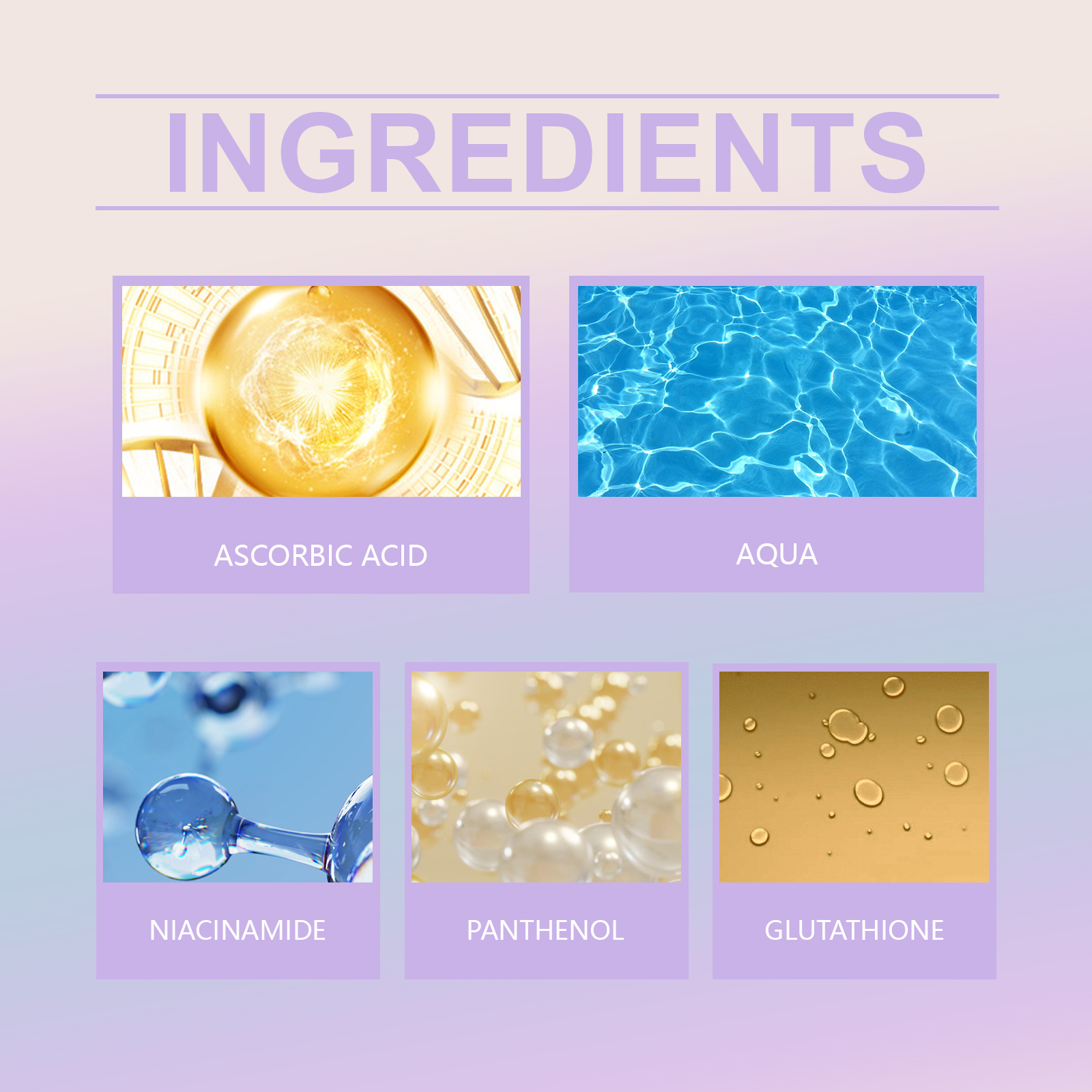 Our Vitamin Concentrated Serum contains Ascorbic Acid, Glutathione, Niacinamide. It can effectively inhibit melanin formation, lighten skin tone, make skin glow, improve pigmentation, provide gentle and effective care, help fade scar marks, restore smooth skin. Its application method is very simple: thoroughly clean the face, ensure that the skin is clean and free of residue, take an appropriate amount of serum, evenly apply on the face and neck, gently massage until completely absorbed. It can promote skin metabolism, even skin tone, make skin look clearer and brighter, mild formula, suitable for all skin types, make skin glow in comfort and beauty.