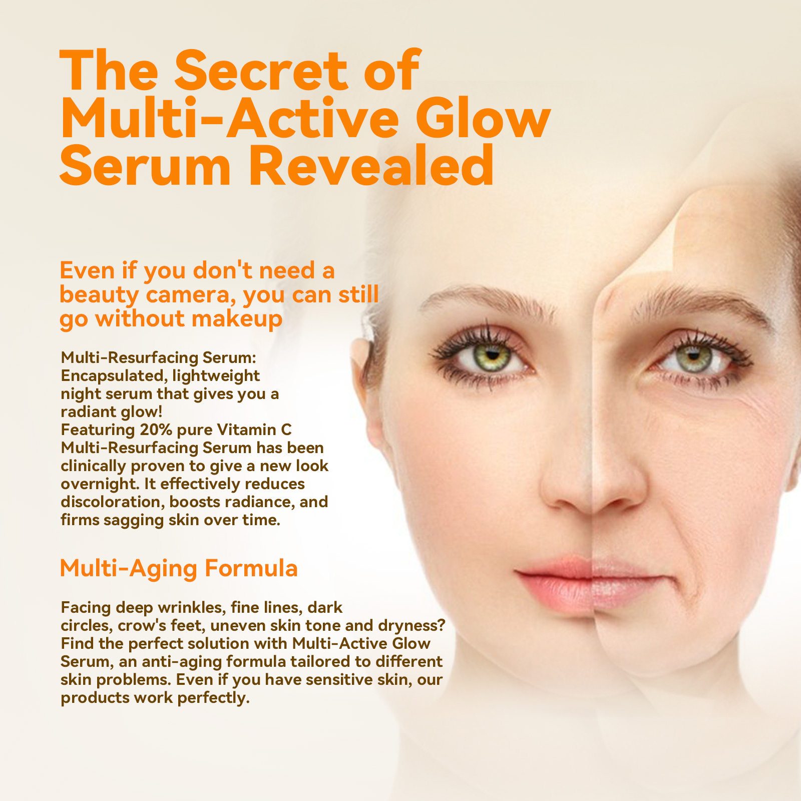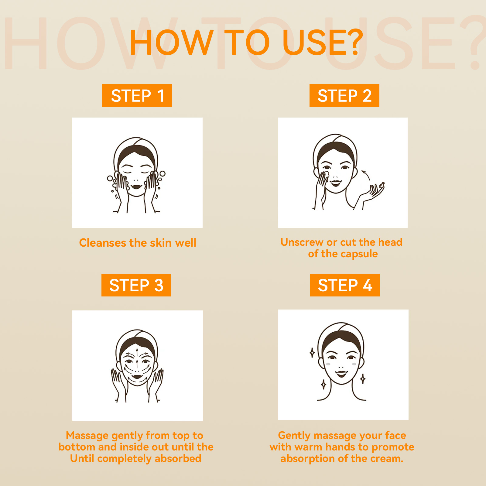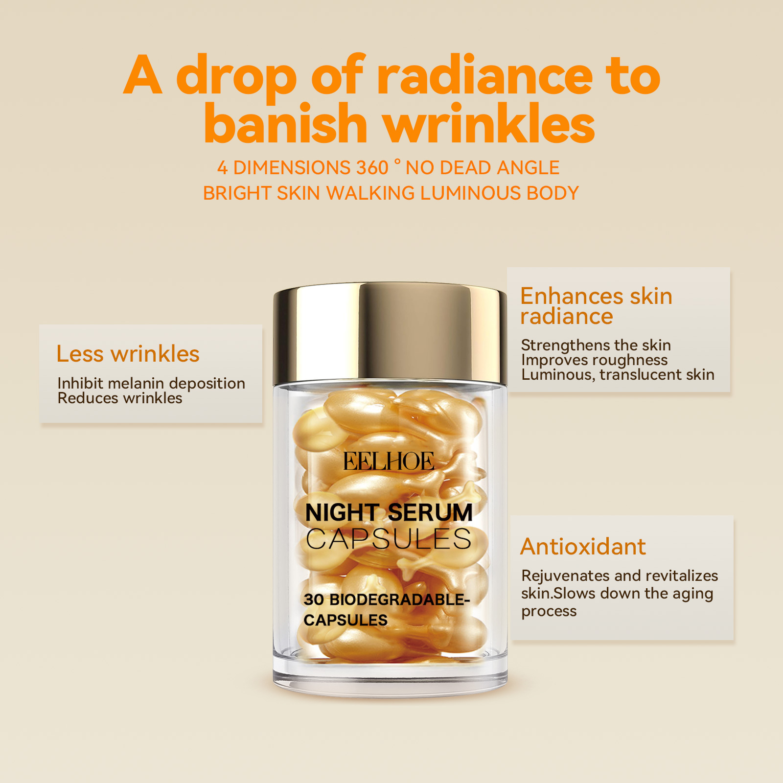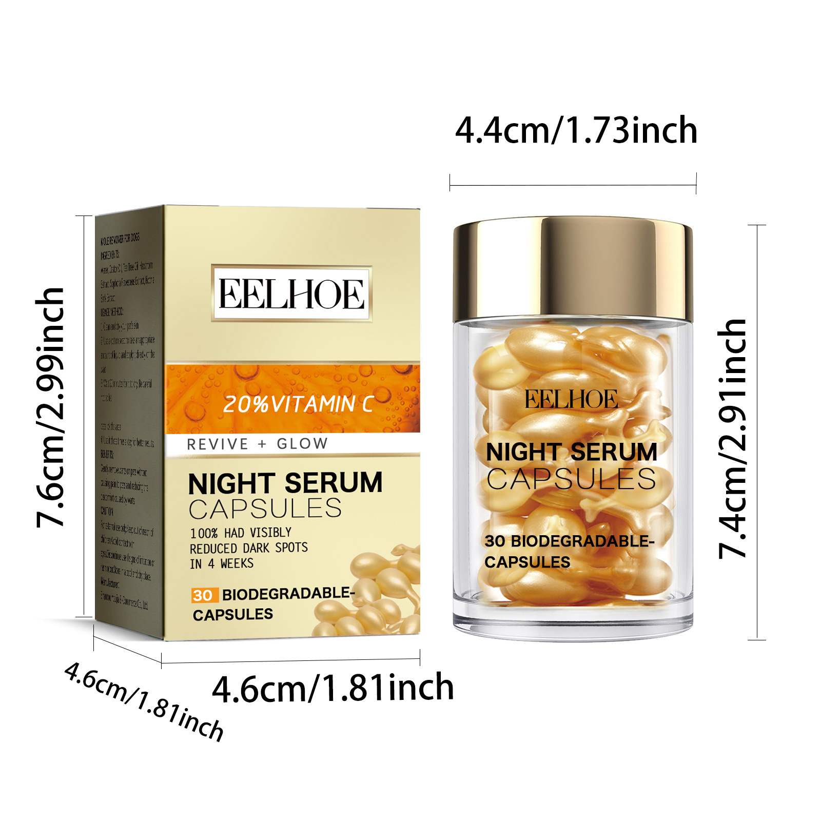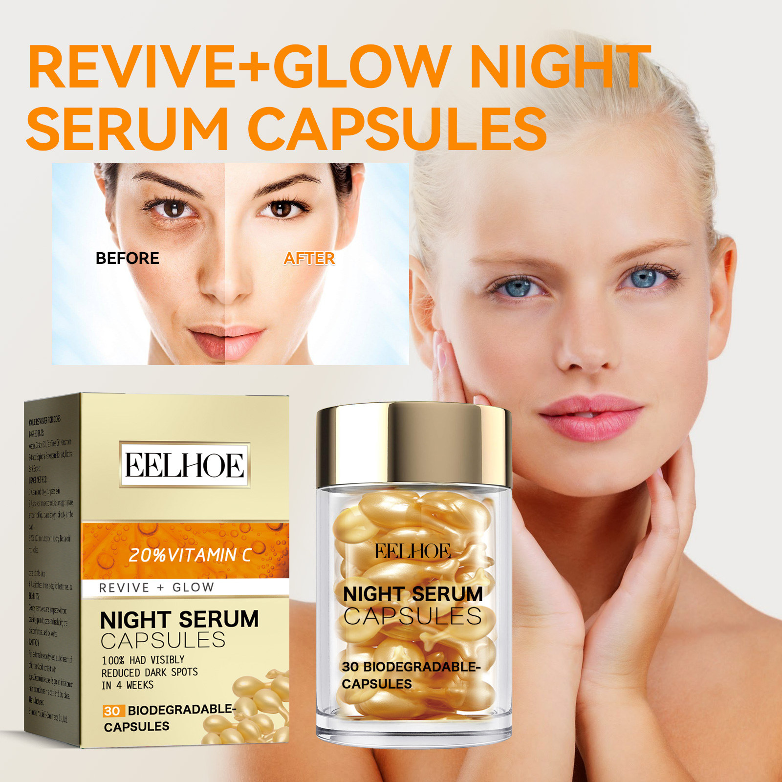 Our Vitamin C Face capsules contain vitamin C, Elemene extract, and troxrutin. It can slow down the rate of skin aging, prevent wrinkles and spots from appearing early, and achieve the effect of delaying aging. Its use method is very simple: 1. It can clean the skin well; 2. Twist or cut the head of the capsule; 3. Massage gently from top to bottom, from inside to outside, until completely absorbed; 4. Gently massage your face with warm hands to promote the absorption of the cream. It can inhibit the formation of melanin and reduce the appearance of spots and freckles; Stimulates the regeneration of skin cells and reduces the appearance of wrinkles and sagging.