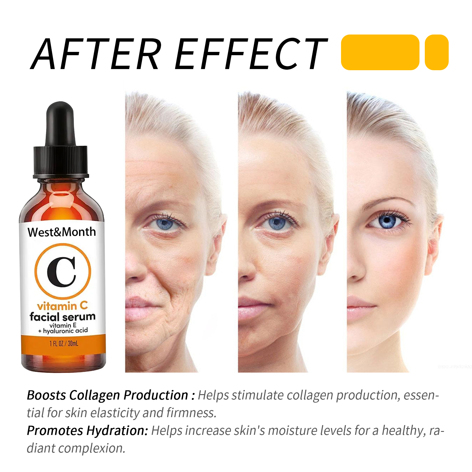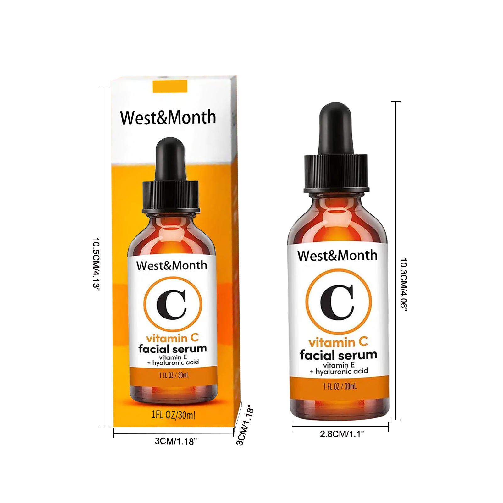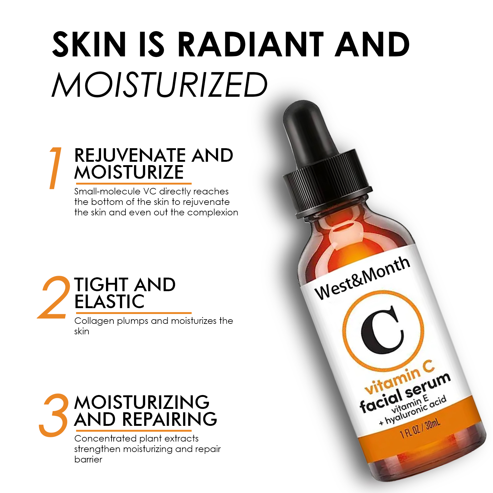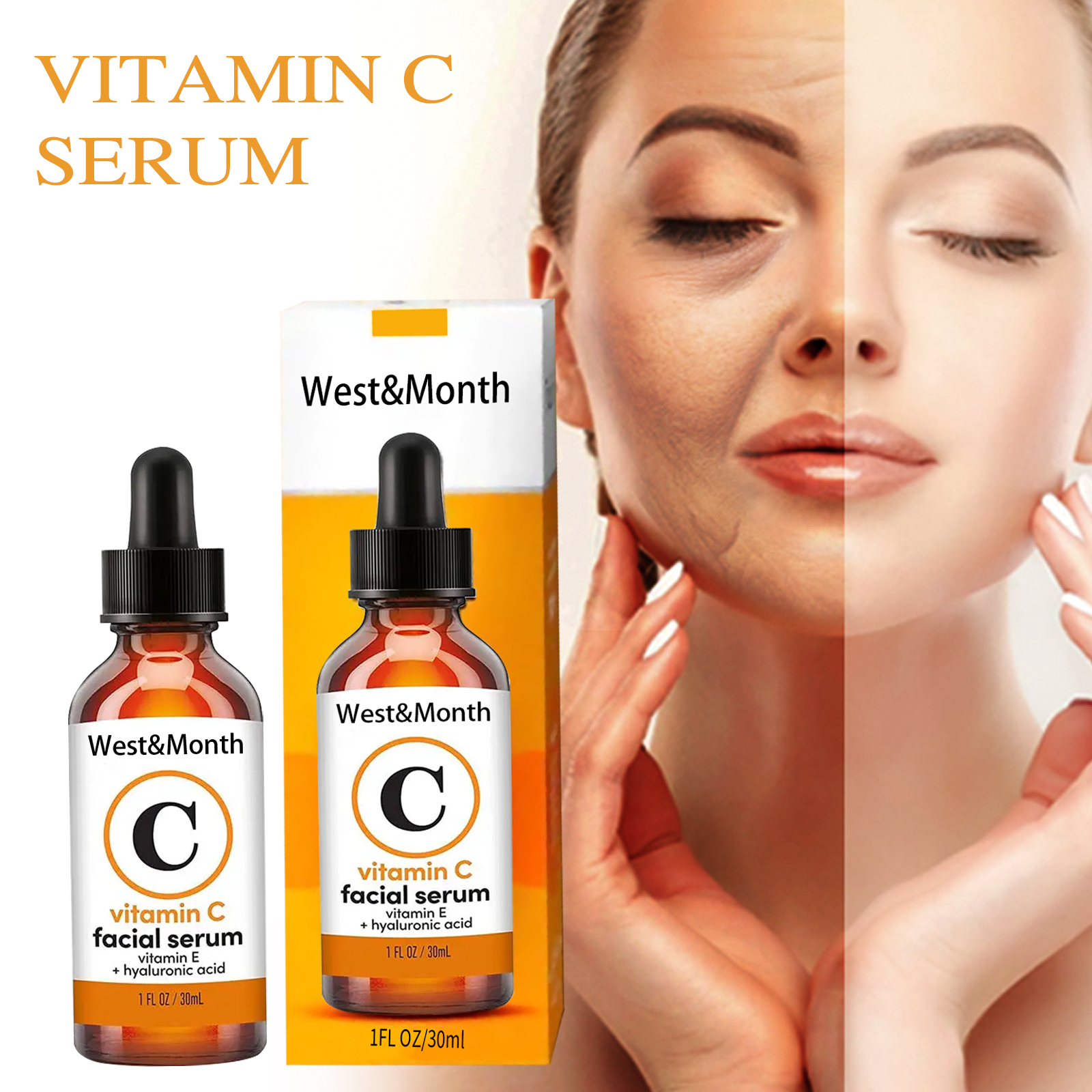 Our Vitamin C Face serum contains vitamin C, hyaluronic acid, panthenol. It rejuvenates and moisturizes, leaving skin firm and elastic for a moisturizing repair. Its use is simple: wash your face, apply lotion, then gently massage an appropriate amount into your fingertips, if needed, lock in the essence with moisturizer, twice a day, usually three bottles for a course of treatment. And can reduce dark spots, uneven pigmentation, wrinkles.