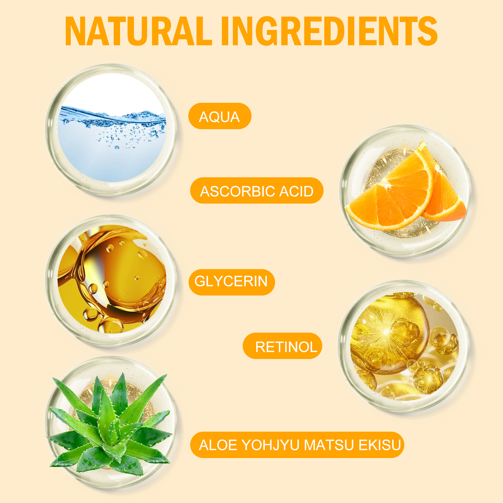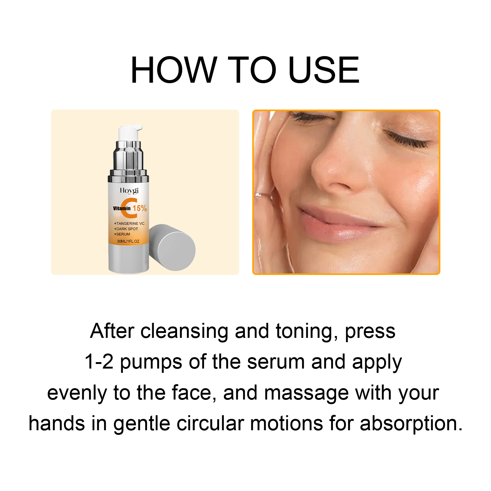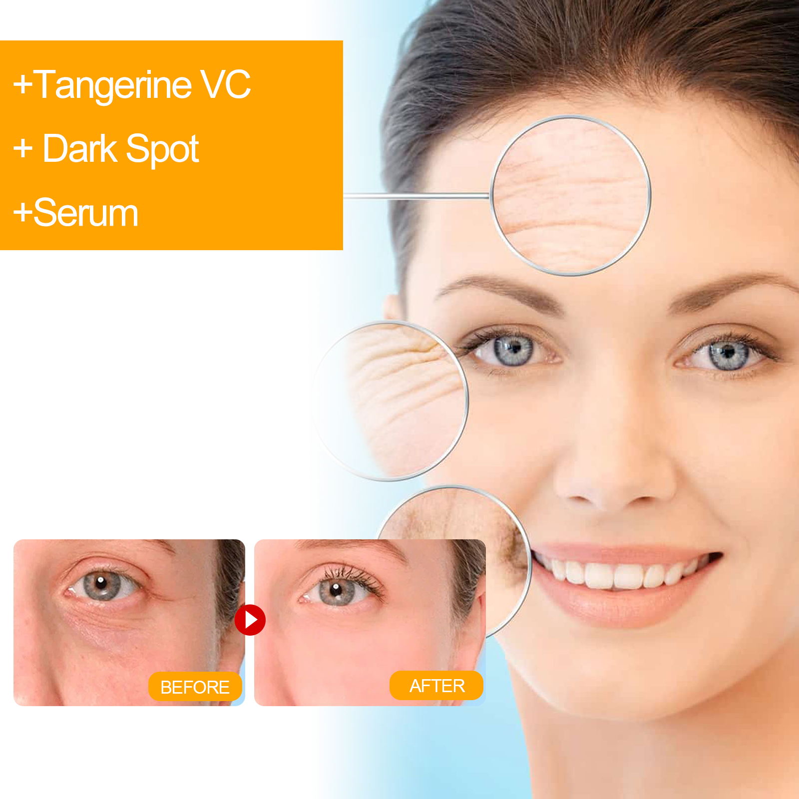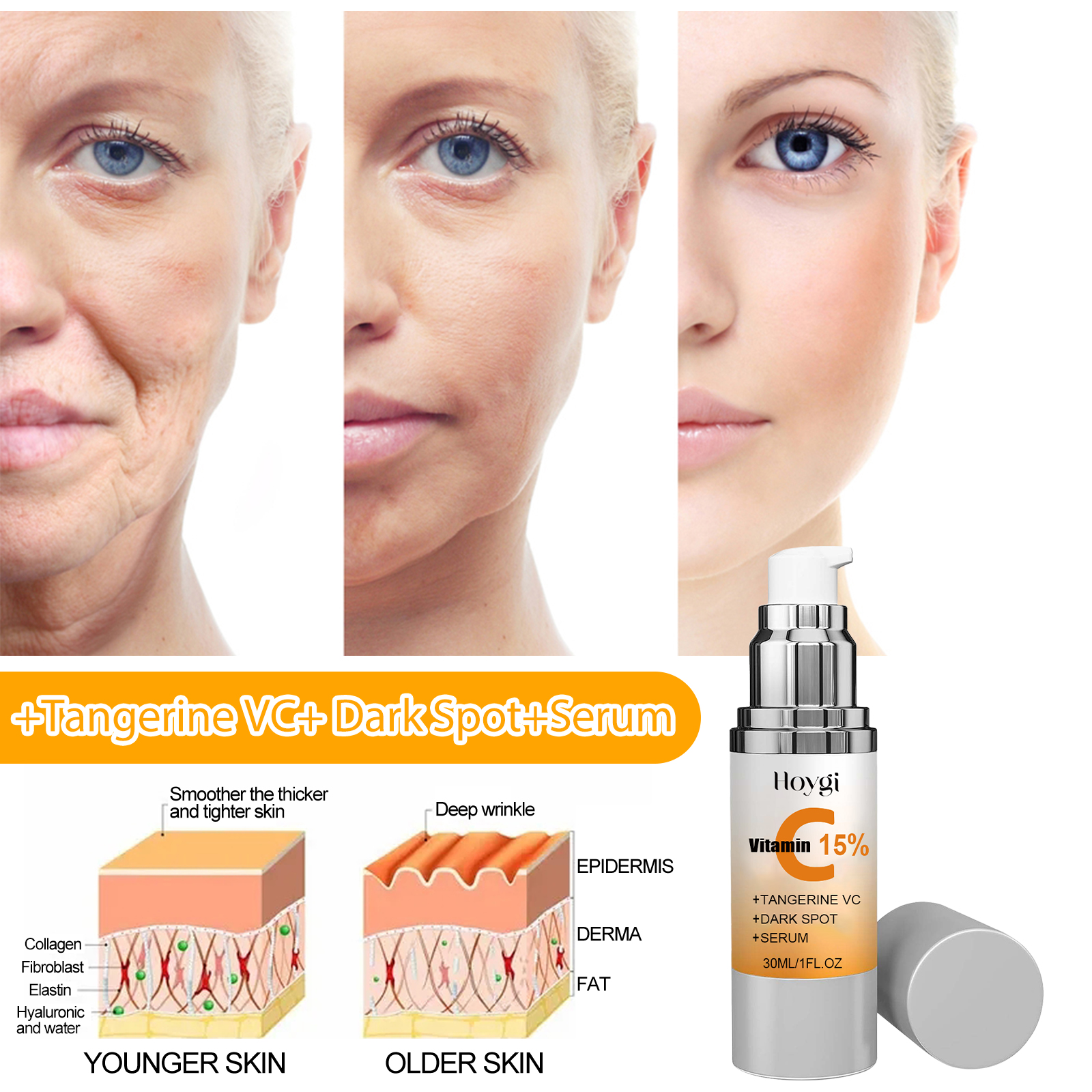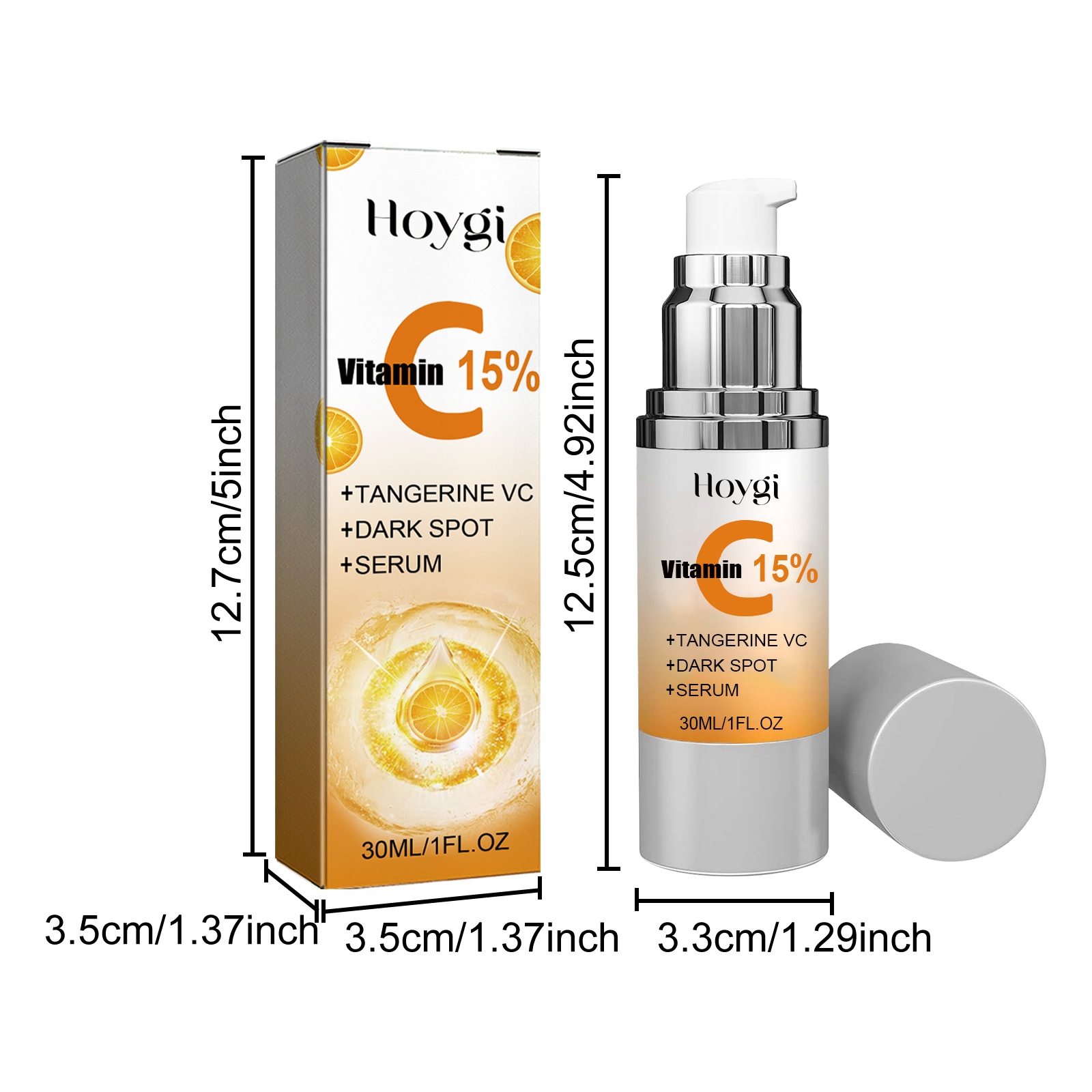 Our Tangerine VC + Dark Spot + Serum contains Glycerin, Ascorbic Acid, Retinol. It can improve the fine lines caused by dry skin, improve the balance of water and oil in the skin, gently soothe the skin, moisturize and nourish the skin, build the skin protective film, and improve the skin elasticity. Its use method is very simple: after cleansing and toning, press 1-2 pump serum evenly on the face, and gently massage with your hand to absorb it. It can inhibit and reduce the production of melanin, prevent the formation of new spots, help skin moisturize and whiten, and make skin smoother.